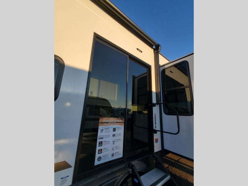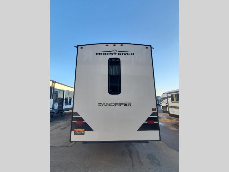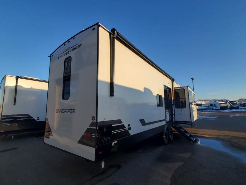 With each Sandpiper Destination Trailer by Forest River you will enjoy many luxurious features, such as crown molding over the kitchen cabinets, solid surface kitchen countertops, a memory foam mattress, plus so much more. The extra large picture windows throughout let natural light in and provide beautiful outdoor views, and each model includes three or more slides for added interior space. You'll find many exterior conveniences, like the porch light with an interior switch, the rain gutters with extra long drip spouts to prevent black streaking, and an electric awning with LED light strip, plus more! You will stay comfortable year around with dual 15,000 A/C units plus each model is constructed with an Underbelly Armor for better protection and insulation!