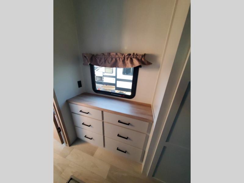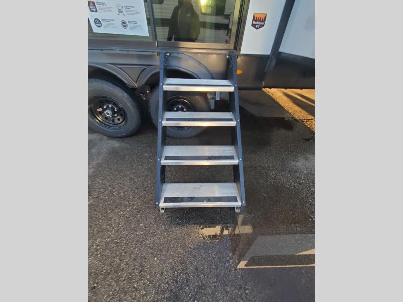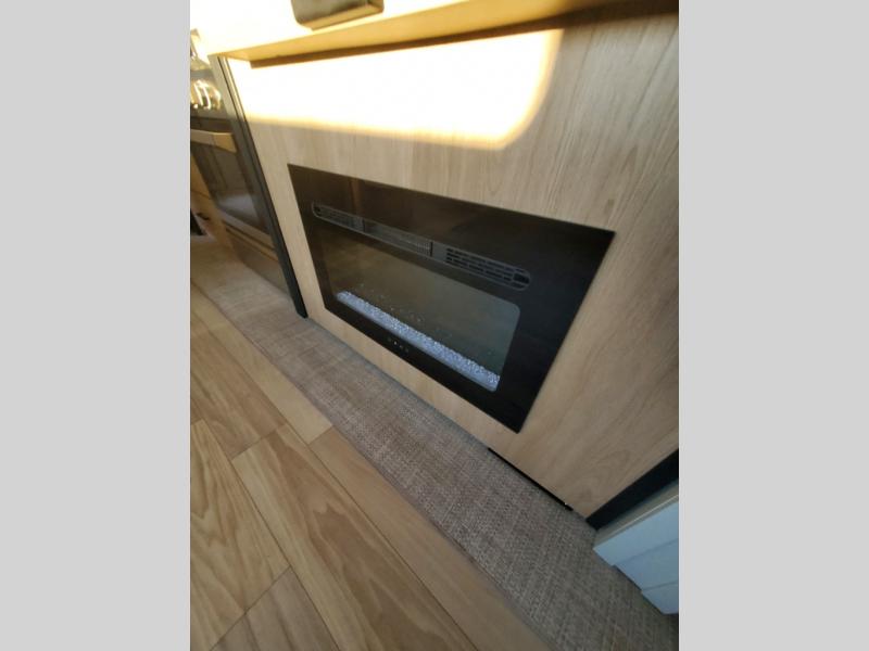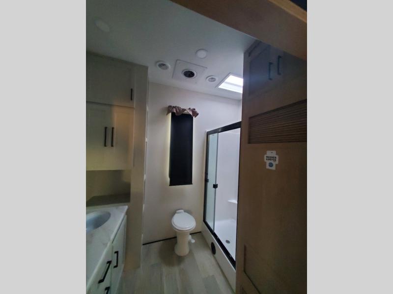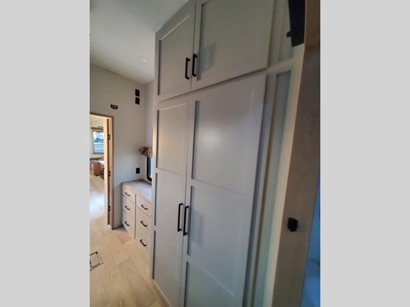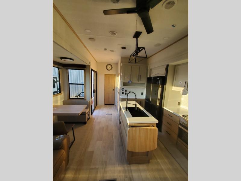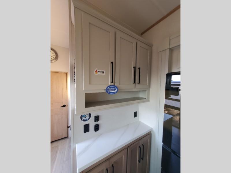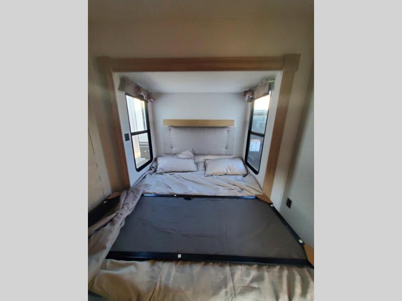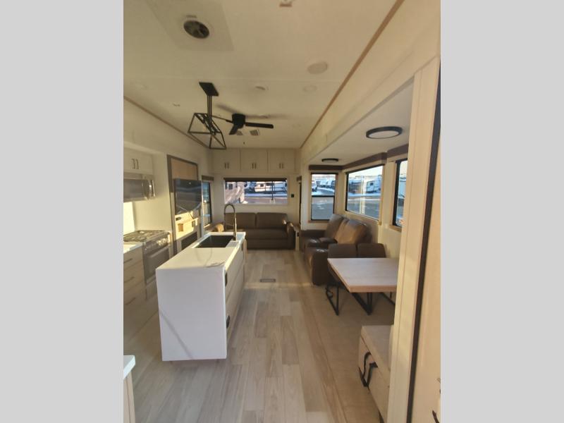 This incredible destination trailer has everything you need to live life to the fullest. Imagine retreating to a peaceful rear bedroom, complete with a king bed slide, spacious wardrobe, plus a closet with washer and dryer prep. Unwind and pamper yourself in style in the incredible full bathroom, featuring a linen closet, medicine cabinets, and a fiberglass shower with a seat. The living room is the heart of the home, boasting a comfortable sectional sofa, ottoman, and entertainment center perfect for gathering with family or friends and creating unforgettable memories. The loft is a cozy retreat for kids or guests, featuring two bunk mats, and a dual wardrobe/bookcases for their things. The front kitchen has a 19 cu. ft. refrigerator, overhead cabinet, microwave, three-burner cooktop, and free-standing dinette with a waterfall edge, and the pantry provides ample storage for all your favorite foods. Finally, step outside and enjoy the shade and protection of the two awnings and the two entry and two exit doors will make it easy to come and go.