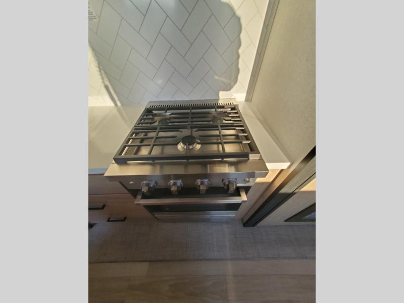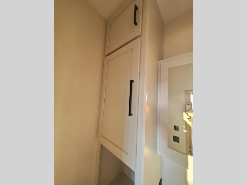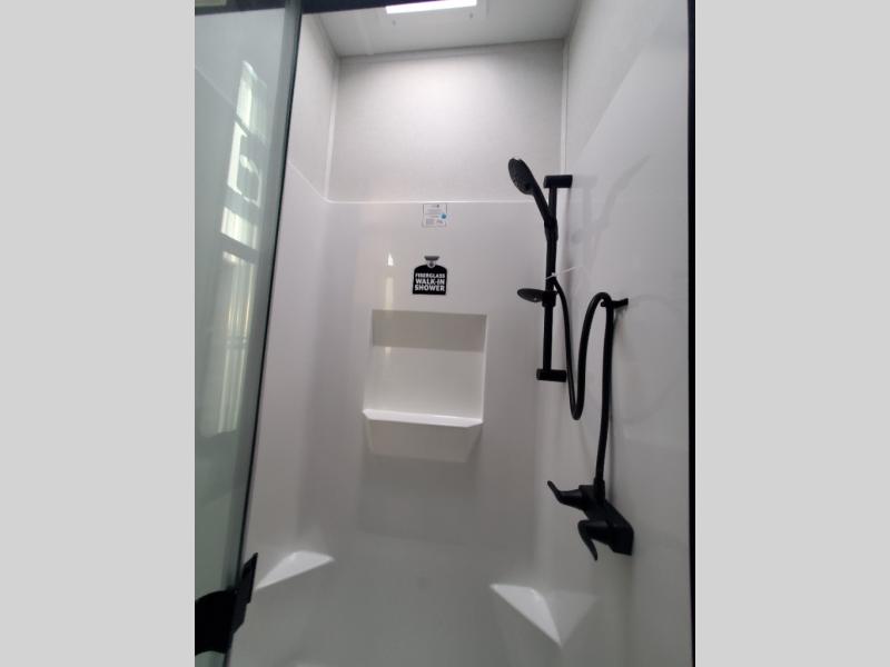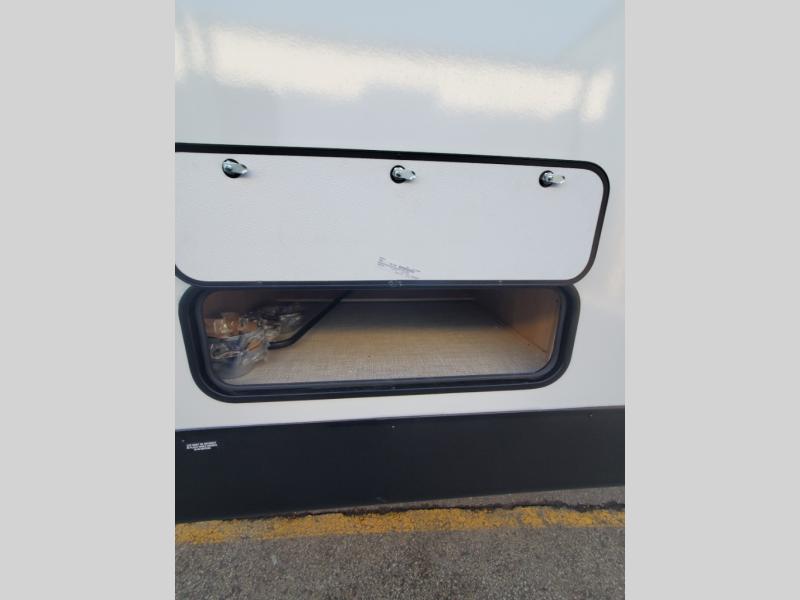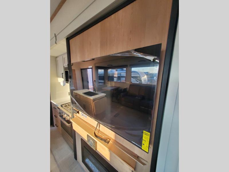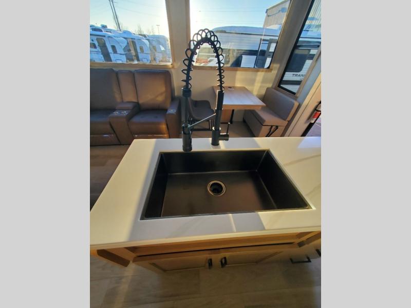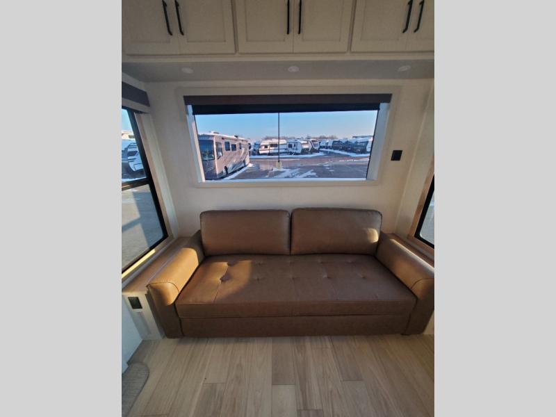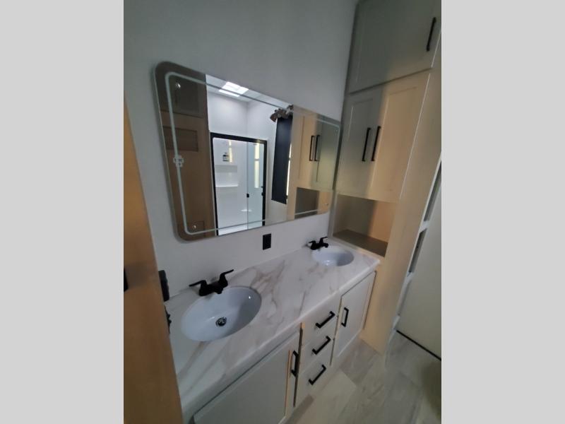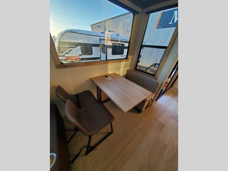 This incredible destination trailer has everything you need to live life to the fullest. Imagine retreating to a peaceful rear bedroom, complete with a king bed slide, spacious wardrobe, plus a closet with washer and dryer prep. Unwind and pamper yourself in style in the incredible full bathroom, featuring a linen closet, medicine cabinets, and a fiberglass shower with a seat. The living room is the heart of the home, boasting a comfortable sectional sofa, ottoman, and entertainment center perfect for gathering with family or friends and creating unforgettable memories. The loft is a cozy retreat for kids or guests, featuring two bunk mats, and a dual wardrobe/bookcases for their things. The front kitchen has a 19 cu. ft. refrigerator, overhead cabinet, microwave, three-burner cooktop, and free-standing dinette with a waterfall edge, and the pantry provides ample storage for all your favorite foods. Finally, step outside and enjoy the shade and protection of the two awnings and the two entry and two exit doors will make it easy to come and go.