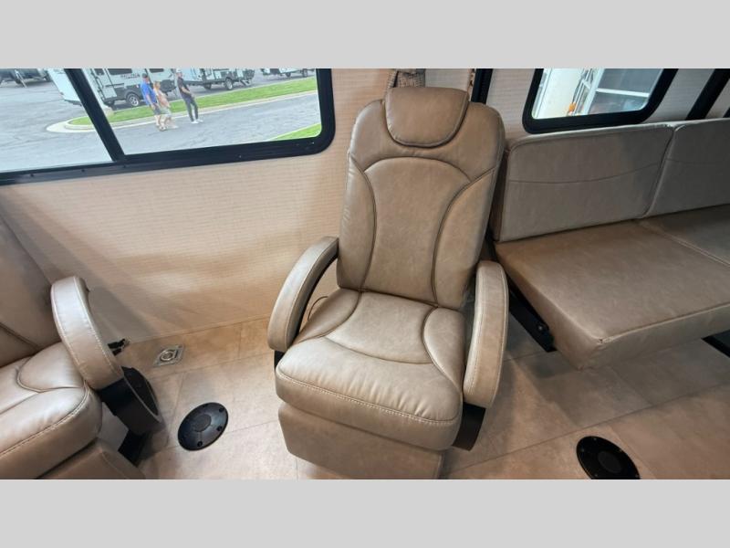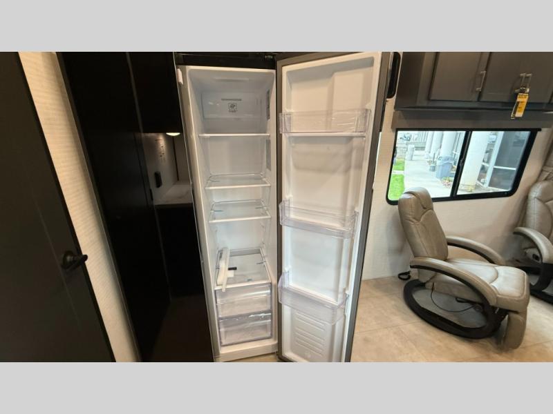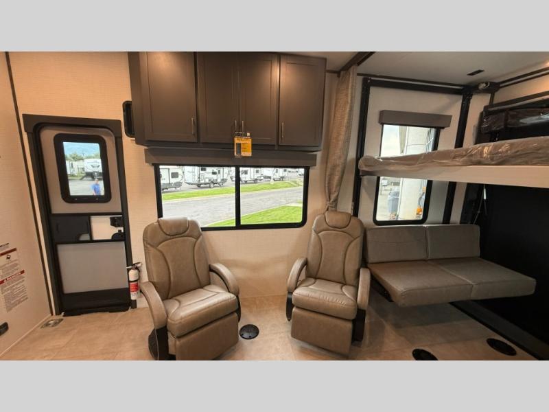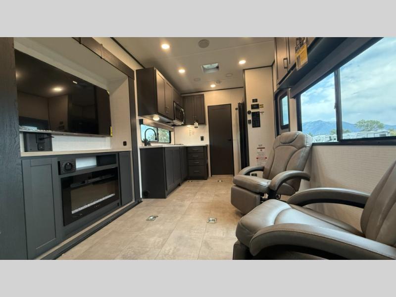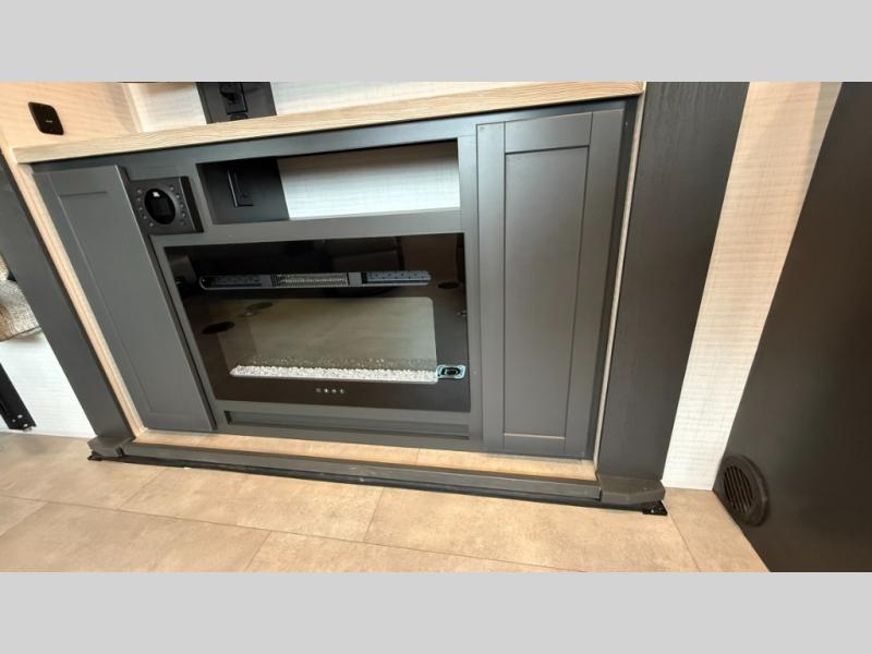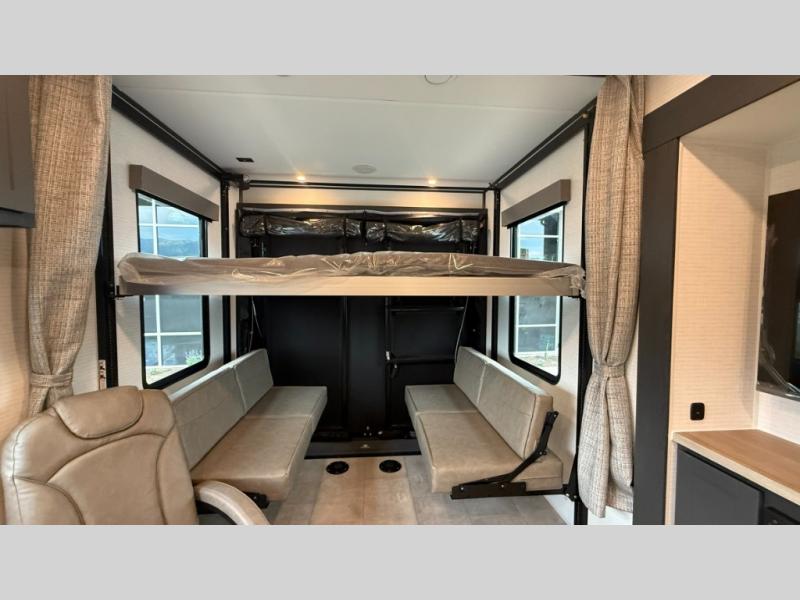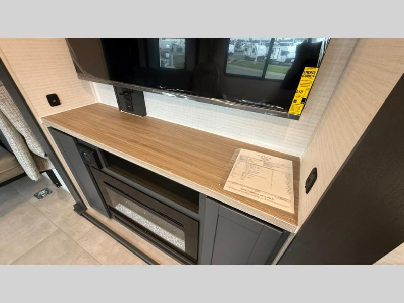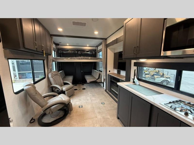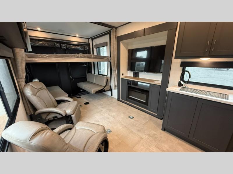 Are you looking for a travel trailer that can haul your favorite riding toys and still provide at-home comforts? This toy hauler is the one with 15' 1" total garage space, a front master bedroom with a king bed and dresser slide out, and a walk-through bath! The main living area also includes many comforts, like the dual lounge chairs, entertainment center slide out with a fireplace, and full kitchen. Your guests will find their beds on the electric pass-thru dinette or the drop-down electric bed!