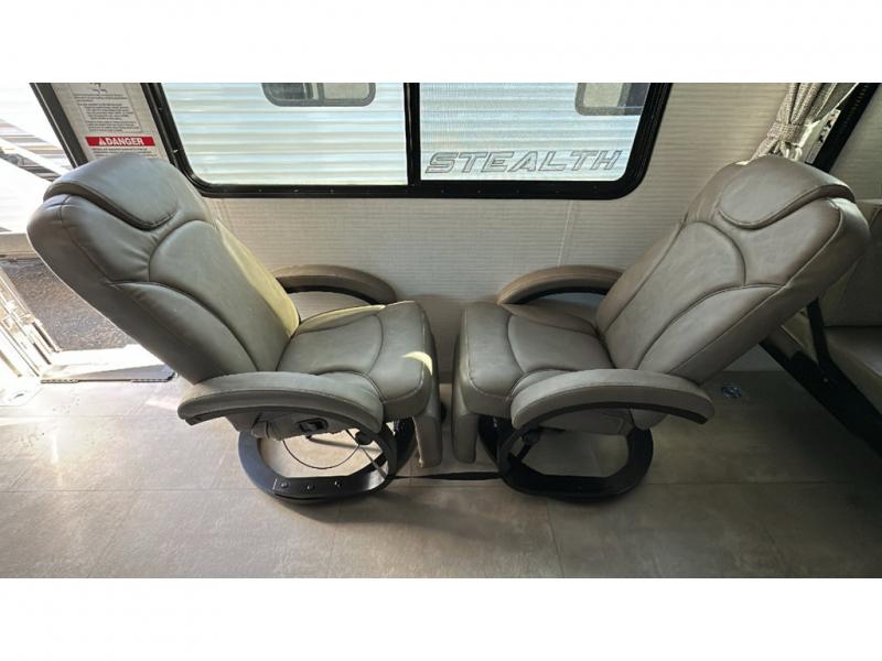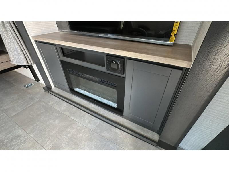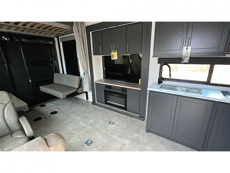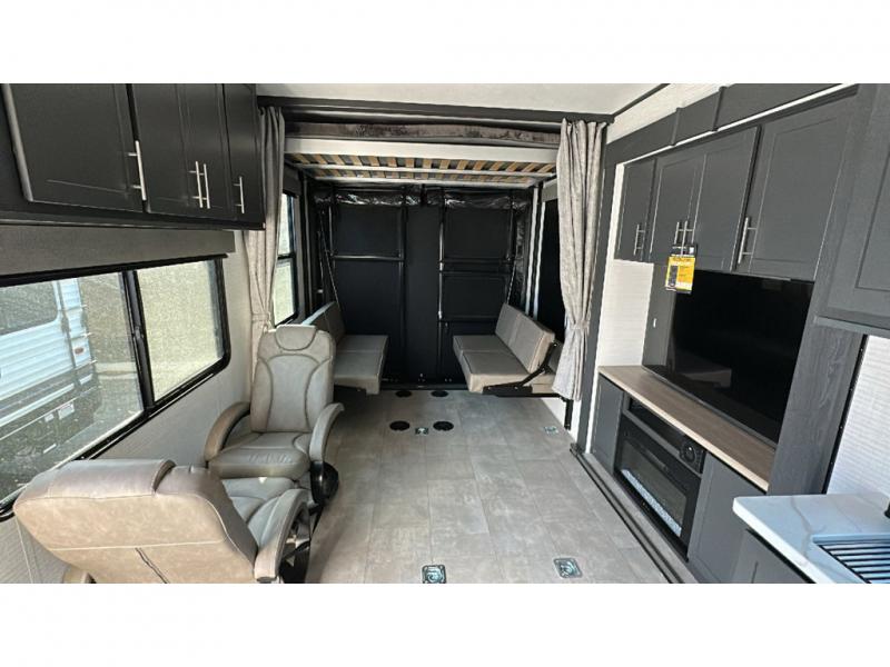 Are you looking for a travel trailer that can haul your favorite riding toys and still provide at-home comforts? This toy hauler is the one with 15' 1" total garage space, a front master bedroom with a king bed and dresser slide out, and a walk-through bath! The main living area also includes many comforts, like the dual lounge chairs, entertainment center slide out with a fireplace, and full kitchen. Your guests will find their beds on the electric pass-thru dinette or the drop-down electric bed!