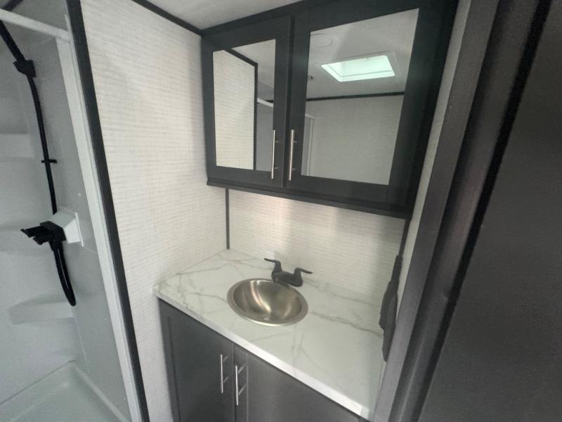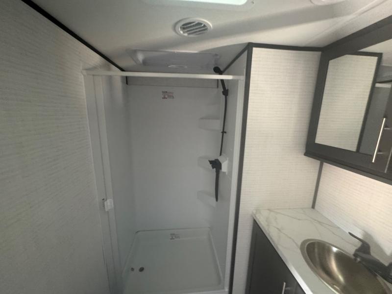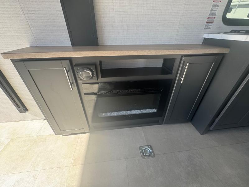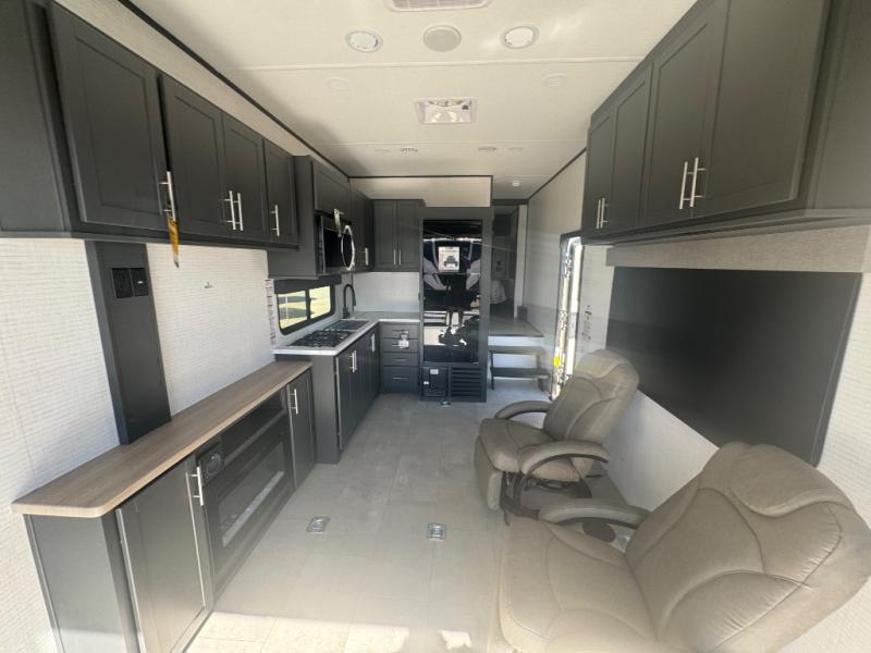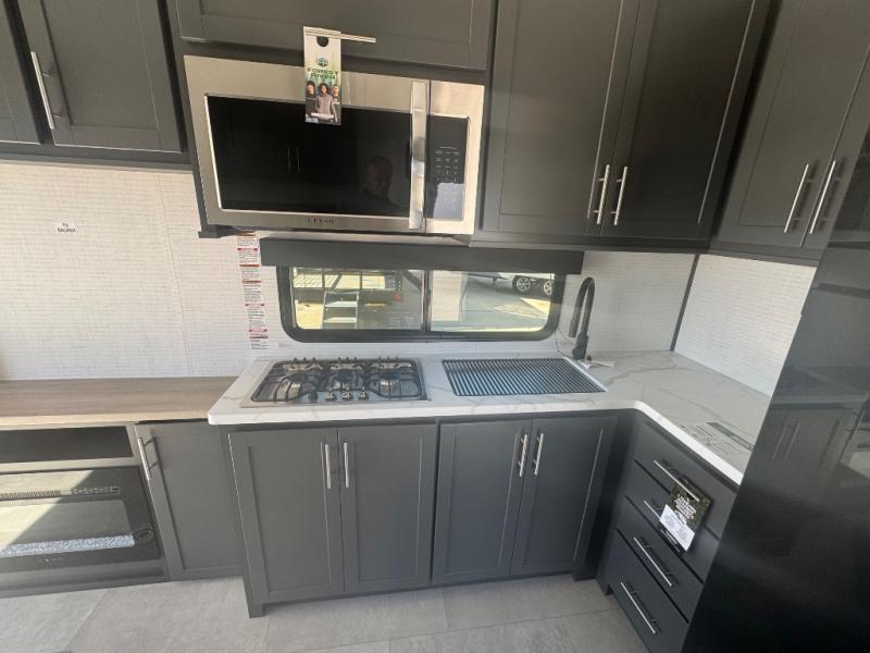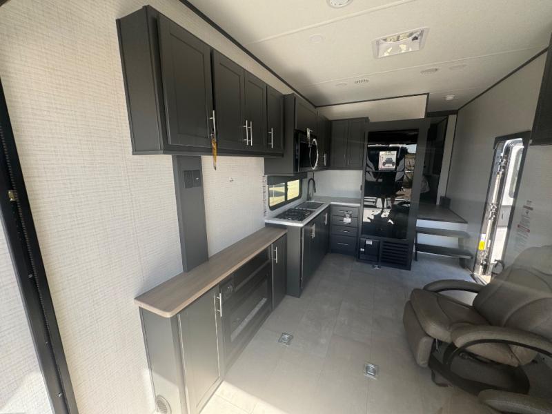 This toy hauler features 15' 7" of total garage space so you can easily fit your toys in! Once they're unloaded, you can relax on the electric pass-thru dinette or dual lounge chairs. You'll find a cooktop in the kitchen, a 12V refrigerator to keep perishables fresh, and plenty of counter space to prep meals. The full bath will let you clean up after trail riding, and the front private bedroom with a king bed is sure to bring a great night's rest.