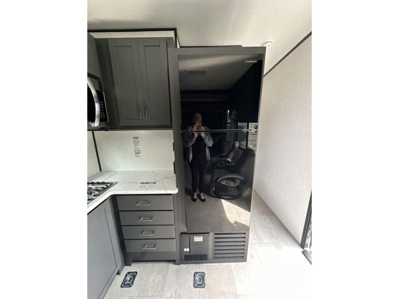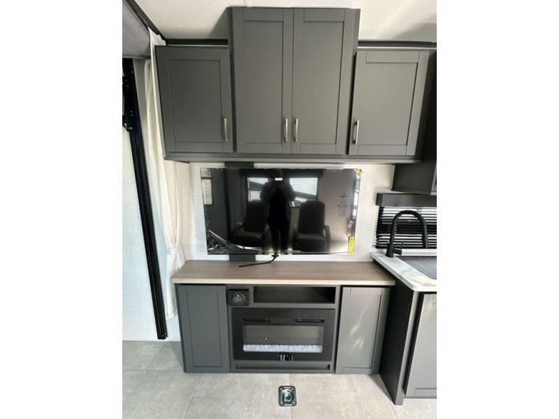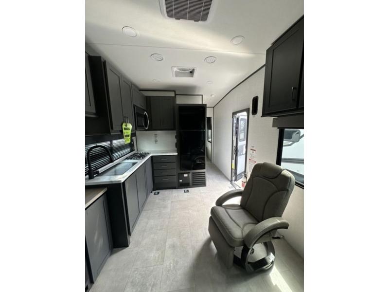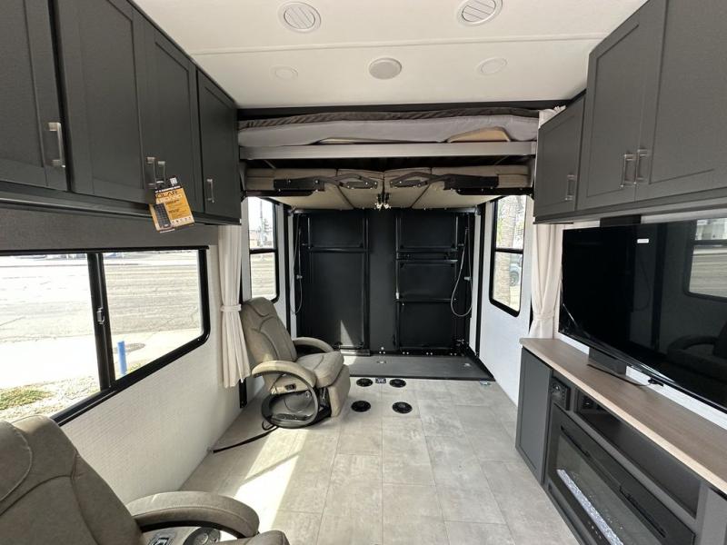 Spend your weekends riding the trails with this toy hauler in tow! There is 16' 1" total garage space for your toys and a ramp door for quick unloading. While the chef of your group is preparing lunch on the cooktop, everyone else can play a card game at the electric pass-thru dinette. The kitchen also features plenty of overhead cabinet space, convection microwave and a 10.7 cu. ft. refrigerator providing you the essential to whip up a meal in comfort. This model includes an entertainment center directly across from the dual lounge chairs for all-around comfort. The king bed in the front private bedroom is sure to bring a great night's rest, while your guests sleep on the dinette or drop-down electric bed above!