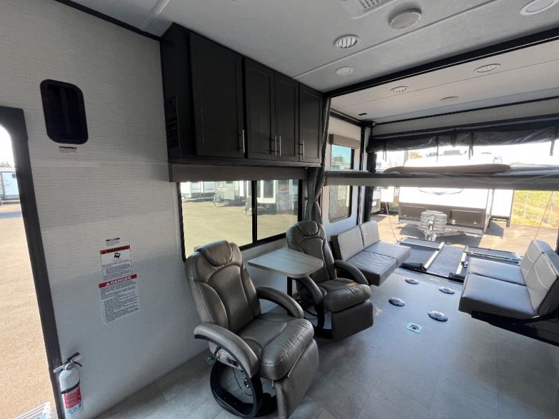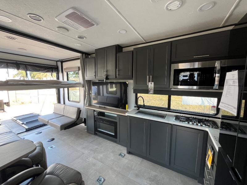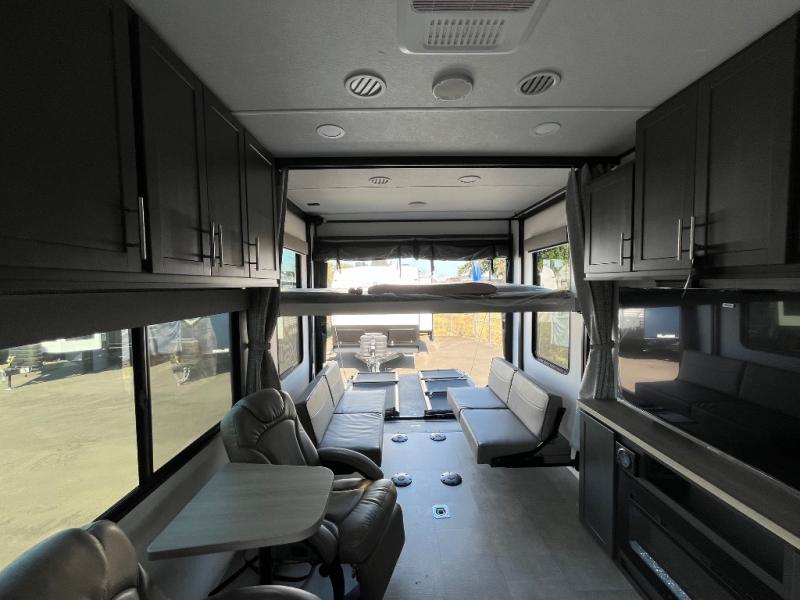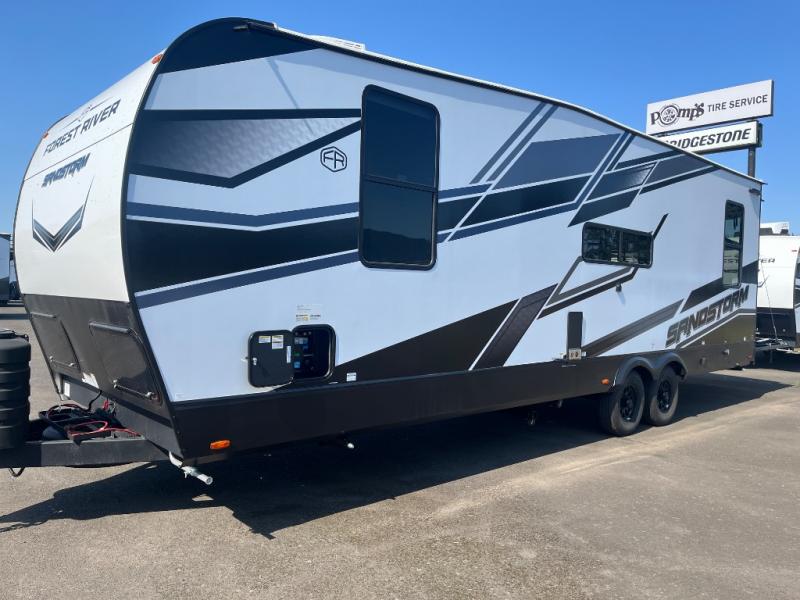 The Sandstorm toy haulers by Forest River let you take your adventures up a notch! There are four different build levels to choose from to best fit your needs, budget, and style. Each travel trailer and fifth wheel include flipped axles with no interior drive on wheel wells, Flip tread solid entry steps, and tie-downs mounted to steel throughout to keep toys secure on the way to the campground. The power tongue jack will make it easier than ever to hitch up and go, and the Lippert ladder prep means you can add this option to easily access the roof. A 40 gallon fuel station comes standard to keep your toys ready to go when you are, and the dual 20 lbs. propane tanks will let you hook up the grill to make dinner for your whole crew. Some of the other convenient features include a spare tire (with carrier on tongue pull) if an unfortunate flat happens, a 335W solar panel, and a 1.5 cu. ft. convection microwave. And don't forget about the available options that will allow you to customize your toy hauler exactly how you want it!