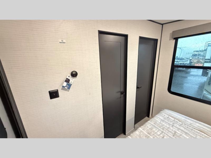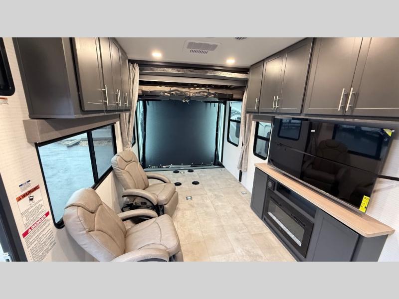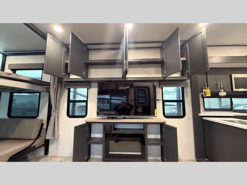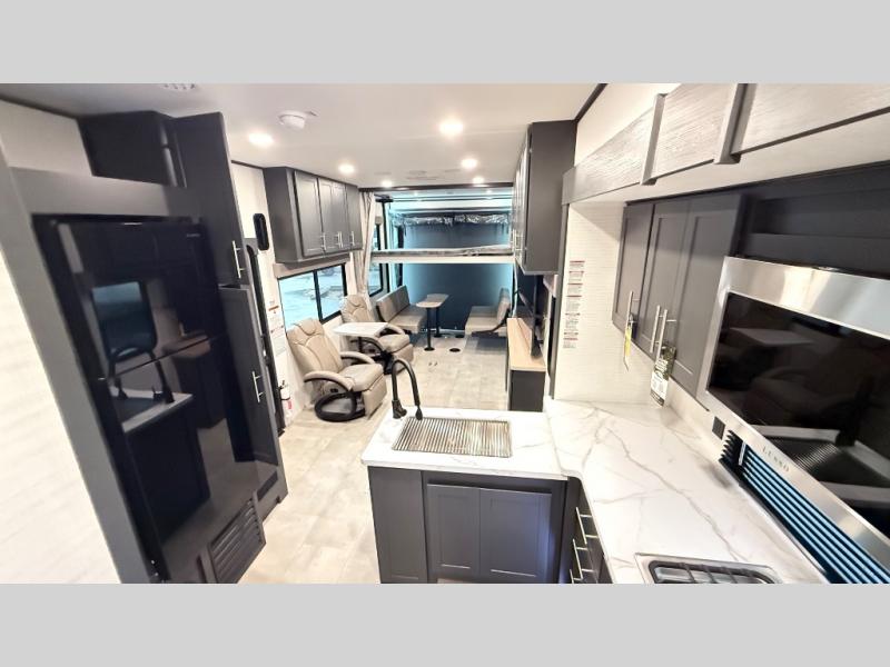This dual entry travel trailer is sure to meet all your needs. Once you arrive at the campground, unload your toys from the 15' 7" total garage space, then grab a cold drink from the refrigerator. You can then relax on the dual lounge chairs, play a game at the electric pass-thru dinette, or let your guests rest on the electric bed. If you need a rest yourself, you'll find the king bed in the front master bedroom ultra comfortable. This model also includes an entertainment center with a fireplace and a kitchen slide out with the sink, counter space, cooktop, and pantry!