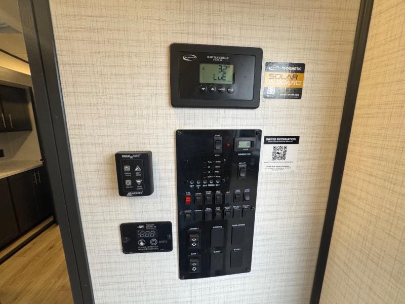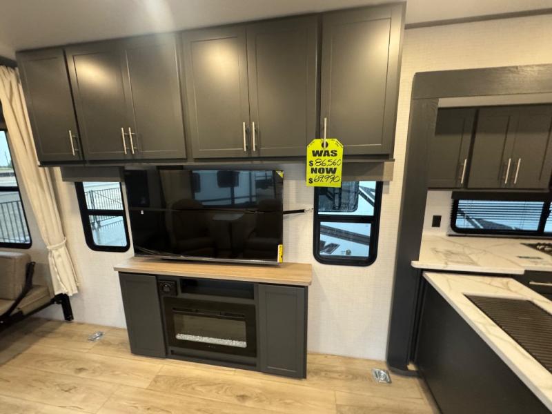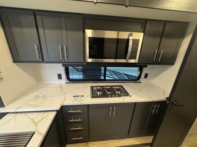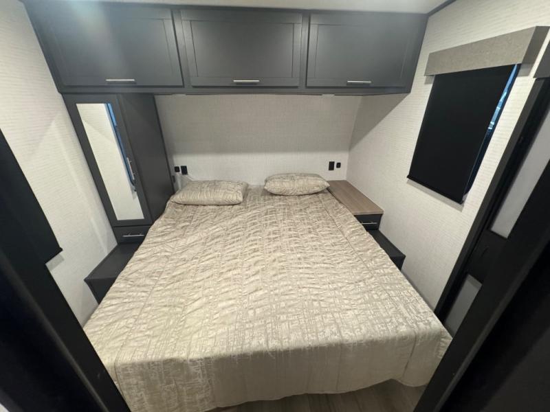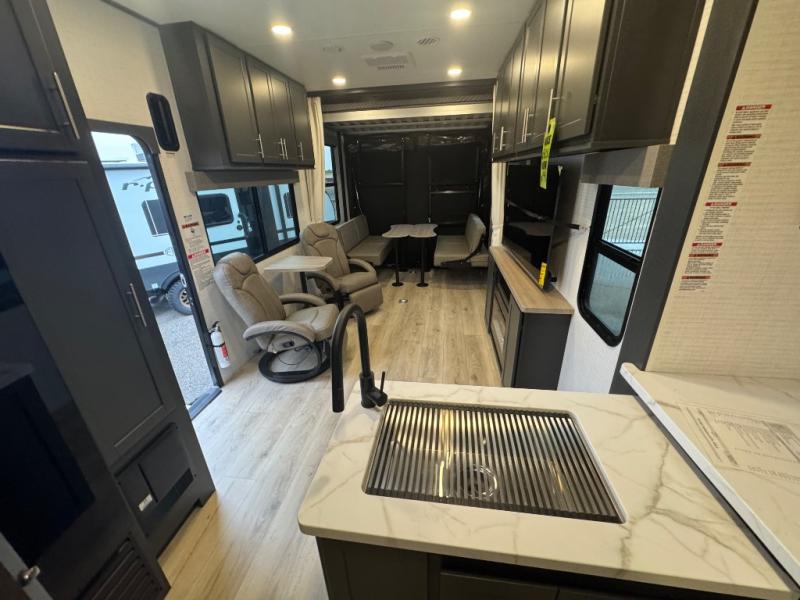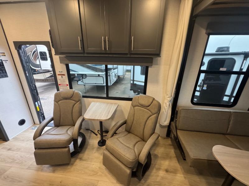 This dual entry travel trailer is sure to meet all your needs. Once you arrive at the campground, unload your toys from the 15' 7" total garage space, then grab a cold drink from the refrigerator. You can then relax on the dual lounge chairs, play a game at the electric pass-thru dinette, or let your guests rest on the electric bed. If you need a rest yourself, you'll find the king bed in the front master bedroom ultra comfortable. This model also includes an entertainment center with a fireplace and a kitchen slide out with the sink, counter space, cooktop, and pantry!