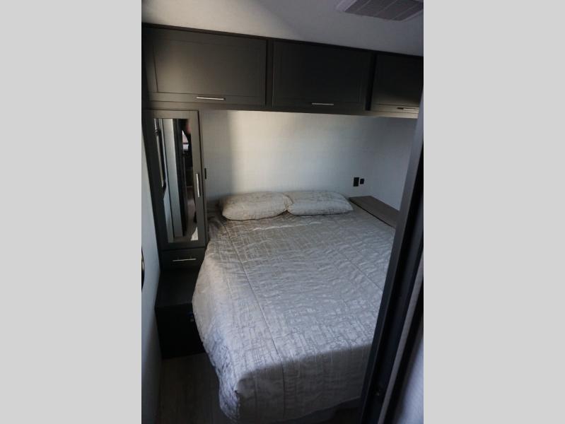 This dual entry travel trailer is sure to meet all your needs. Once you arrive at the campground, unload your toys from the 15' 7" total garage space, then grab a cold drink from the refrigerator. You can then relax on the dual lounge chairs, play a game at the electric pass-thru dinette, or let your guests rest on the electric bed. If you need a rest yourself, you'll find the king bed in the front master bedroom ultra comfortable. This model also includes an entertainment center with a fireplace and a kitchen slide out with the sink, counter space, cooktop, and pantry!