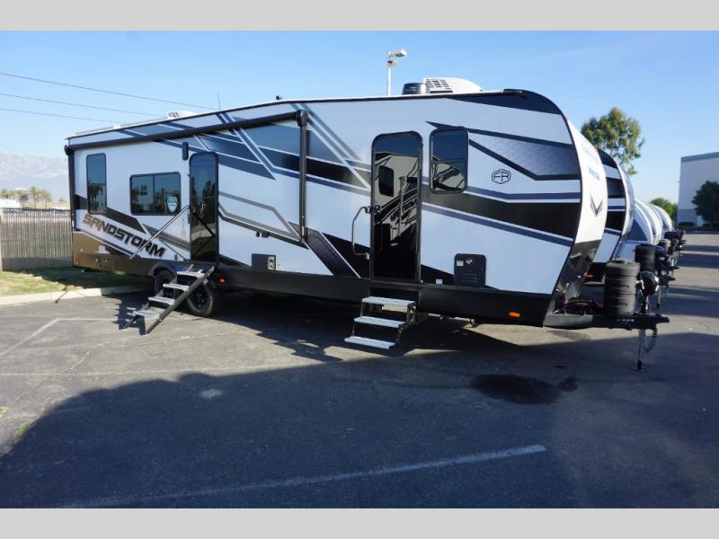 Enjoy flexible living and affordable costs with the Sandstorm fifth wheel and travel trailer toy haulers! The versatile garage areas can be used for both toy storage plus seating and sleeping spaces. Each model includes a ramp door with patio cables, a power tongue jack, and a 40-gallon fuel station to keep your bikes filled and ready for adventure. The residential king bed is sure to bring comfort each day, along with a tankless water heater so everyone can clean up after trail riding. There are a variety of floorplans to choose from, including GX models with added features for those who want to take their excursions up a notch!