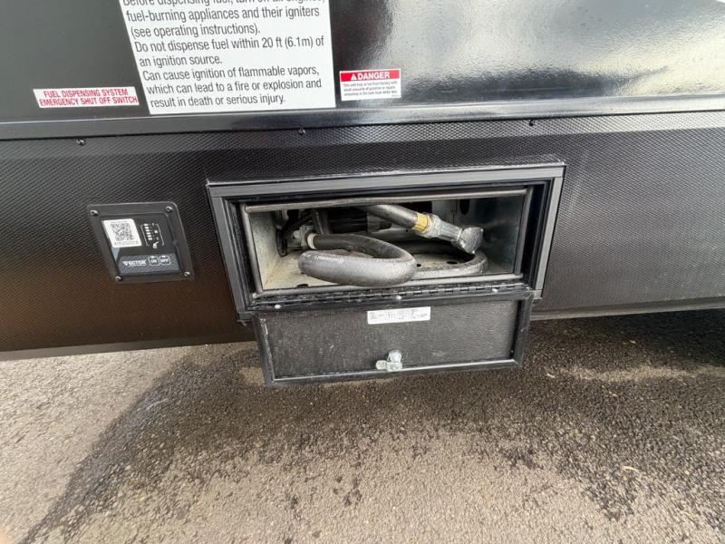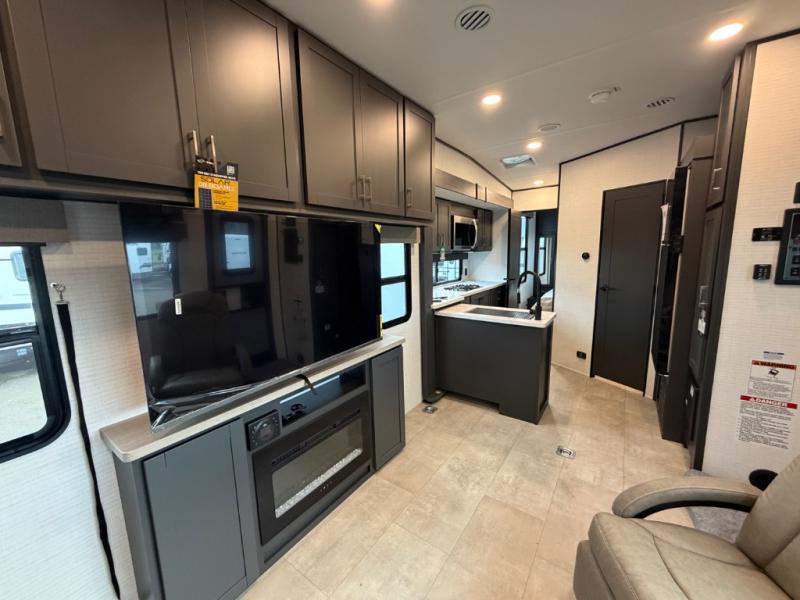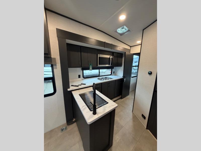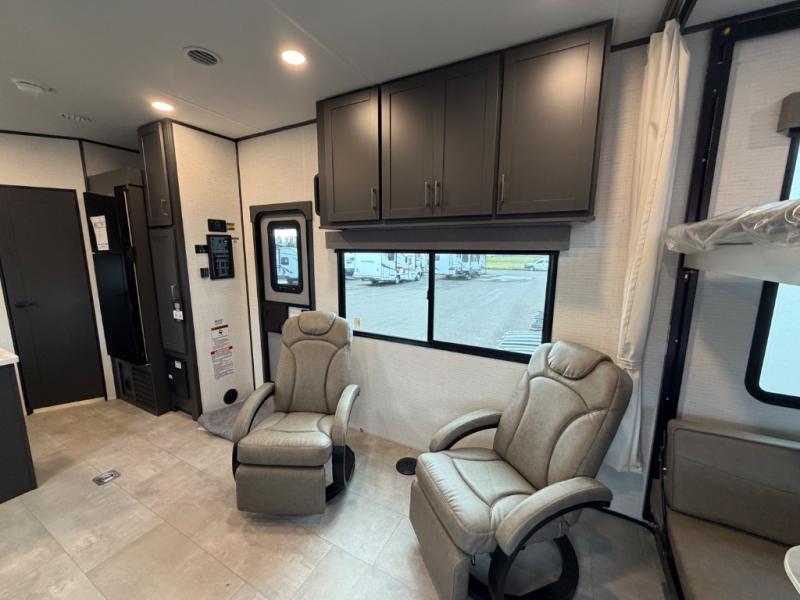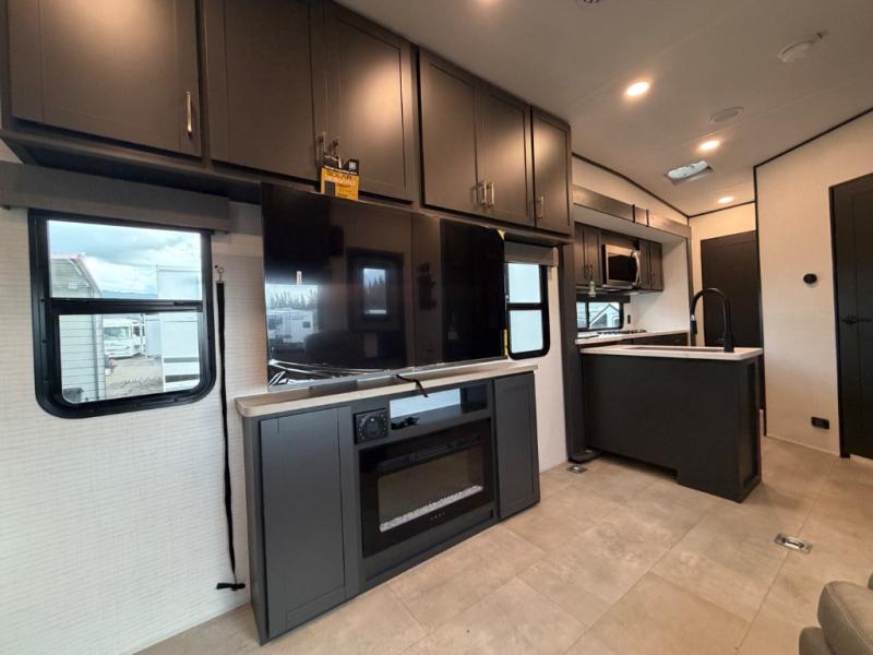 This dual entry travel trailer is sure to meet all your needs. Once you arrive at the campground, unload your toys from the 15' 7" total garage space, then grab a cold drink from the refrigerator. You can then relax on the dual lounge chairs, play a game at the electric pass-thru dinette, or let your guests rest on the electric bed. If you need a rest yourself, you'll find the king bed in the front master bedroom ultra comfortable. This model also includes an entertainment center with a fireplace and a kitchen slide out with the sink, counter space, cooktop, and pantry!