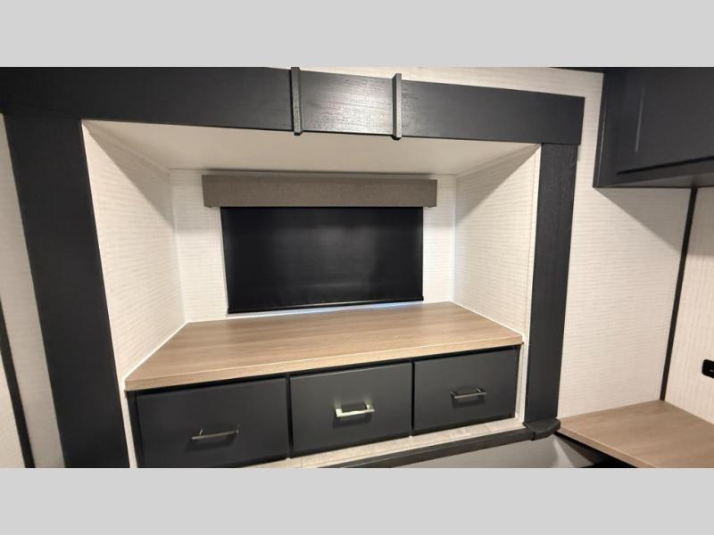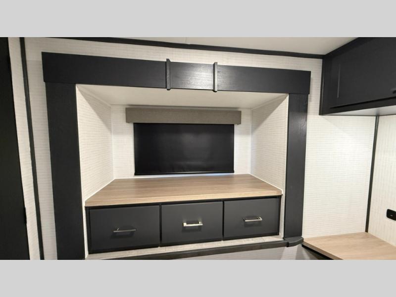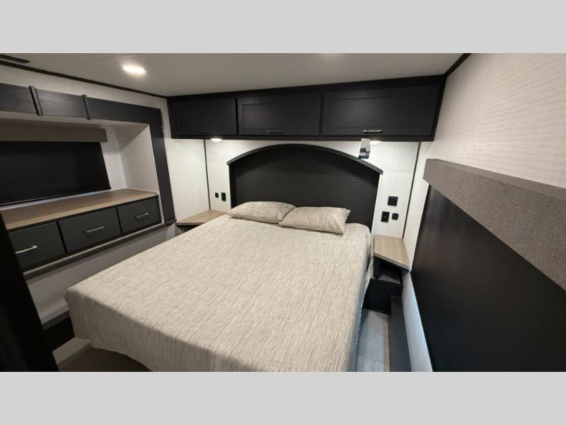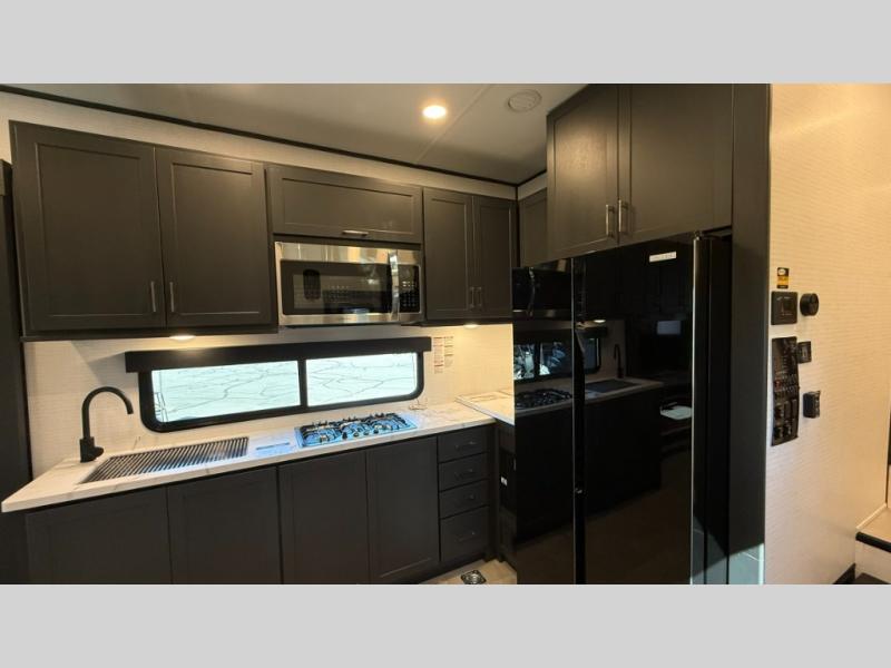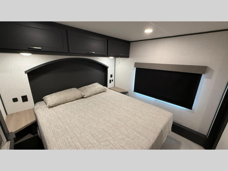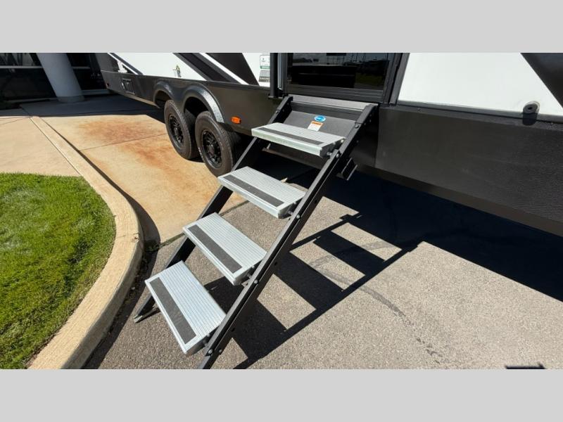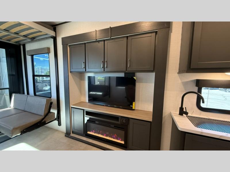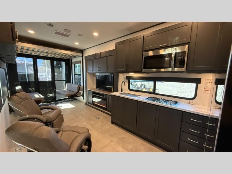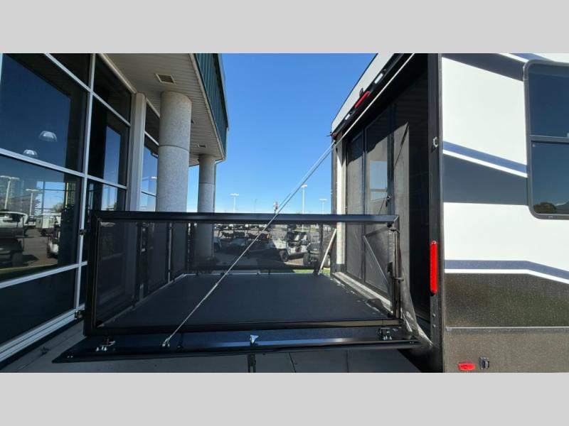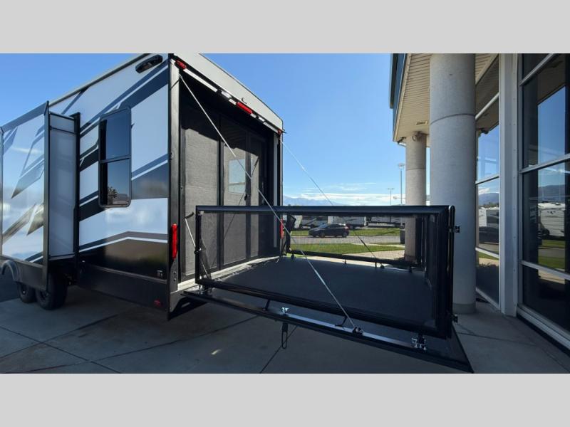Whether you're heading to the woods or lake, you'll enjoy every minute in this spacious toy hauler. There is 19' 7" total garage space for your toys plus a ramp door to easily unload them. Once the dirt bikes are out, you can dine at the electric pass-thru dinette or relax on the dual lounge chairs across from the Smart TV and fireplace. The kitchen includes a 15.6 cu. ft. 12V refrigerator, a three burner cooktop, and plenty of counter space to prep meals. You'll find the front private bedroom to be inviting with its king bed, dresser slide out, plus dual wardrobes and a closet for storage galore! And the full bath is close by for easy nighttime use!