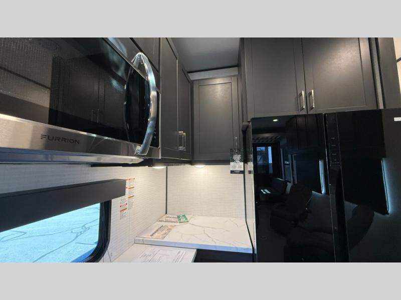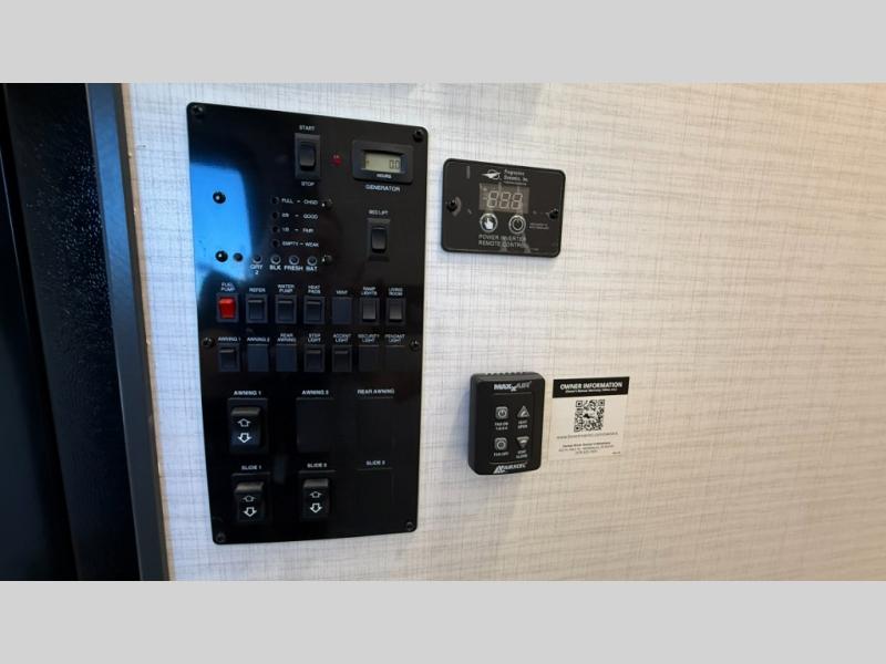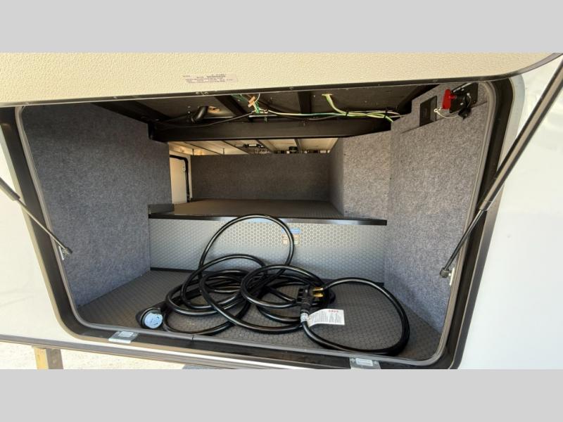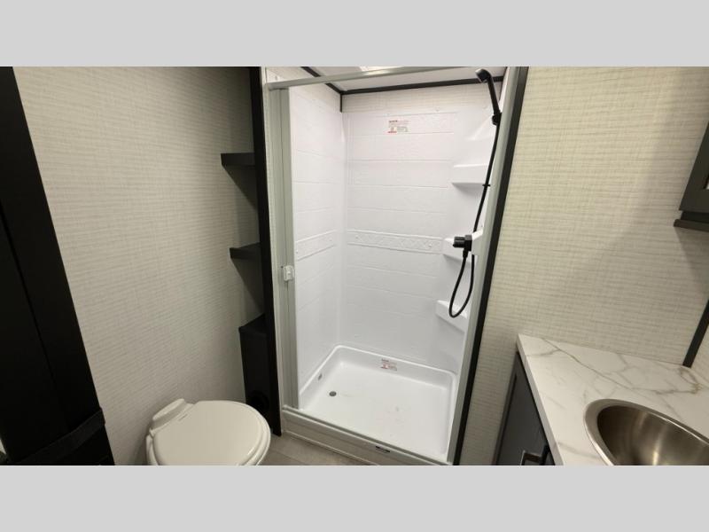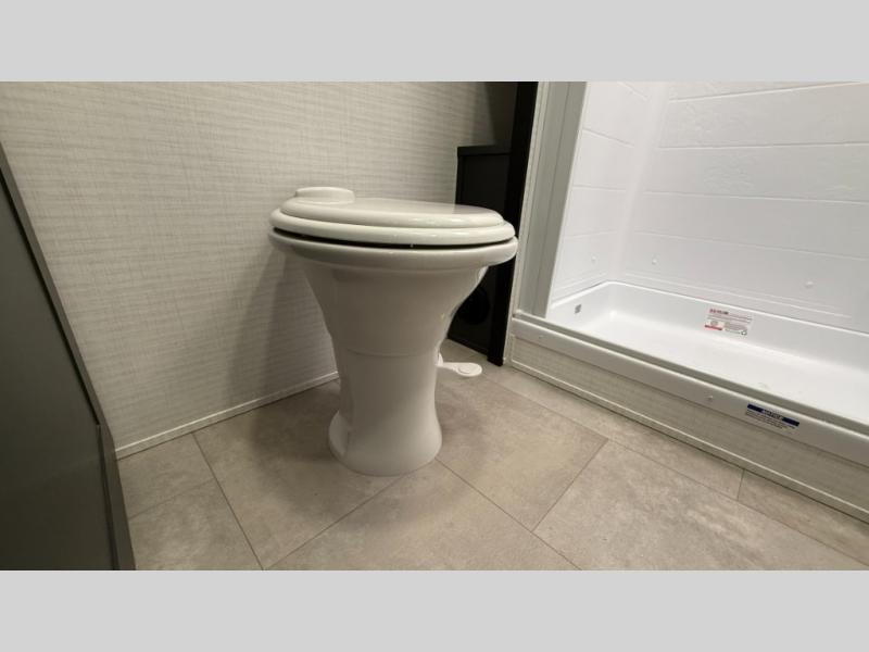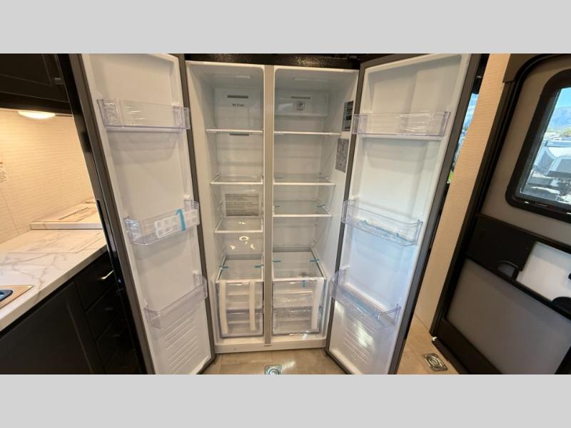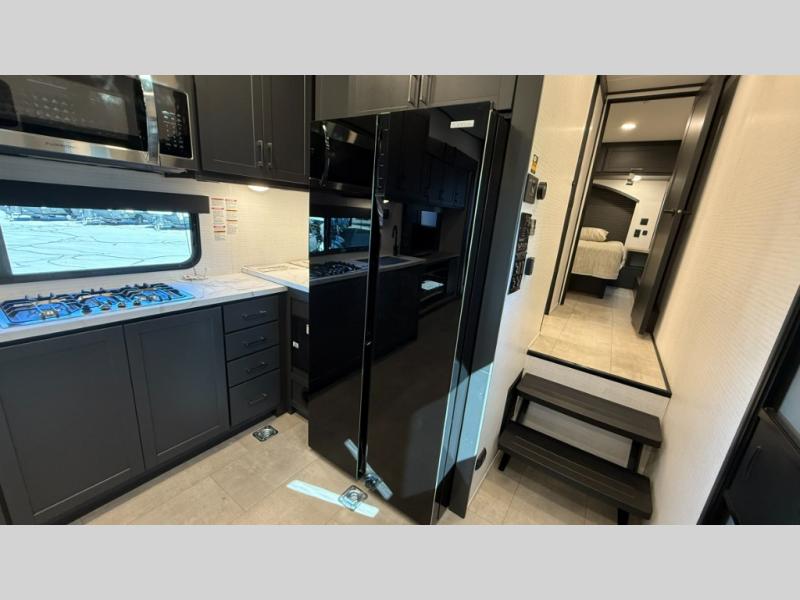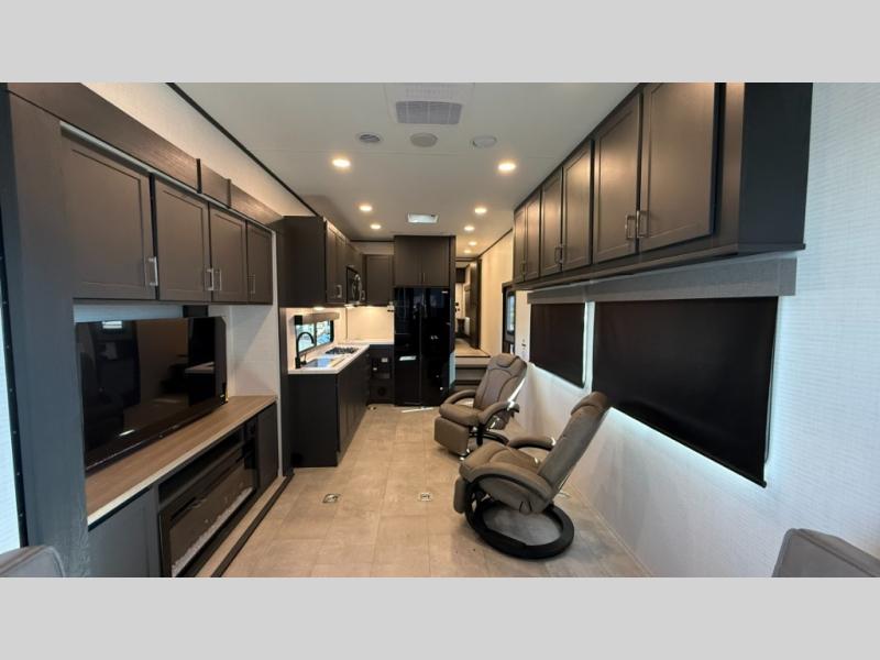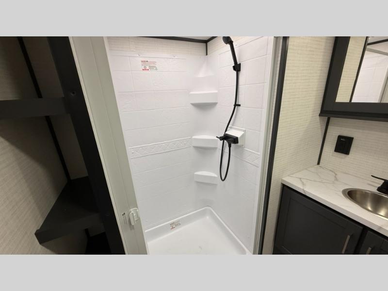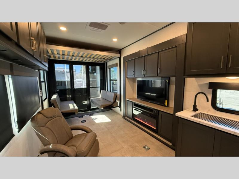 Whether you're heading to the woods or lake, you'll enjoy every minute in this spacious toy hauler. There is 19' 7" total garage space for your toys plus a ramp door to easily unload them. Once the dirt bikes are out, you can dine at the electric pass-thru dinette or relax on the dual lounge chairs across from the Smart TV and fireplace. The kitchen includes a 15.6 cu. ft. 12V refrigerator, a three burner cooktop, and plenty of counter space to prep meals. You'll find the front private bedroom to be inviting with its king bed, dresser slide out, plus dual wardrobes and a closet for storage galore! And the full bath is close by for easy nighttime use!