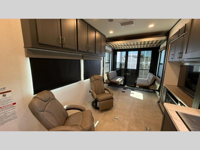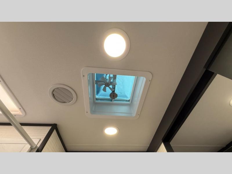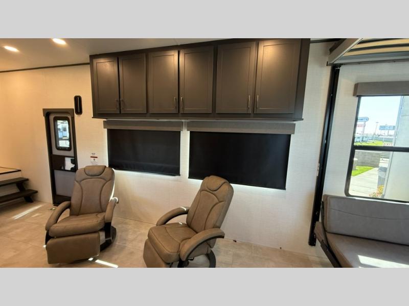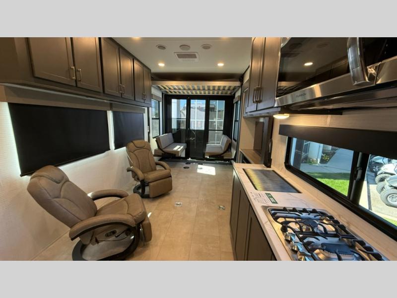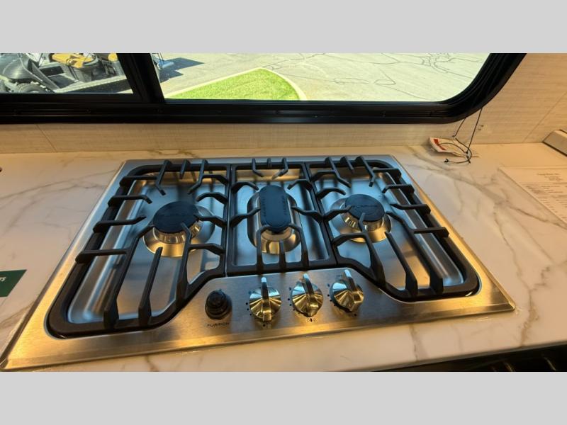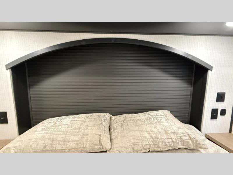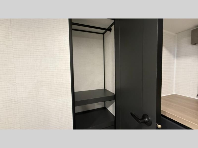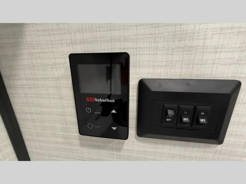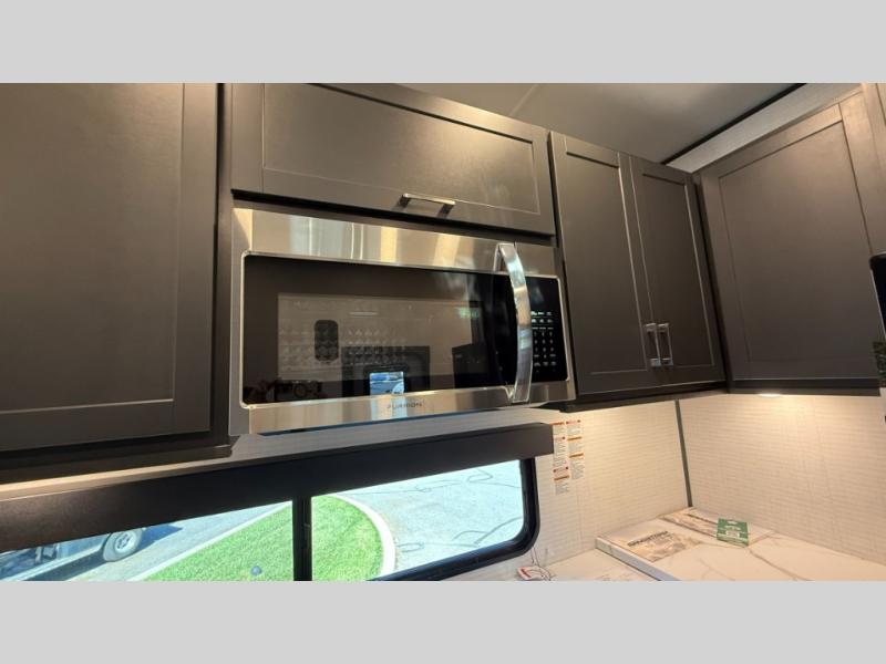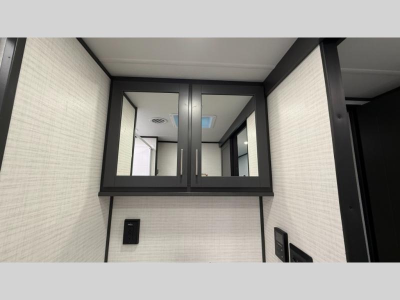 Whether you're heading to the woods or lake, you'll enjoy every minute in this spacious toy hauler. There is 19' 7" total garage space for your toys plus a ramp door to easily unload them. Once the dirt bikes are out, you can dine at the electric pass-thru dinette or relax on the dual lounge chairs across from the Smart TV and fireplace. The kitchen includes a 15.6 cu. ft. 12V refrigerator, a three burner cooktop, and plenty of counter space to prep meals. You'll find the front private bedroom to be inviting with its king bed, dresser slide out, plus dual wardrobes and a closet for storage galore! And the full bath is close by for easy nighttime use!