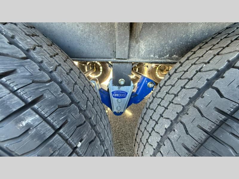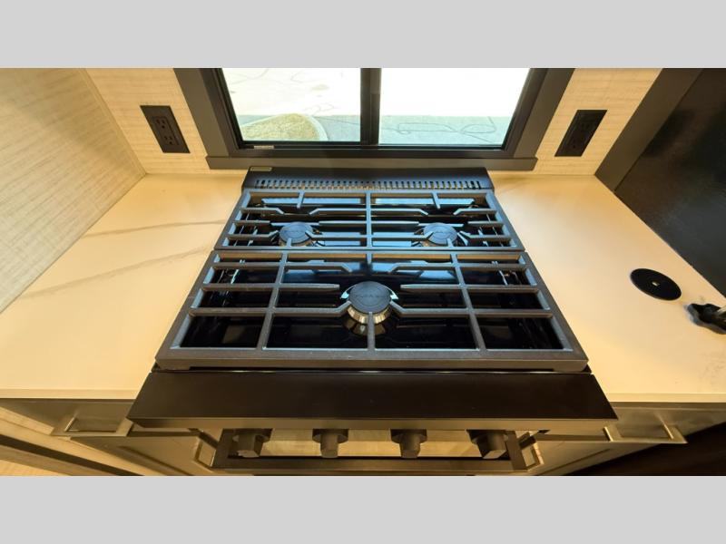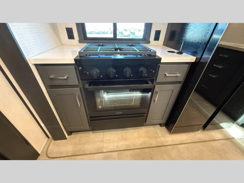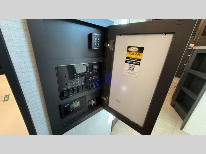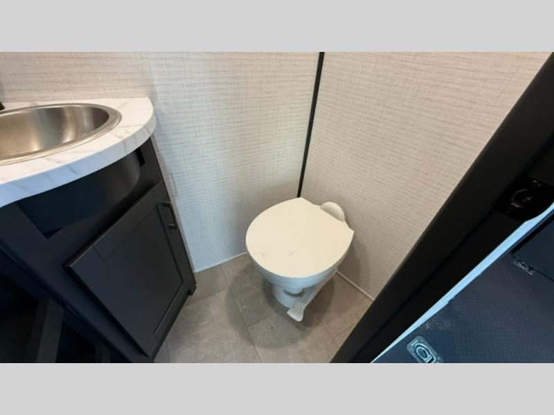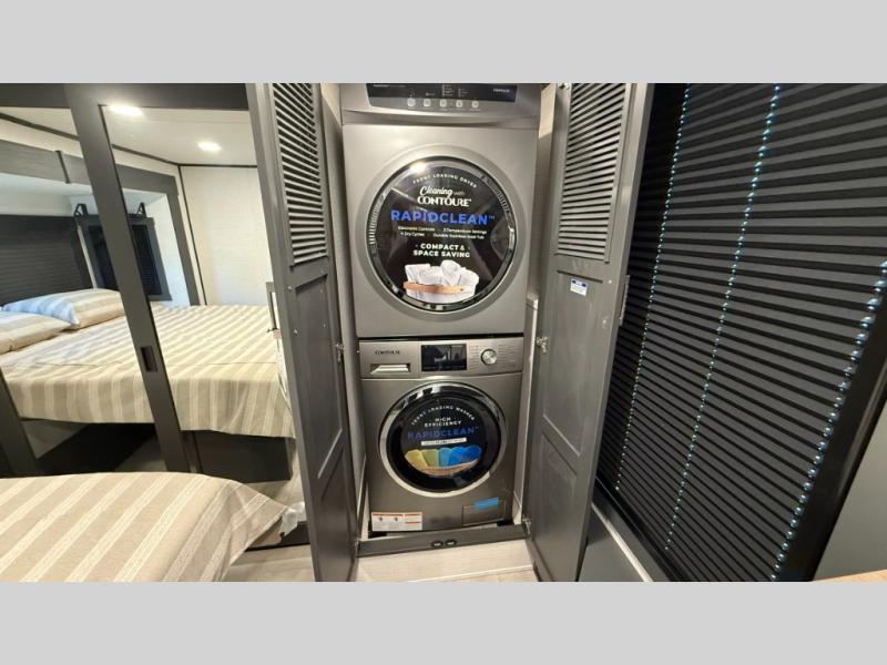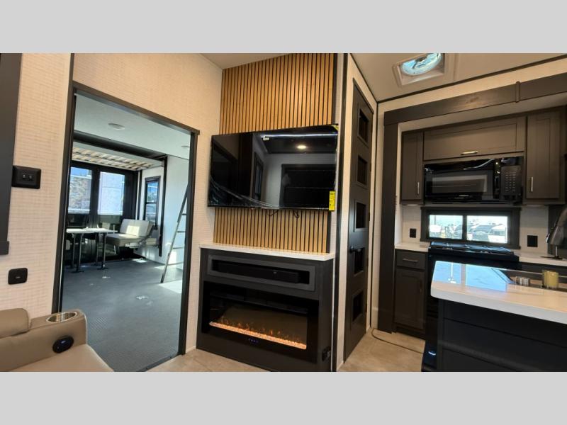 You'll find plenty of space in this toy hauler for your dirt bikes, gear and more! The spacious 17' garage includes a Happi Jack dinette with removeable dinette tables plus a Happi Jack queen bed system above. There is also a half bath here for added convenience! Head to the middle kitchen and living room to relax on the sofa slide out, cook your best meals, and enjoy the 55" TV and fireplace. A full bath up front features a 48" shower to freshen up each day, and the front private bedroom with a king bed slide will feel just like home. There is a front wardrobe, a dresser, plus washer and dryer prep if you want the option to make laundry day easier.