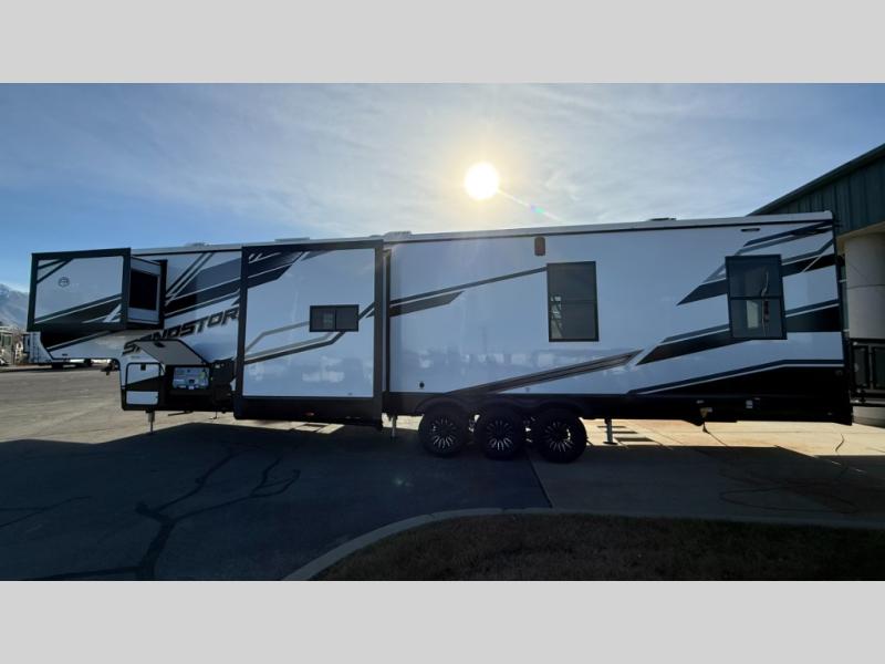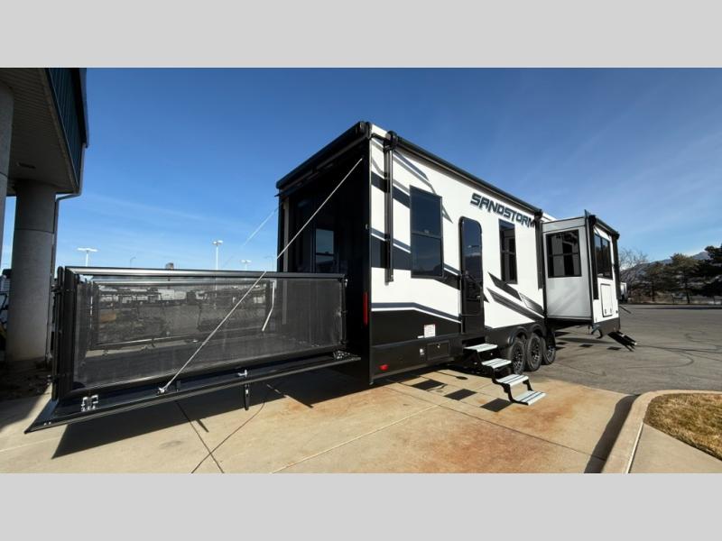 Enjoy flexible living and affordable costs with the Sandstorm fifth wheel and travel trailer toy haulers! The versatile garage areas can be used for both toy storage plus seating and sleeping spaces. There is full bath and kitchen amenities to make camping easier than ever, and you'll find ample storage space for food, gear, personal belongings and more. Each fifth wheel and travel trailer also features generator prep if you'd like to further customize your toy hauler!