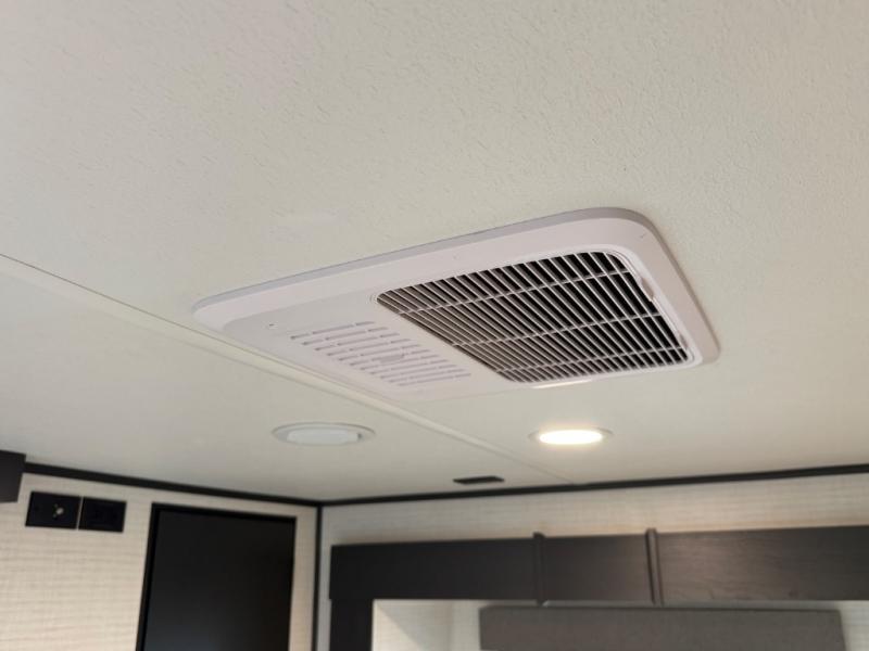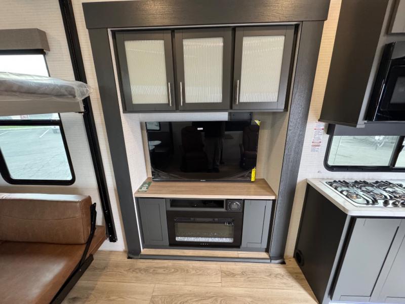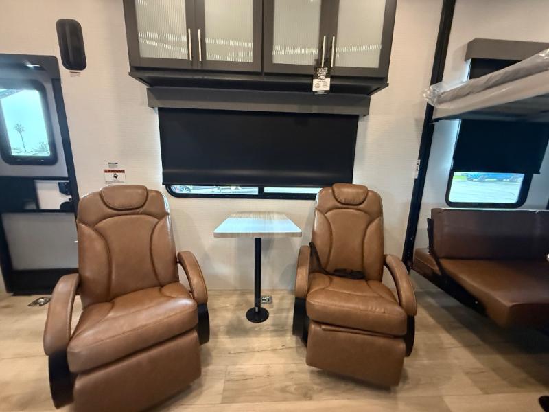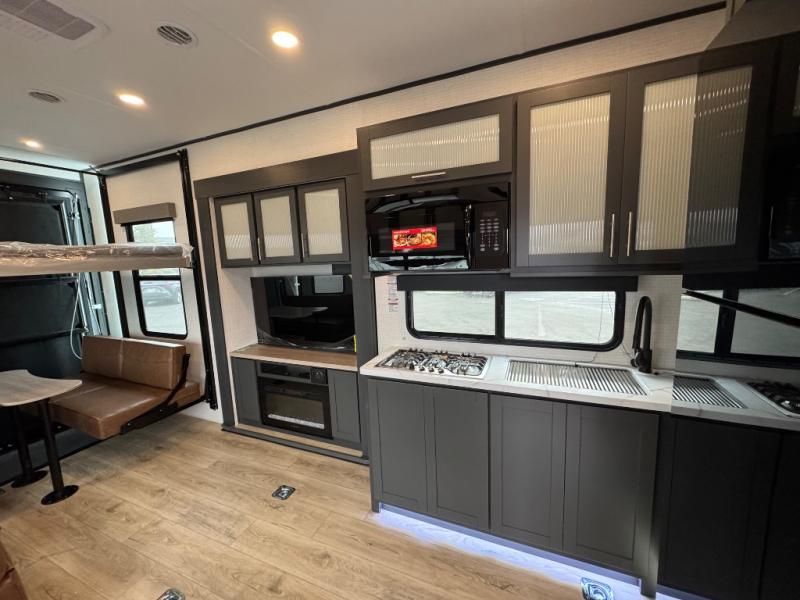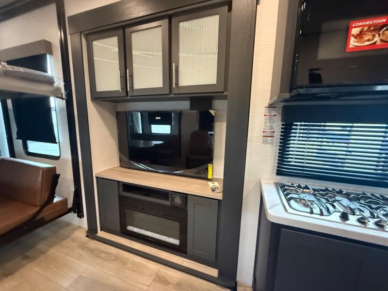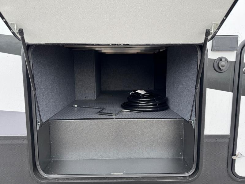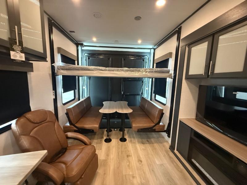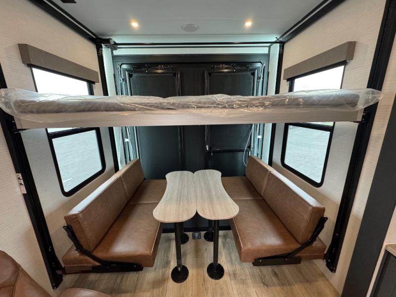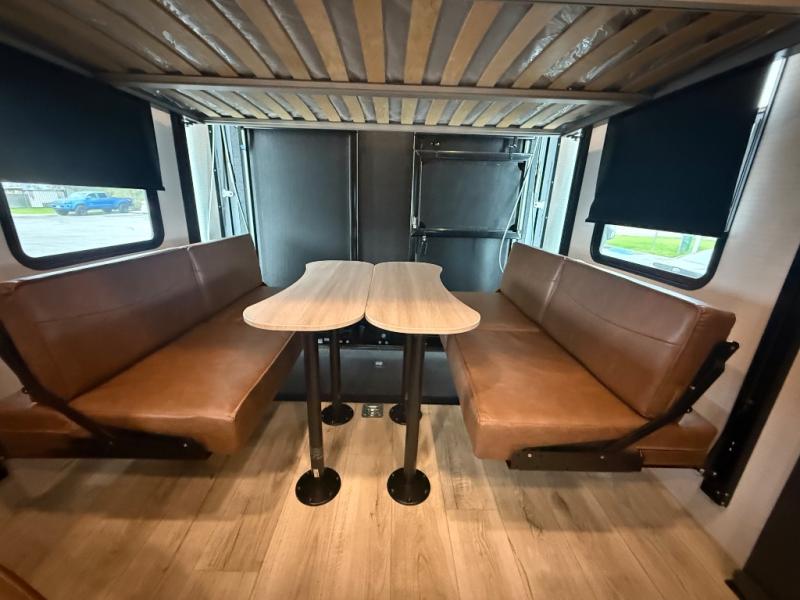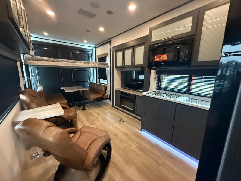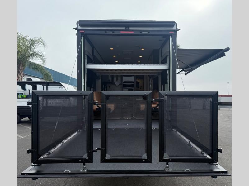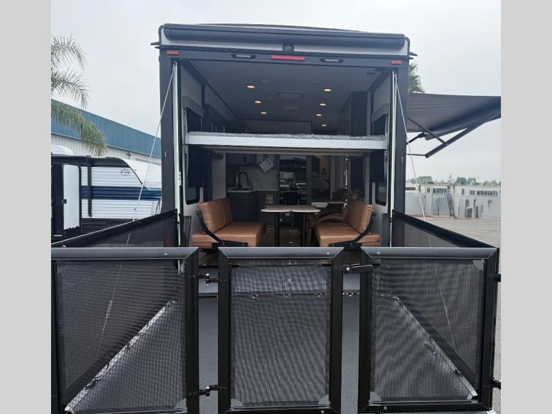 This toy hauler features 15' 7" of total garage space so you can easily fit your toys in! Once they're unloaded, you can relax on the electric pass-thru dinette or dual lounge chairs. There is also an entertainment center slide here. You'll find a cooktop and convection microwave in the kitchen to make meals each day. The full bath will let you clean up after trail riding, and the front private bedroom with a king bed is sure to bring a great night's rest. There is also a dresser slide out in the bedroom for added storage and space!