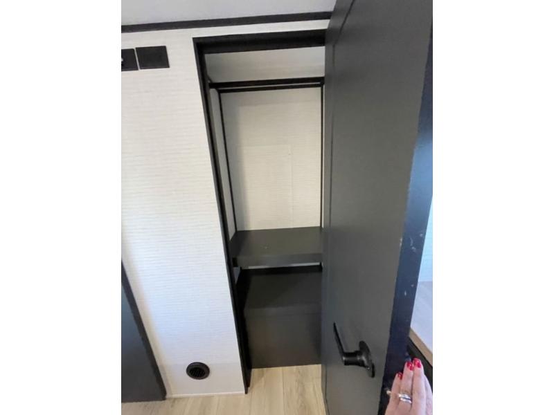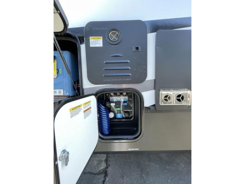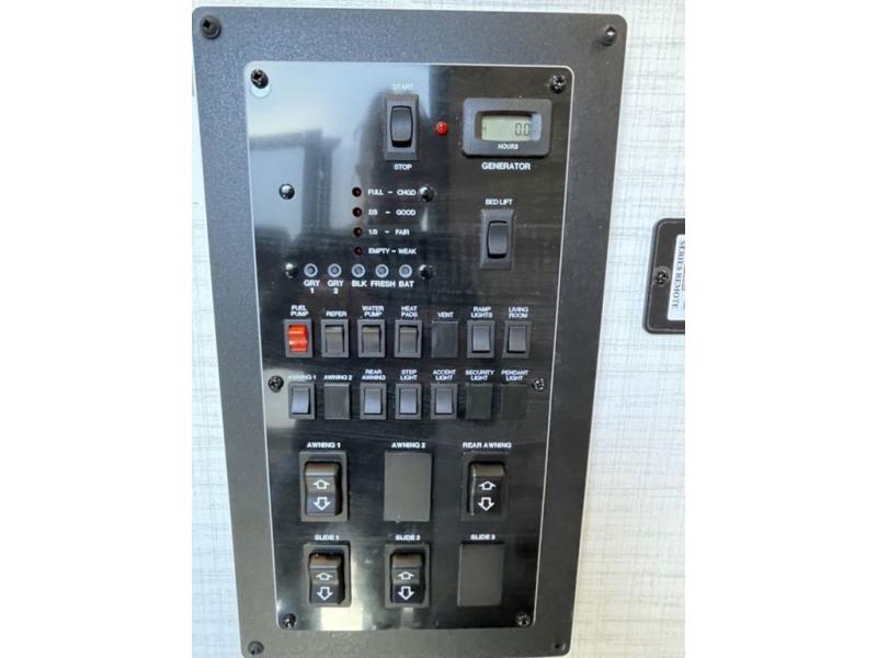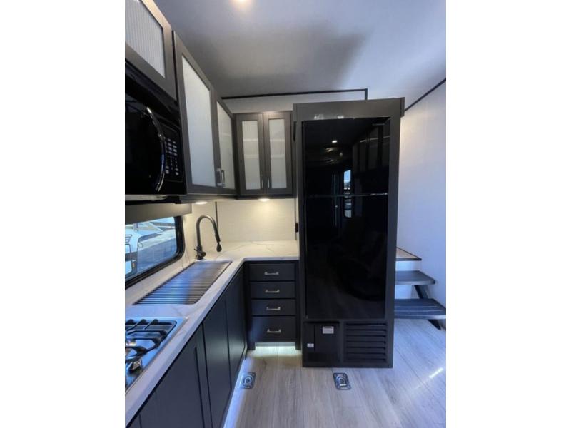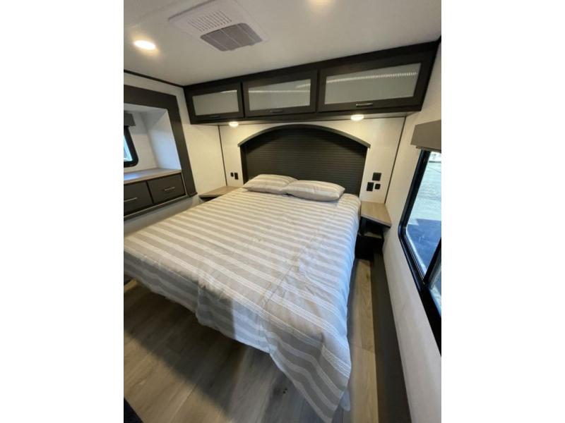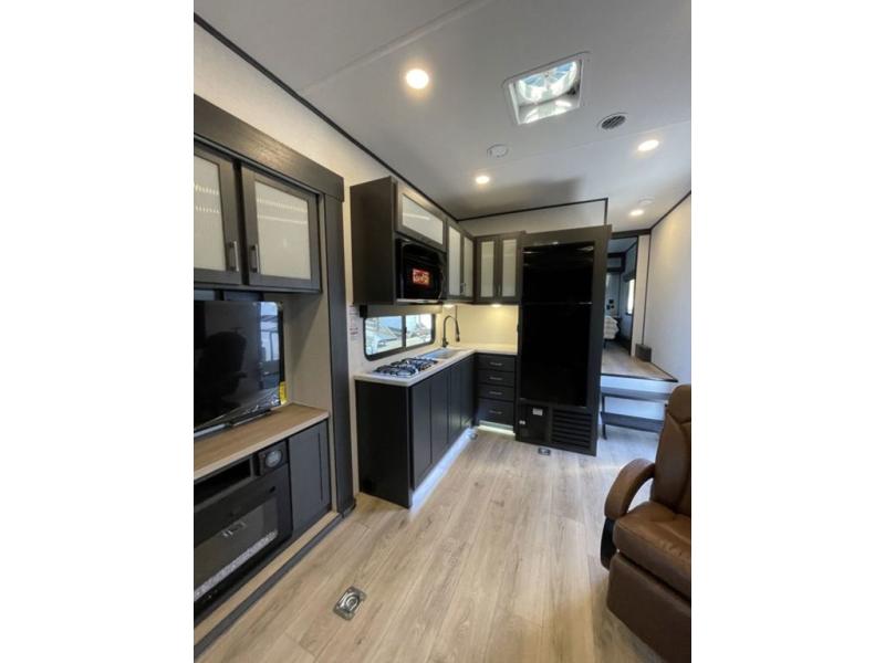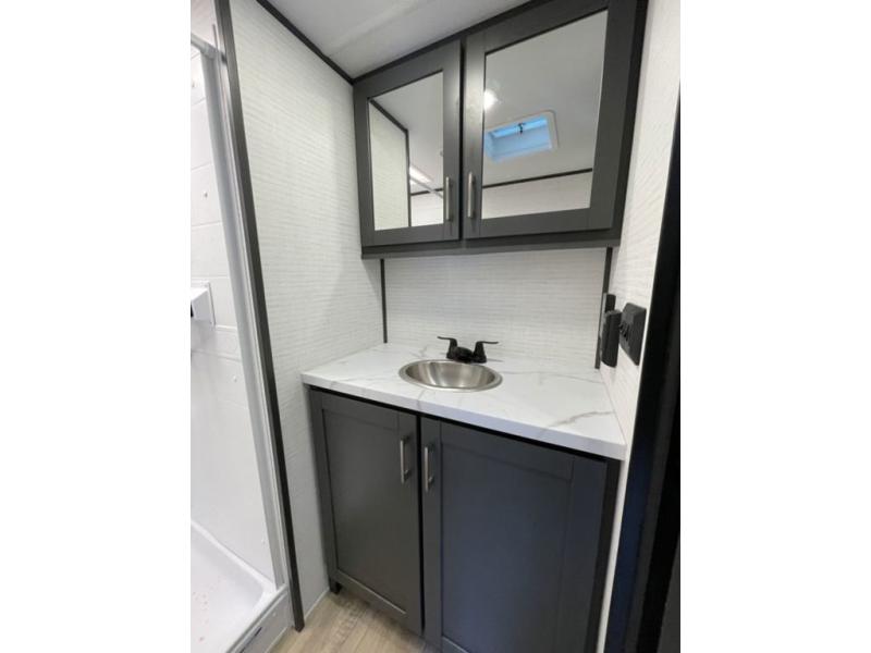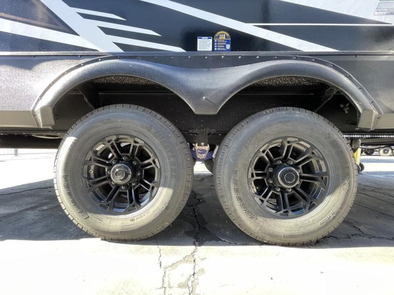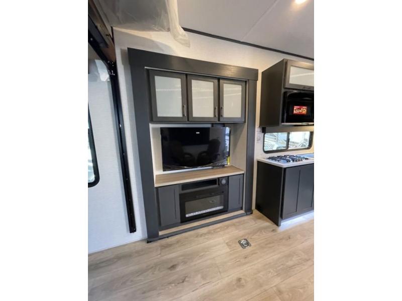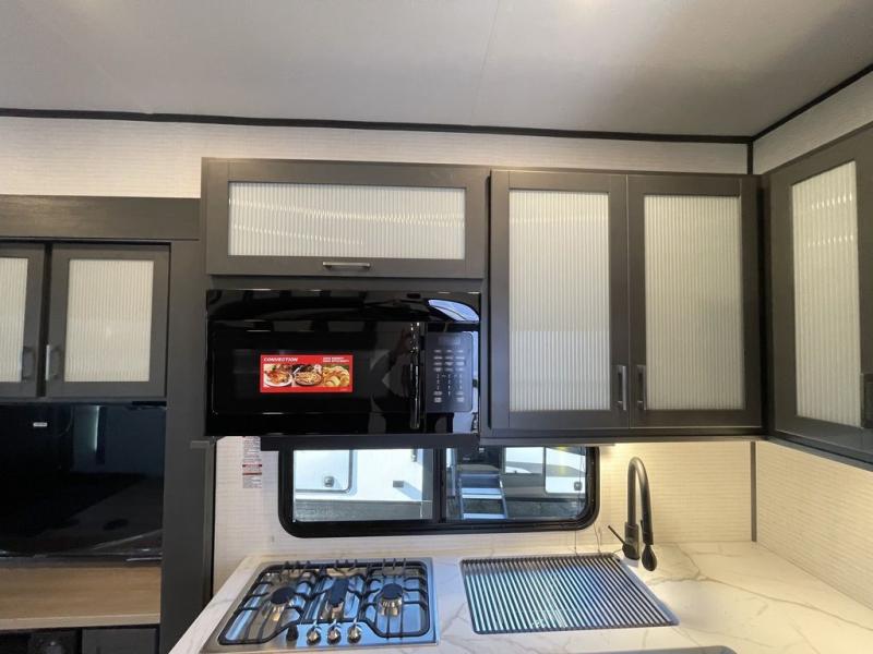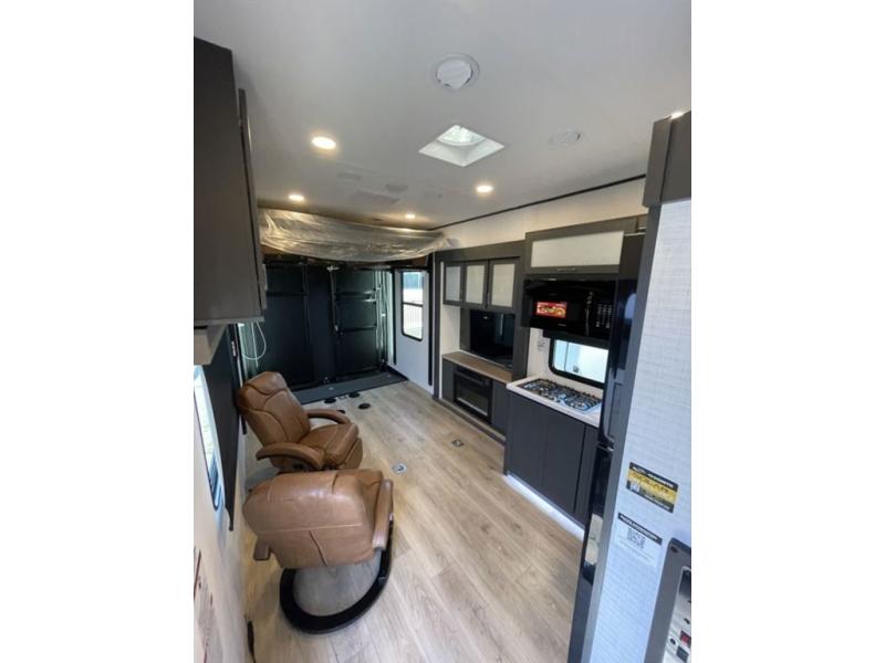 This toy hauler features 15' 7" of total garage space so you can easily fit your toys in! Once they're unloaded, you can relax on the electric pass-thru dinette or dual lounge chairs. There is also an entertainment center slide here. You'll find a cooktop and convection microwave in the kitchen to make meals each day. The full bath will let you clean up after trail riding, and the front private bedroom with a king bed is sure to bring a great night's rest. There is also a dresser slide out in the bedroom for added storage and space!