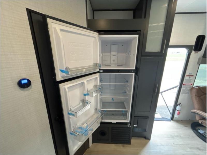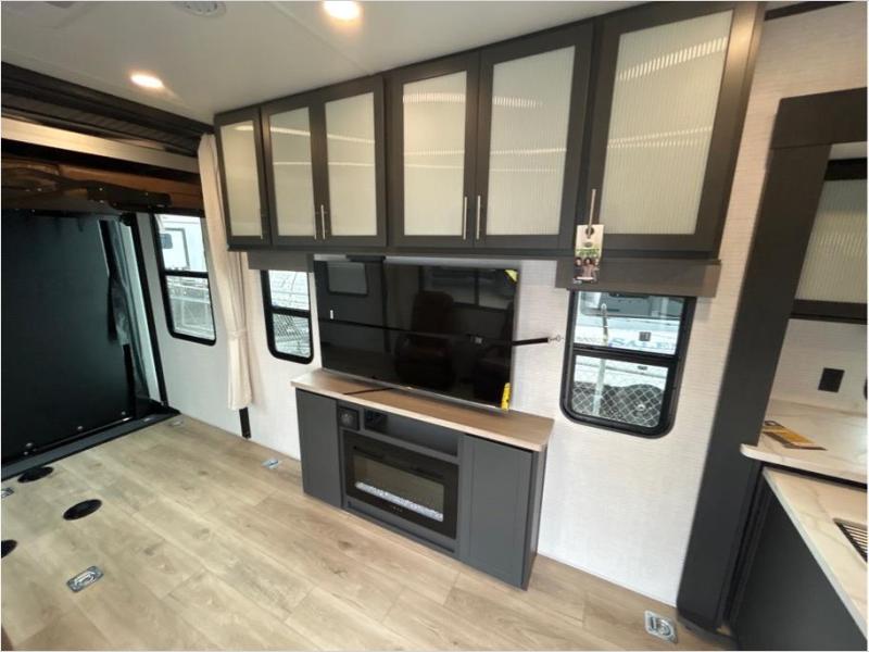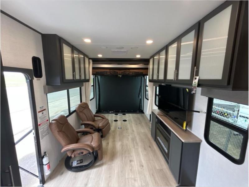 This dual entry travel trailer is sure to meet all your needs. Once you arrive at the campground, unload your toys from the 15' 7" total garage space, then grab a cold drink from the refrigerator. You can then relax on the dual lounge chairs, play a game at the electric pass-thru dinette, or let your guests rest on the electric bed. If you need a rest yourself, you'll find the king bed in the front master bedroom ultra comfortable. This model also includes an entertainment center with a fireplace and a kitchen slide out with the sink, counter space, cooktop, and pantry!