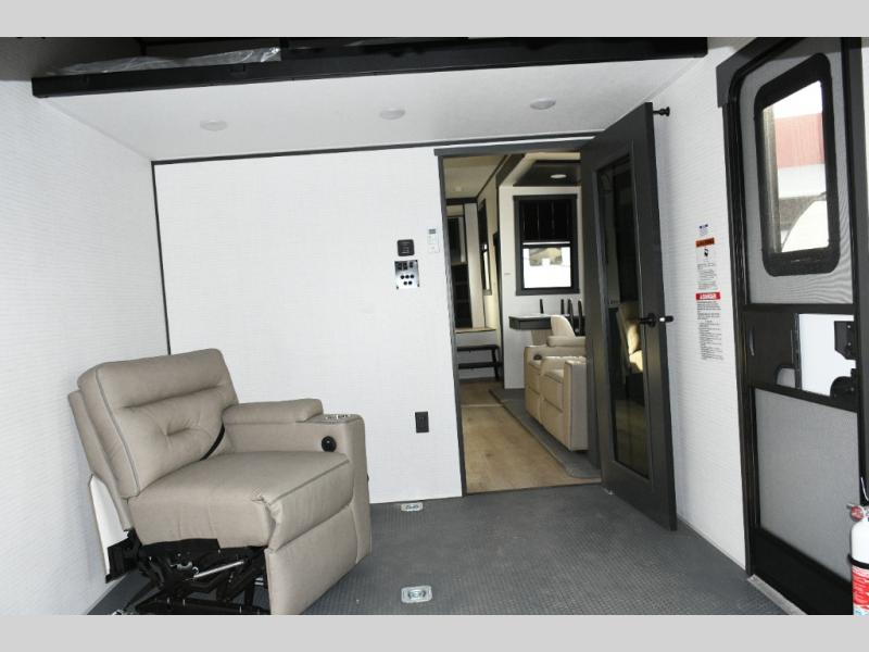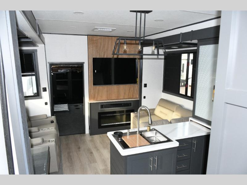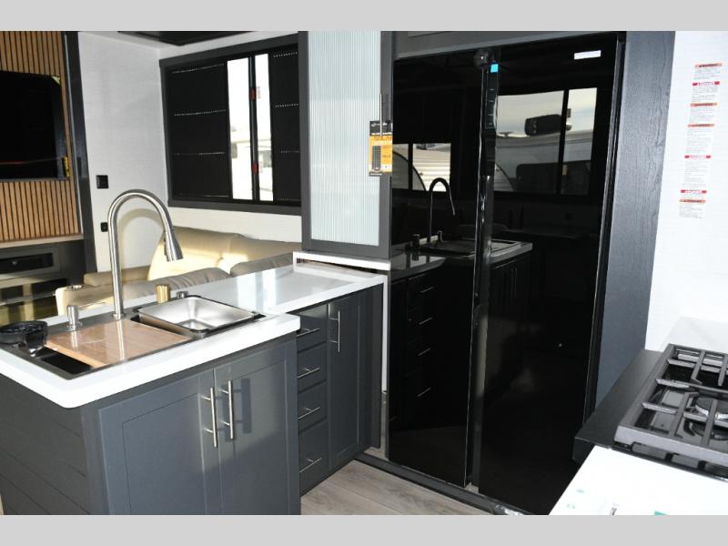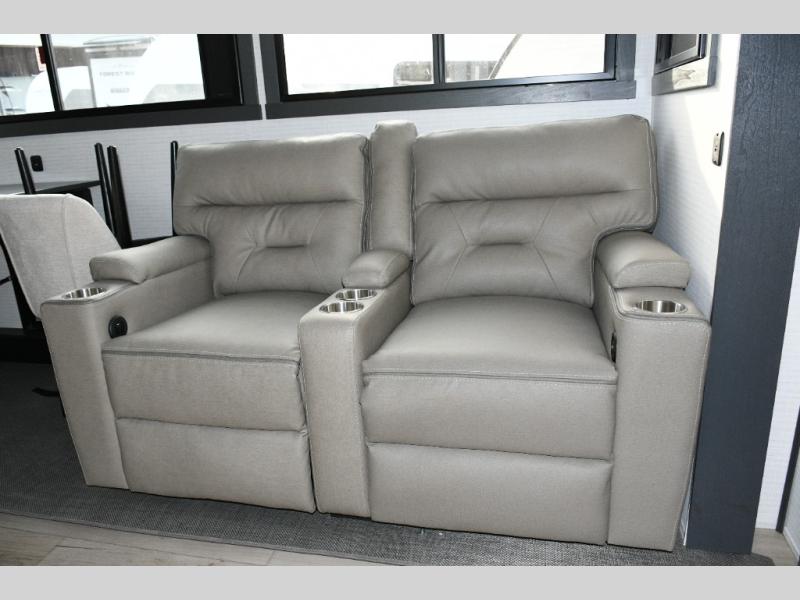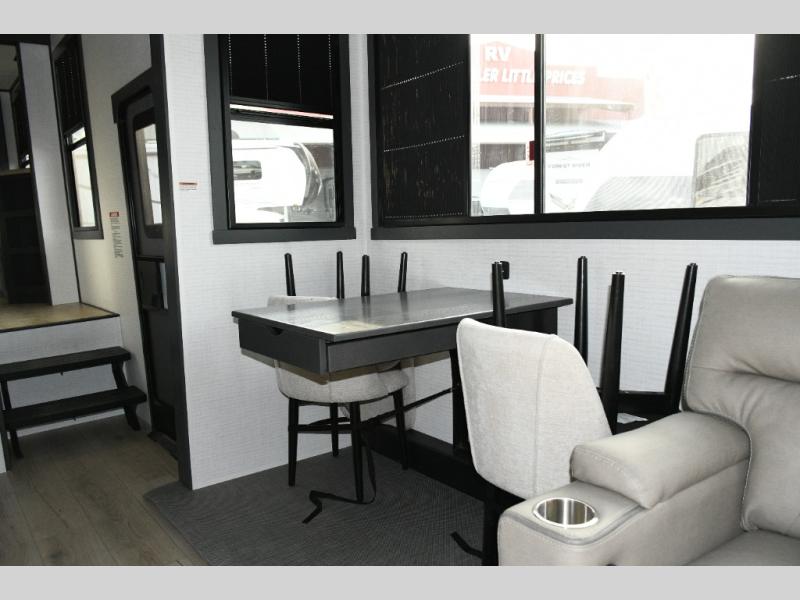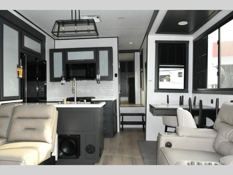 Move toward the middle of the fifth wheel to enjoy a kitchen with a waterfall sink, 16 cu. ft. refrigerator, and ample counter space for preparing meals. Relax on the L-shaped sofa or in the theater seating while watching your favorite shows or enjoying family time. The dinette with chairs provides another option for dining, gaming, or planning your next adventure.