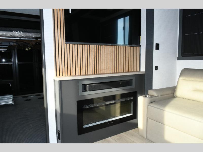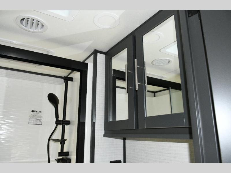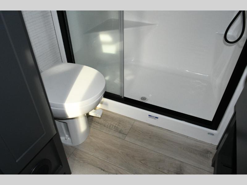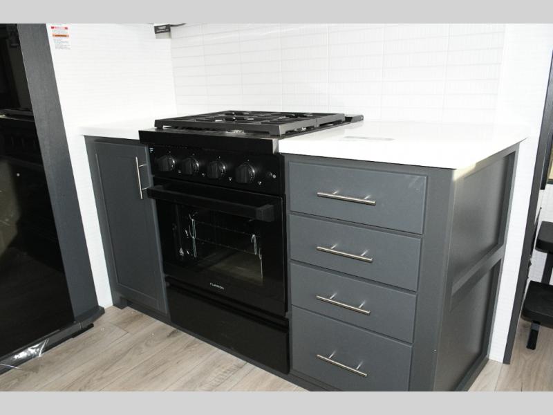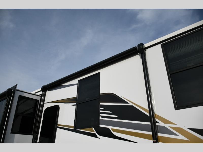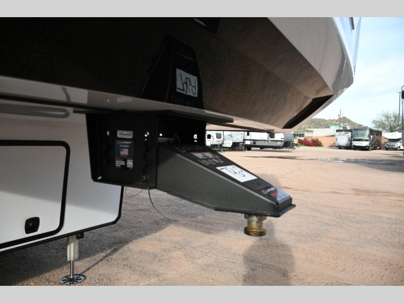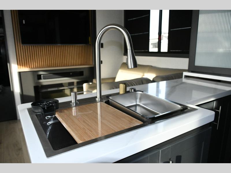 Move toward the middle of the fifth wheel to enjoy a kitchen with a waterfall sink, 16 cu. ft. refrigerator, and ample counter space for preparing meals. Relax on the L-shaped sofa or in the theater seating while watching your favorite shows or enjoying family time. The dinette with chairs provides another option for dining, gaming, or planning your next adventure.
