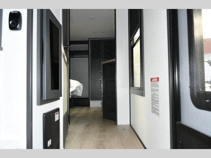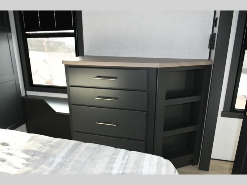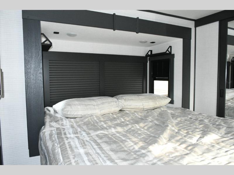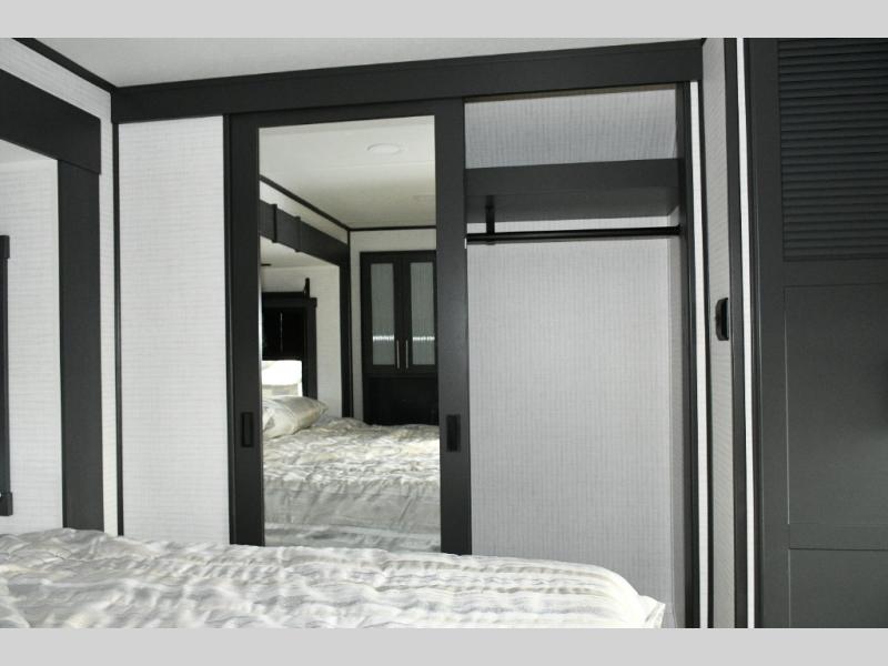 The front private bedroom features a king bed slide out, plenty of storage for clothes, shoes, and personal items, and its own sense of privacy for the owners. With this setup, everyone in the RV has their own space to recharge for the next day’s adventures.