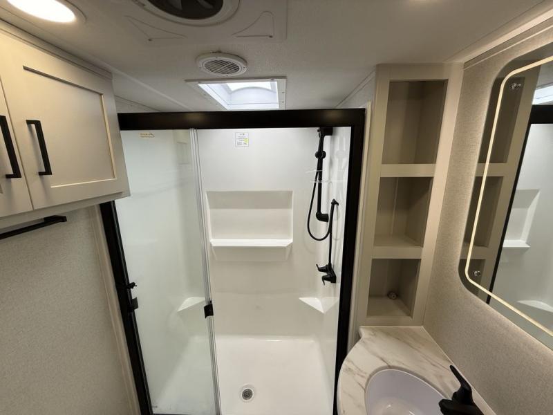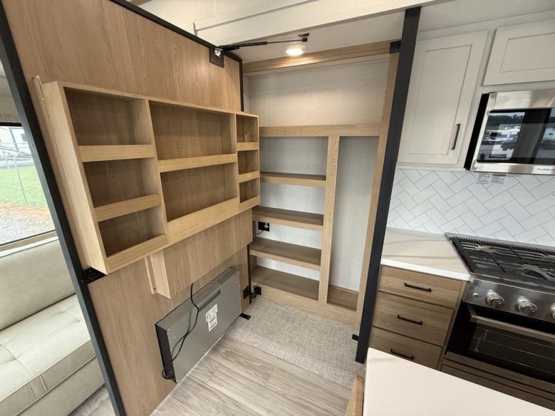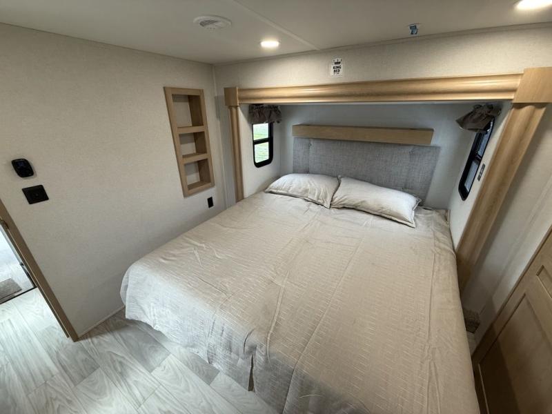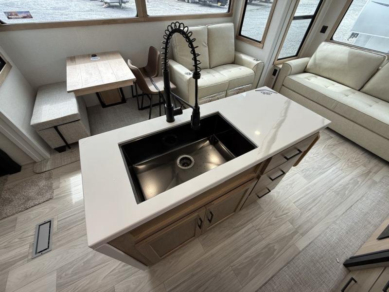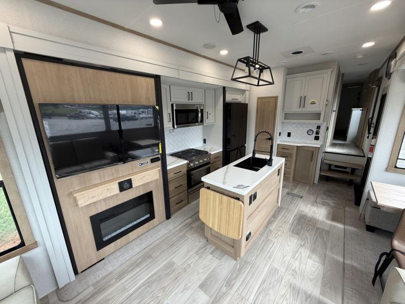 You’ll enjoy every adventure in this Sierra fifth wheel, designed for couples who love to hit the road and make the most of every getaway. This Sierra features triple slides for added space, a large kitchen island, plus a free-standing dinette in the kitchen area which makes it feel a lot like home. When outside, you can enjoy being seated under the two power awnings with an LED light strip which is great for evening entertaining or relaxing. When it's time to get cleaned up and ready for bed, you will appreciate the spacious bath with a one-piece fiberglass shower, a linen cabinet, and sink with a medicine cabinet as well. A front private bedroom with king bed slide will provide you with a great night's rest, and the large wardrobe has shelves for all your things. This model even has washer/dryer prep that will allow you to add a washer and dryer to make full-time easier than ever!