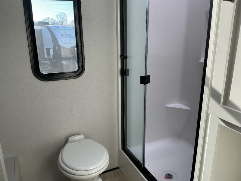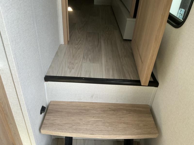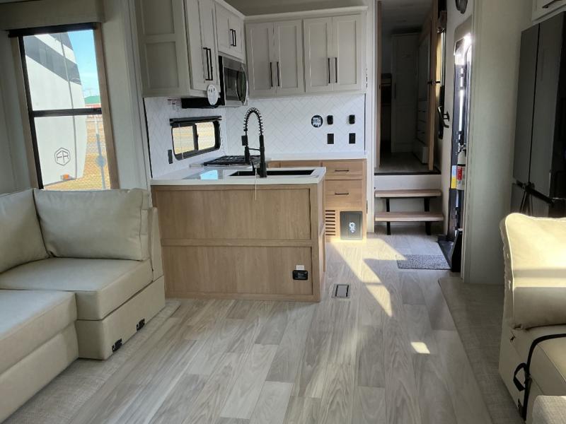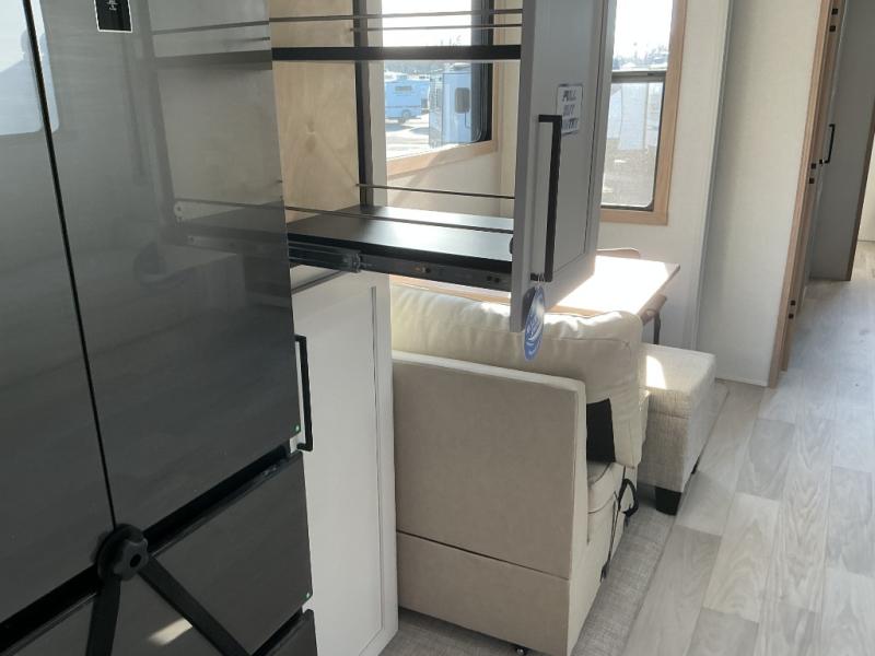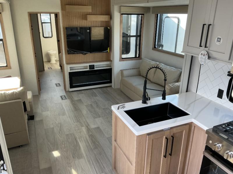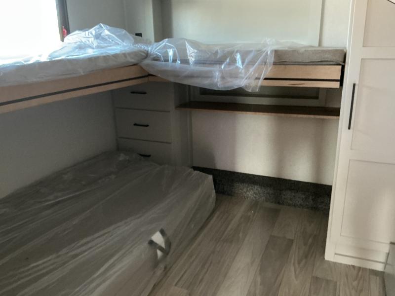 This Sierra fifth wheel is thoughtfully designed for comfort and convenience, starting with a spacious front bunkhouse perfect for accommodating guests. It features two flip-up bunks, 28" x 74" and 32" x 74" and a 60" x 74" fold-out lounge, along with a wardrobe, dresser, and additional storage to keep essentials organized. A nearby half bath adds easy access and extra convenience. At the center of the unit, the kitchen offers everything you need to prepare meals, including a stainless-steel sink, three-burner cooktop, and a generous 16 cu. ft. refrigerator. Meals can be enjoyed at the free-standing dinette, or you can unwind on the sectional sofa while enjoying the fireplace or entertainment center. At the rear, you'll find the private main bedroom with a roomy 66" x 80" RV king bed, plus its own wardrobe and dresser. Just steps away is the full bathroom featuring a one-piece fiberglass shower, sink with medicine cabinet, linen storage, and even washer/dryer prep for extended stays.