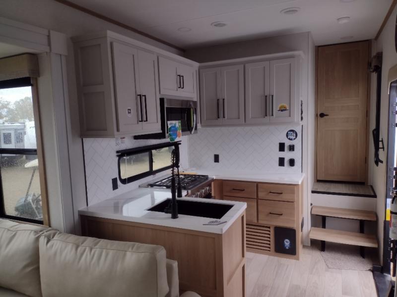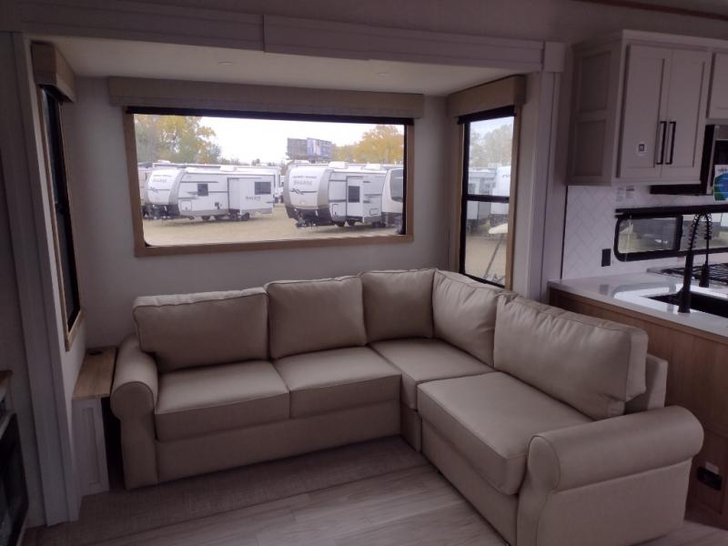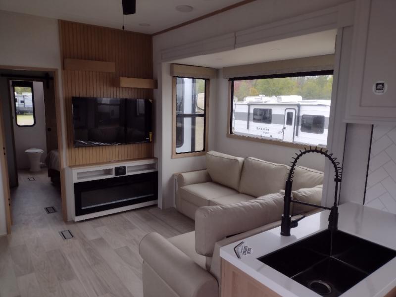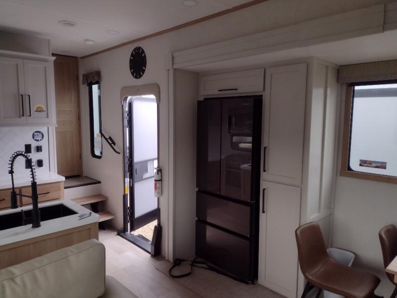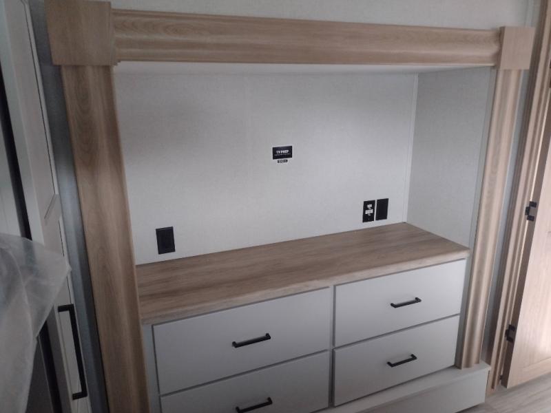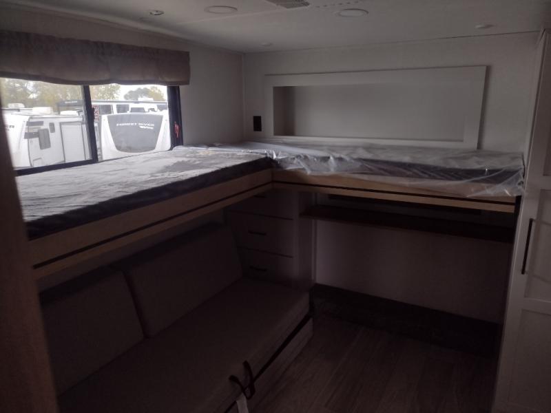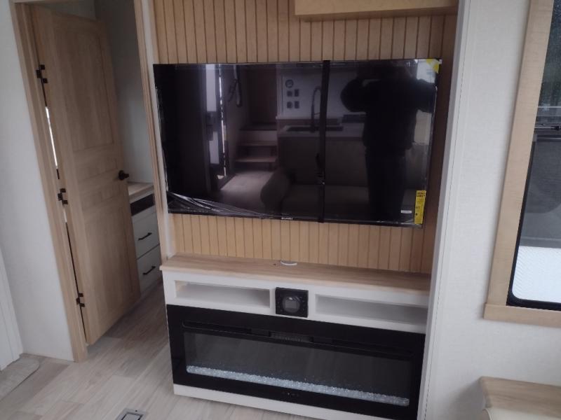 This Sierra fifth wheel is thoughtfully designed for comfort and convenience, starting with a spacious front bunkhouse perfect for accommodating guests. It features two flip-up bunks, 28" x 74" and 32" x 74" and a 60" x 74" fold-out lounge, along with a wardrobe, dresser, and additional storage to keep essentials organized. A nearby half bath adds easy access and extra convenience. At the center of the unit, the kitchen offers everything you need to prepare meals, including a stainless-steel sink, three-burner cooktop, and a generous 16 cu. ft. refrigerator. Meals can be enjoyed at the free-standing dinette, or you can unwind on the sectional sofa while enjoying the fireplace or entertainment center. At the rear, you'll find the private main bedroom with a roomy 66" x 80" RV king bed, plus its own wardrobe and dresser. Just steps away is the full bathroom featuring a one-piece fiberglass shower, sink with medicine cabinet, linen storage, and even washer/dryer prep for extended stays.