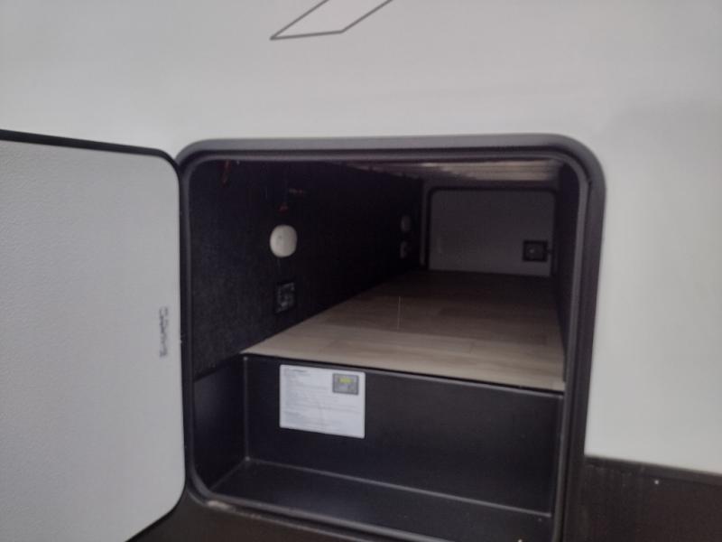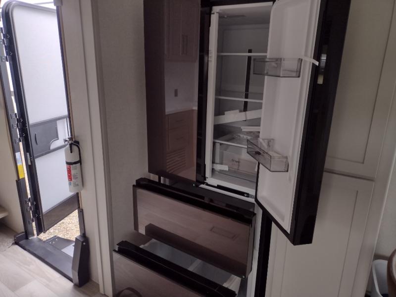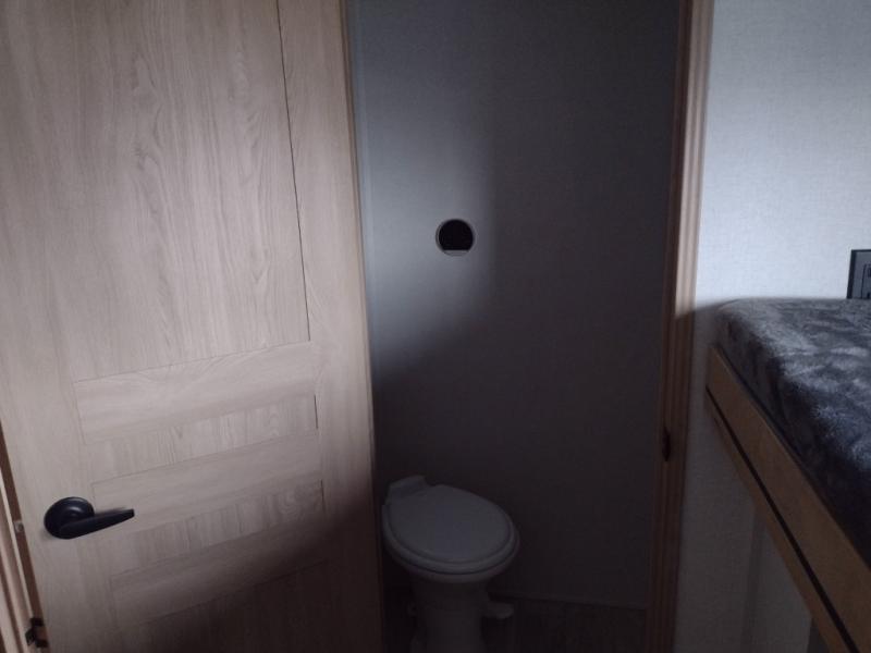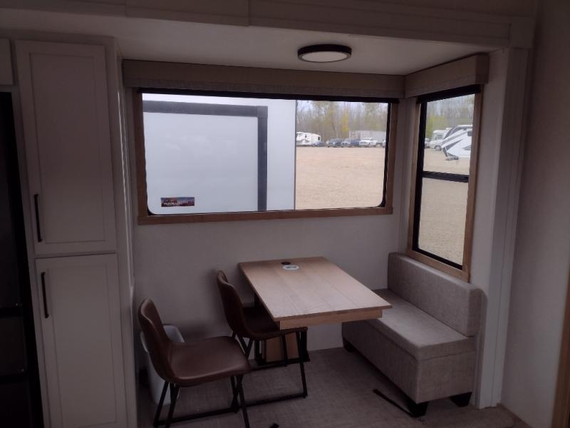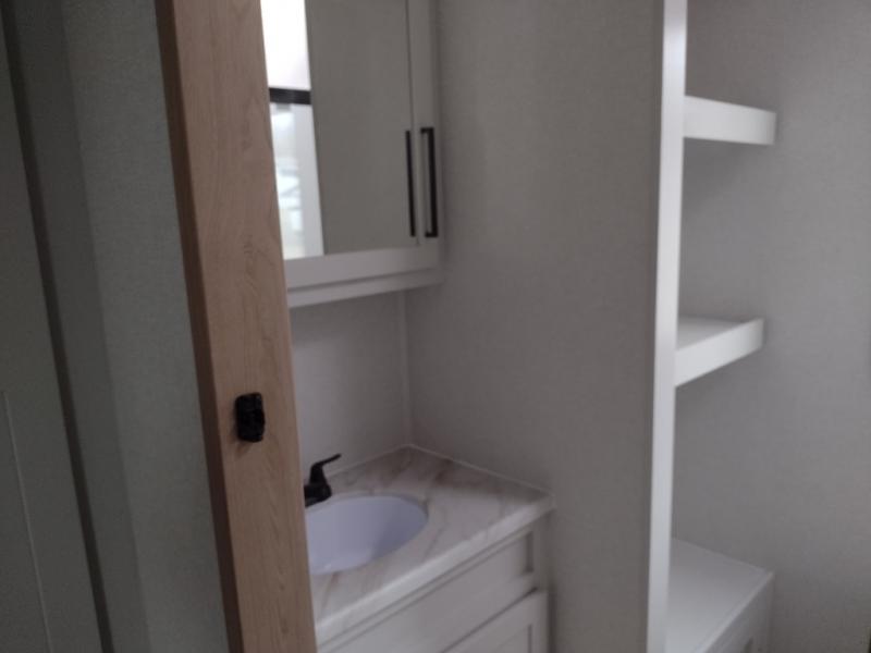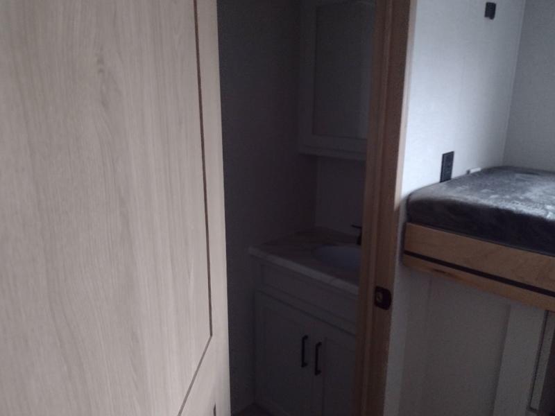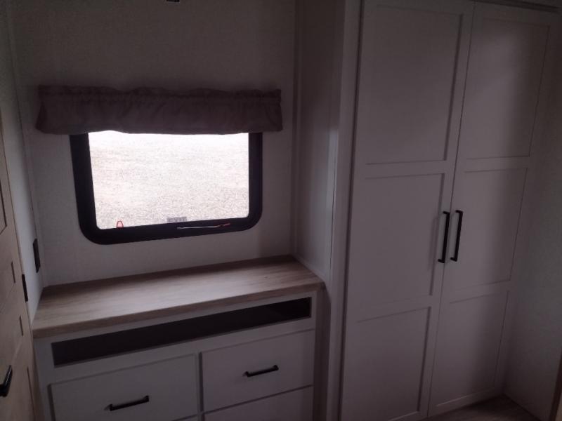 This Sierra fifth wheel is thoughtfully designed for comfort and convenience, starting with a spacious front bunkhouse perfect for accommodating guests. It features two flip-up bunks, 28" x 74" and 32" x 74" and a 60" x 74" fold-out lounge, along with a wardrobe, dresser, and additional storage to keep essentials organized. A nearby half bath adds easy access and extra convenience. At the center of the unit, the kitchen offers everything you need to prepare meals, including a stainless-steel sink, three-burner cooktop, and a generous 16 cu. ft. refrigerator. Meals can be enjoyed at the free-standing dinette, or you can unwind on the sectional sofa while enjoying the fireplace or entertainment center. At the rear, you'll find the private main bedroom with a roomy 66" x 80" RV king bed, plus its own wardrobe and dresser. Just steps away is the full bathroom featuring a one-piece fiberglass shower, sink with medicine cabinet, linen storage, and even washer/dryer prep for extended stays.