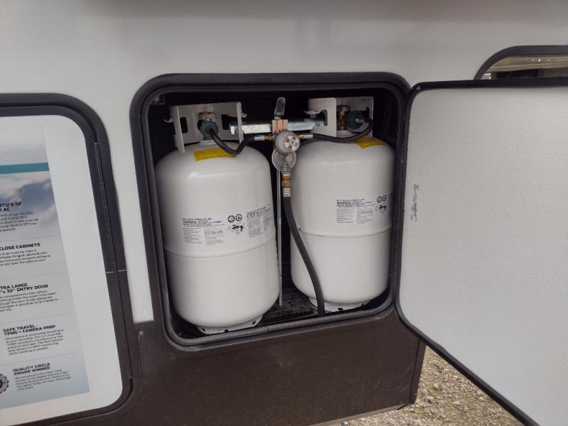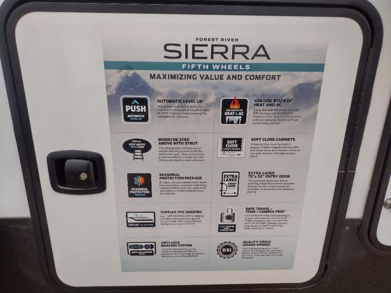 Each one of these Forest River Sierra fifth wheels are equipped with everything you need to make the most of each adventure! The underbelly armor will protect your unit's vitals from road debris and the painted two tone aerodynamic fiberglass front cap has an improved turning radius to make them easier to navigate. With an electric leveling system, you can set your unit up quick and easy then get to having fun faster than ever. The cambered powder coated frame with rust prohibitor construction allows for more duration of the fifth wheel. Each model also comes with a TV antenna with booster, 60,000BTU on demand tankless water heater, Goodyear Radial tires with 7,000 lb. axles, and the list goes on. The interior is just as impressive with Beachside Sundance Congoleum linoleum, recessed residential lighting, a memory foam mattress, and hidden hinged, soft close drawers and cabinets!