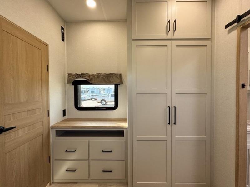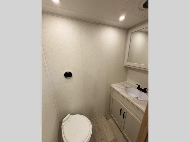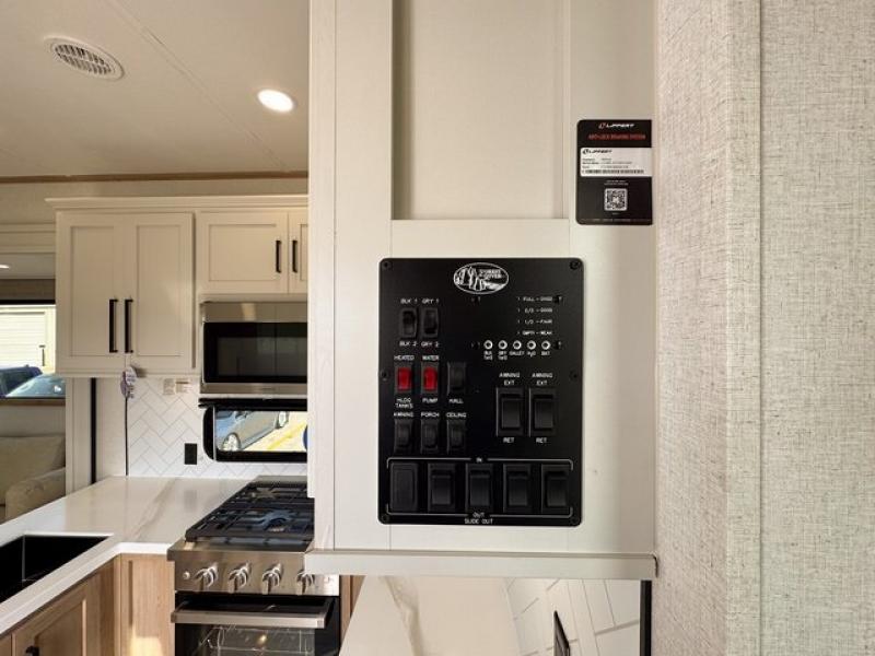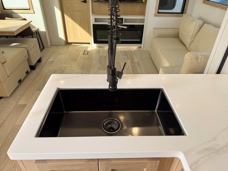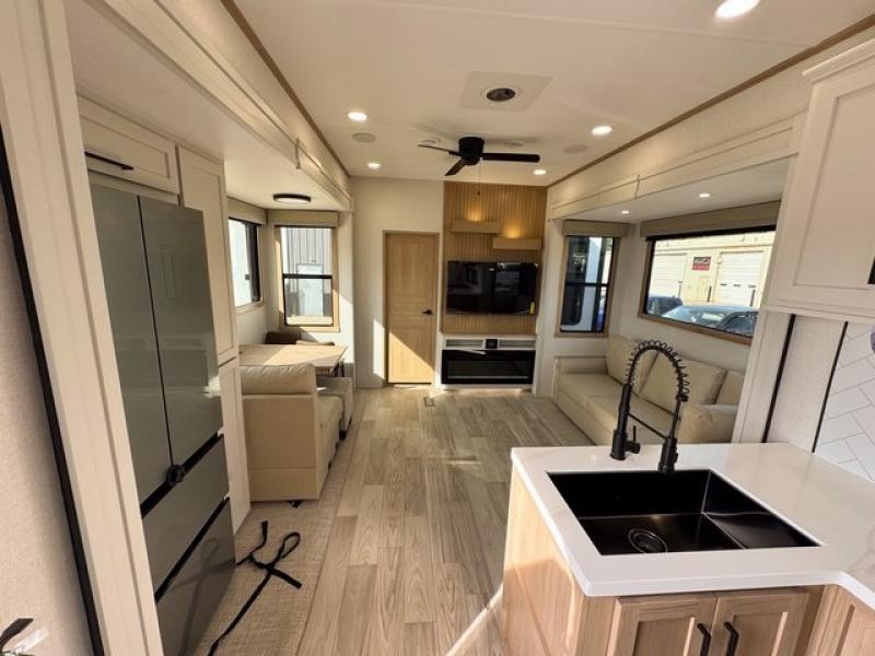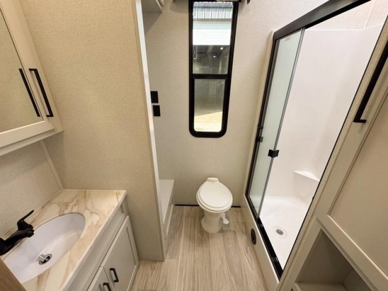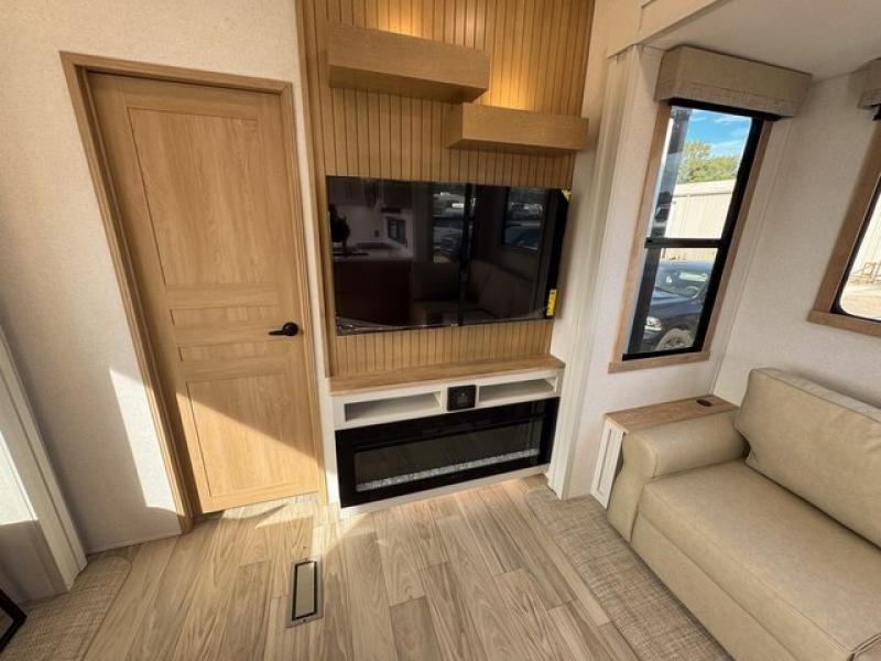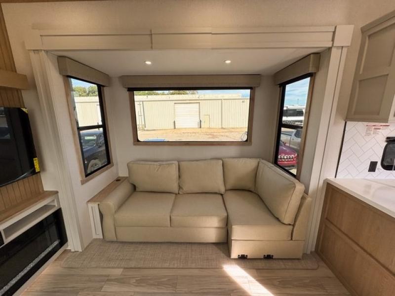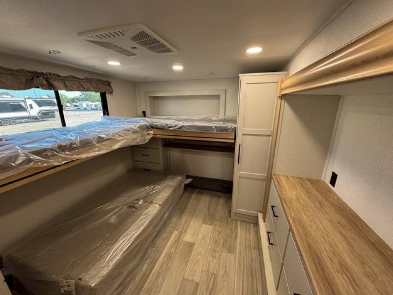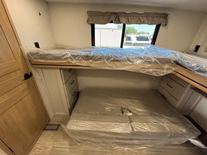 This Sierra fifth wheel is thoughtfully designed for comfort and convenience, starting with a spacious front bunkhouse perfect for accommodating guests. It features two flip-up bunks, 28" x 74" and 32" x 74" and a 60" x 74" fold-out lounge, along with a wardrobe, dresser, and additional storage to keep essentials organized. A nearby half bath adds easy access and extra convenience. At the center of the unit, the kitchen offers everything you need to prepare meals, including a stainless-steel sink, three-burner cooktop, and a generous 16 cu. ft. refrigerator. Meals can be enjoyed at the free-standing dinette, or you can unwind on the sectional sofa while enjoying the fireplace or entertainment center. At the rear, you'll find the private main bedroom with a roomy 66" x 80" RV king bed, plus its own wardrobe and dresser. Just steps away is the full bathroom featuring a one-piece fiberglass shower, sink with medicine cabinet, linen storage, and even washer/dryer prep for extended stays.