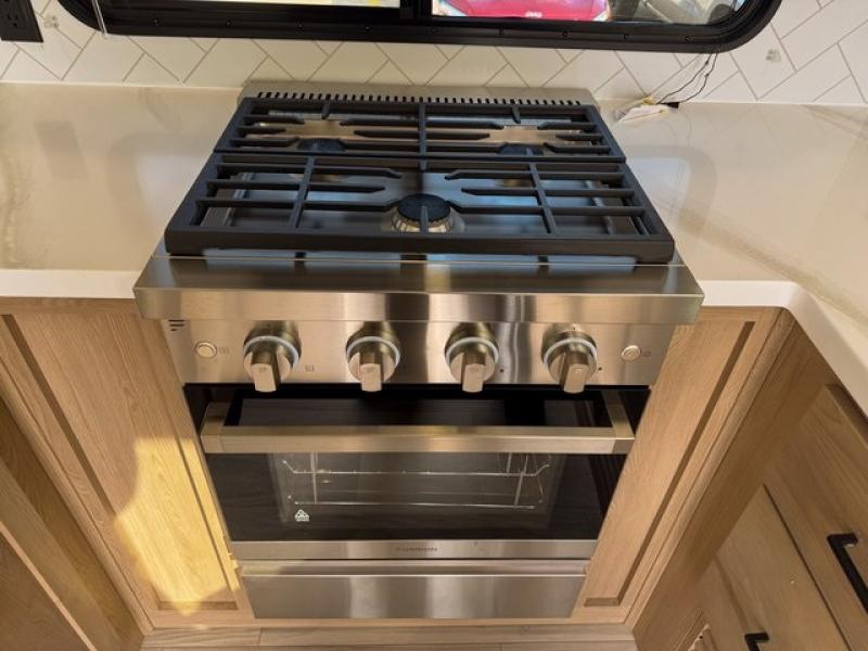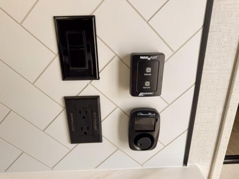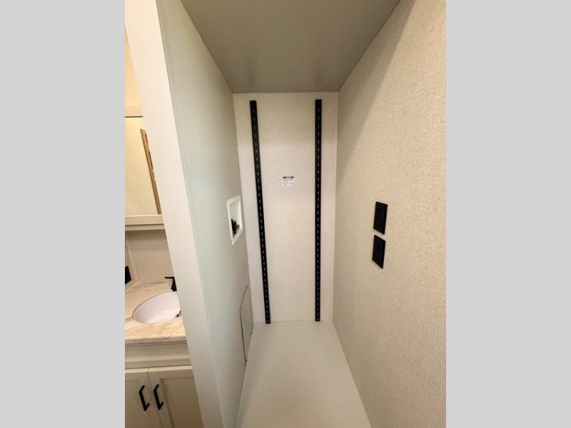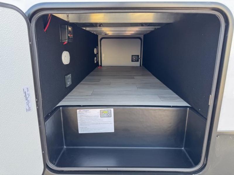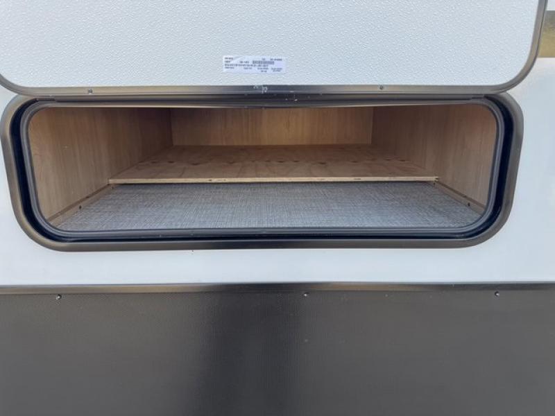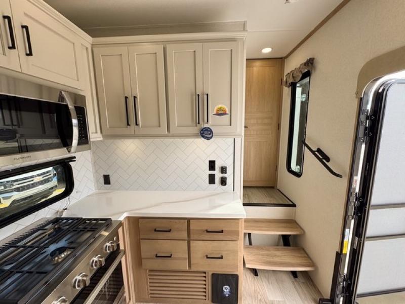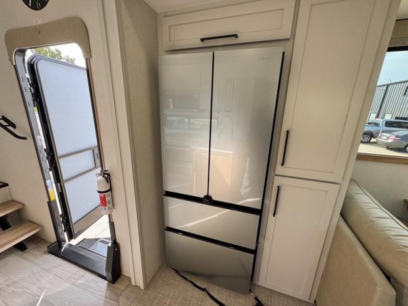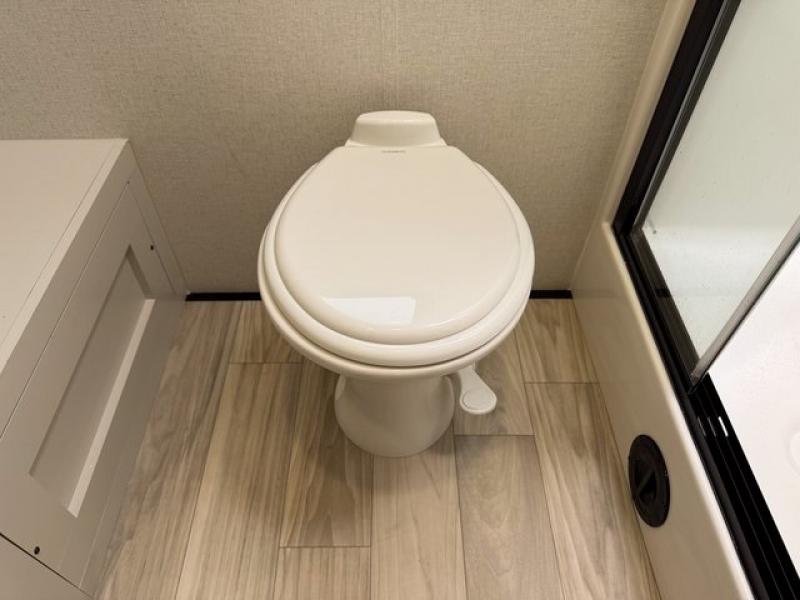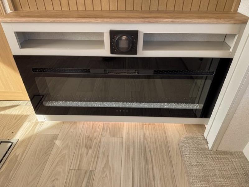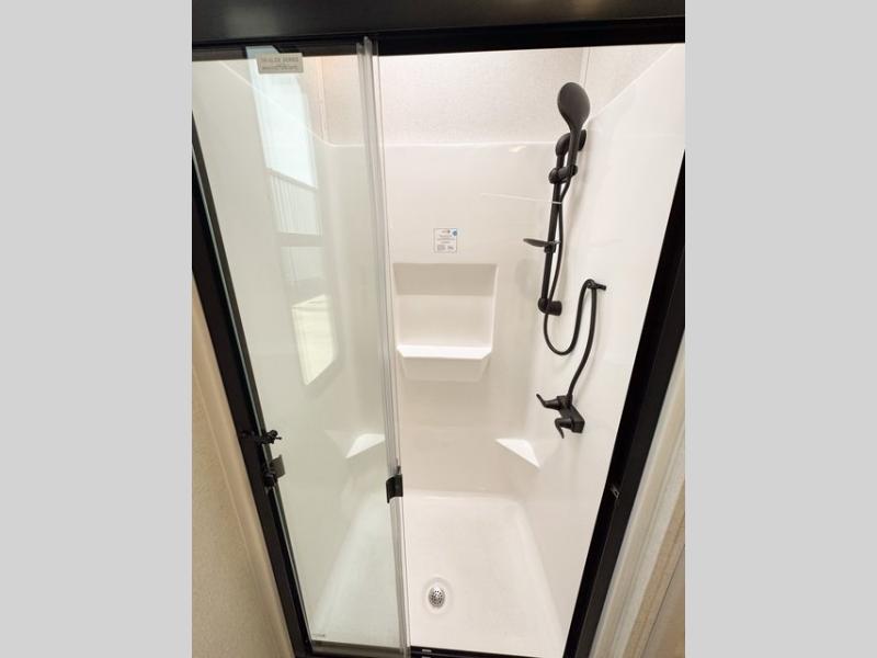 This Sierra fifth wheel is thoughtfully designed for comfort and convenience, starting with a spacious front bunkhouse perfect for accommodating guests. It features two flip-up bunks, 28" x 74" and 32" x 74" and a 60" x 74" fold-out lounge, along with a wardrobe, dresser, and additional storage to keep essentials organized. A nearby half bath adds easy access and extra convenience. At the center of the unit, the kitchen offers everything you need to prepare meals, including a stainless-steel sink, three-burner cooktop, and a generous 16 cu. ft. refrigerator. Meals can be enjoyed at the free-standing dinette, or you can unwind on the sectional sofa while enjoying the fireplace or entertainment center. At the rear, you'll find the private main bedroom with a roomy 66" x 80" RV king bed, plus its own wardrobe and dresser. Just steps away is the full bathroom featuring a one-piece fiberglass shower, sink with medicine cabinet, linen storage, and even washer/dryer prep for extended stays.