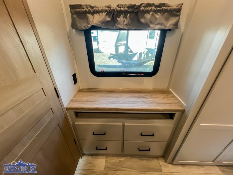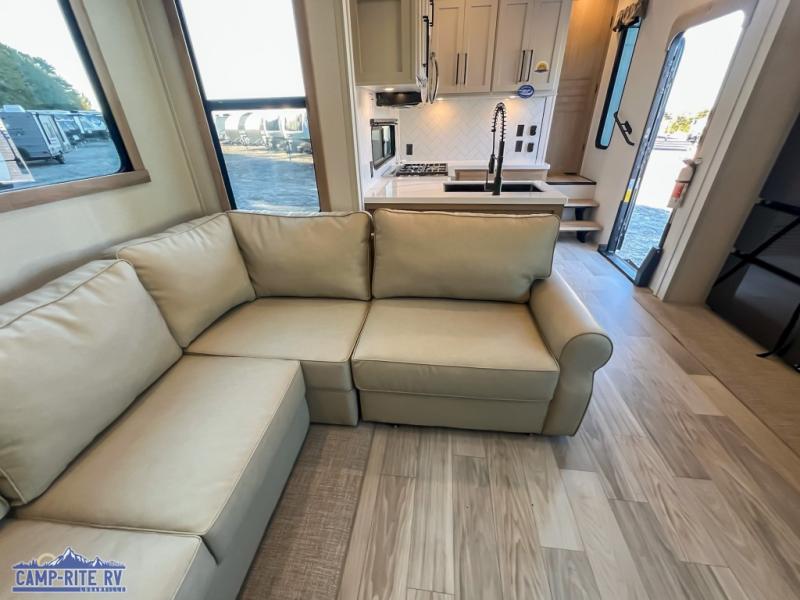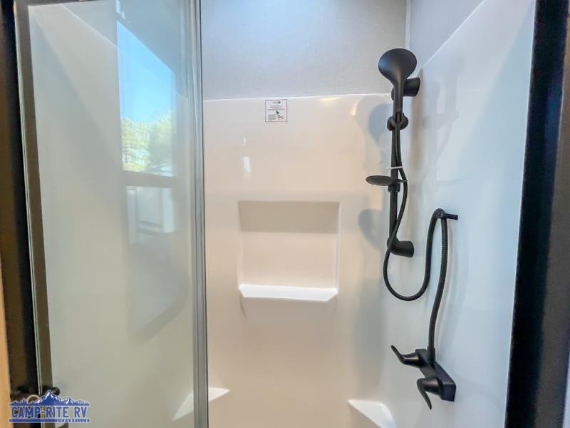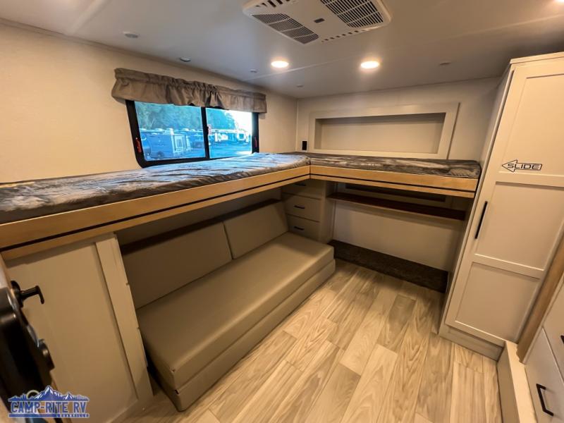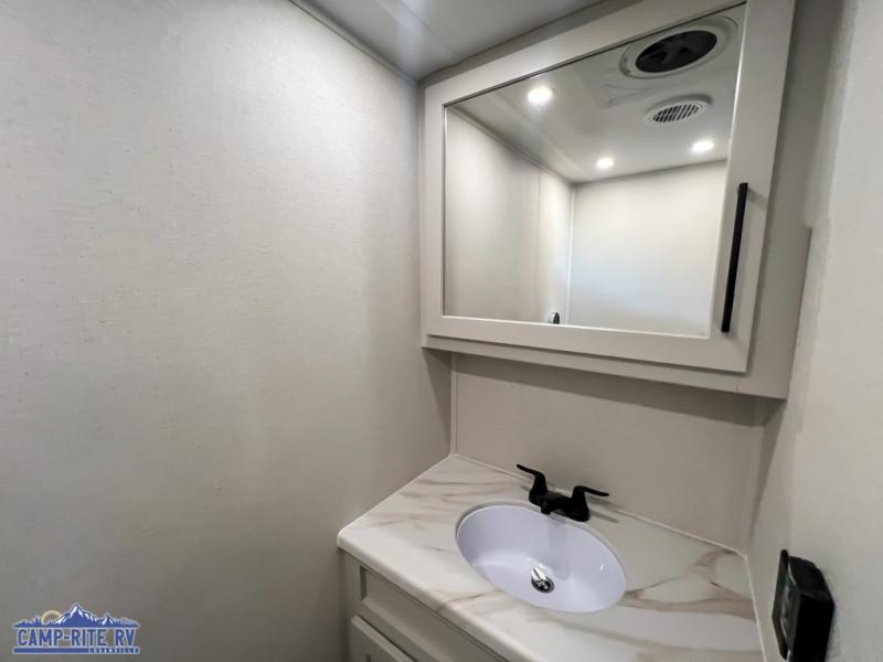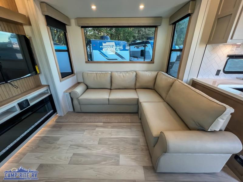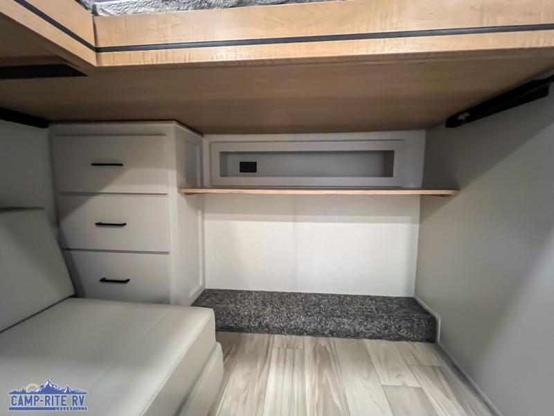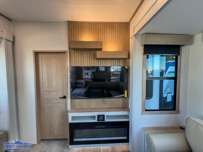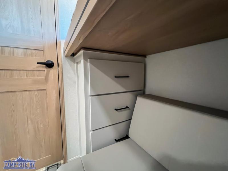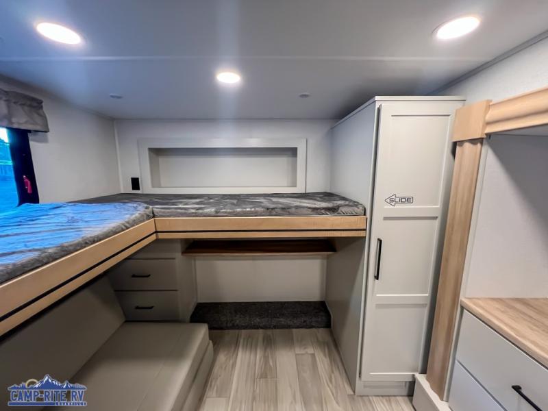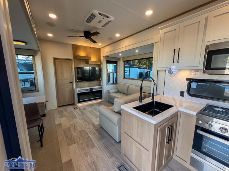 This Sierra fifth wheel is thoughtfully designed for comfort and convenience, starting with a spacious front bunkhouse perfect for accommodating guests. It features two flip-up bunks, 28" x 74" and 32" x 74" and a 60" x 74" fold-out lounge, along with a wardrobe, dresser, and additional storage to keep essentials organized. A nearby half bath adds easy access and extra convenience. At the center of the unit, the kitchen offers everything you need to prepare meals, including a stainless-steel sink, three-burner cooktop, and a generous 16 cu. ft. refrigerator. Meals can be enjoyed at the free-standing dinette, or you can unwind on the sectional sofa while enjoying the fireplace or entertainment center. At the rear, you'll find the private main bedroom with a roomy 66" x 80" RV king bed, plus its own wardrobe and dresser. Just steps away is the full bathroom featuring a one-piece fiberglass shower, sink with medicine cabinet, linen storage, and even washer/dryer prep for extended stays.