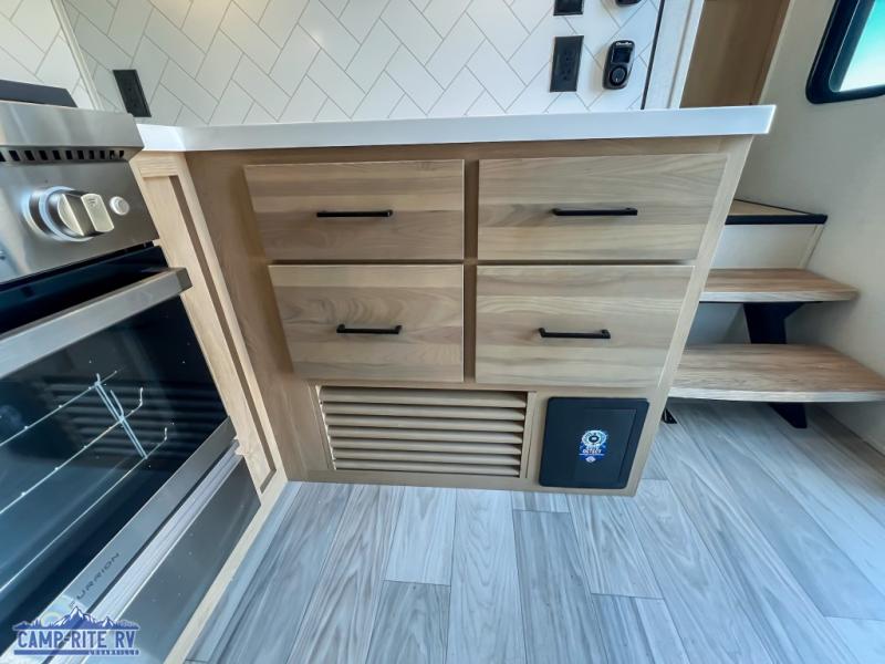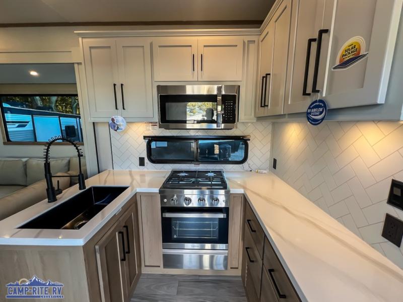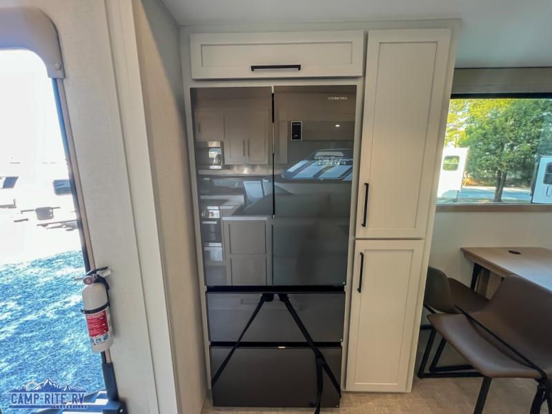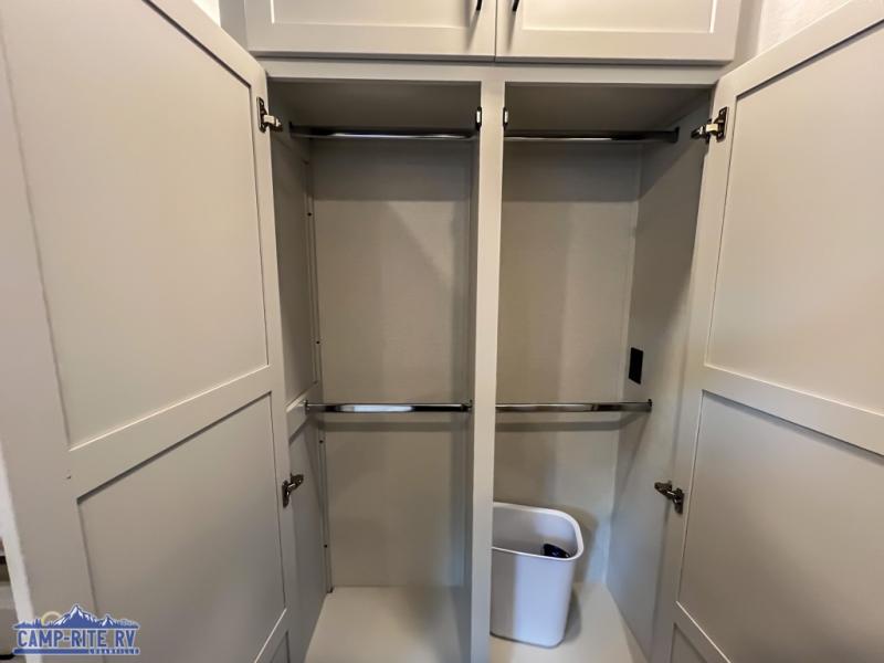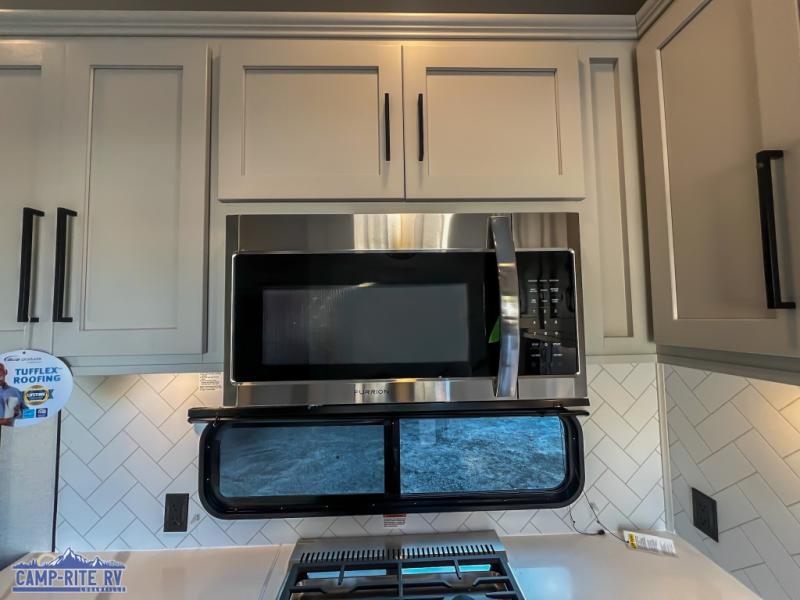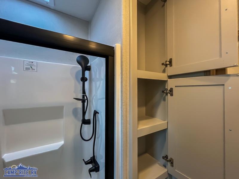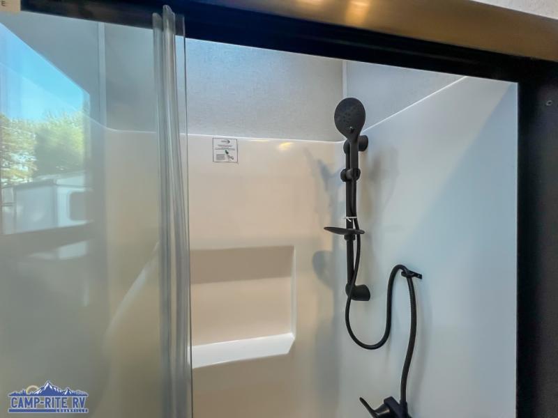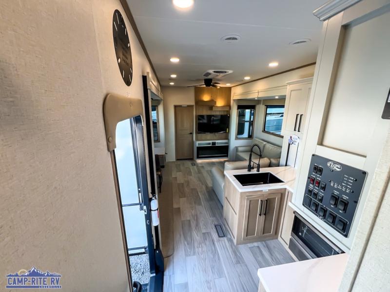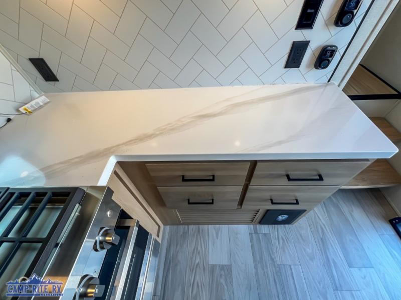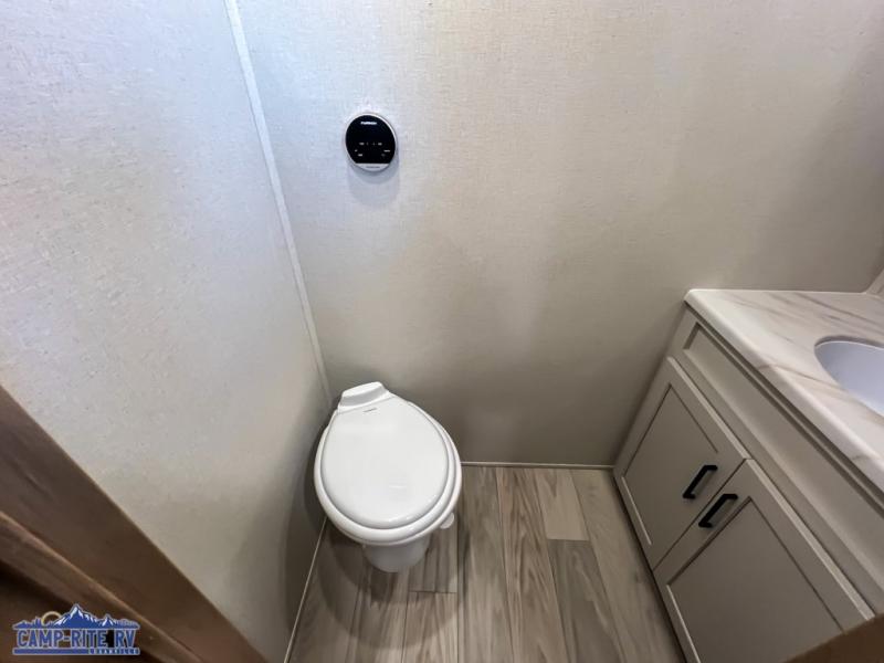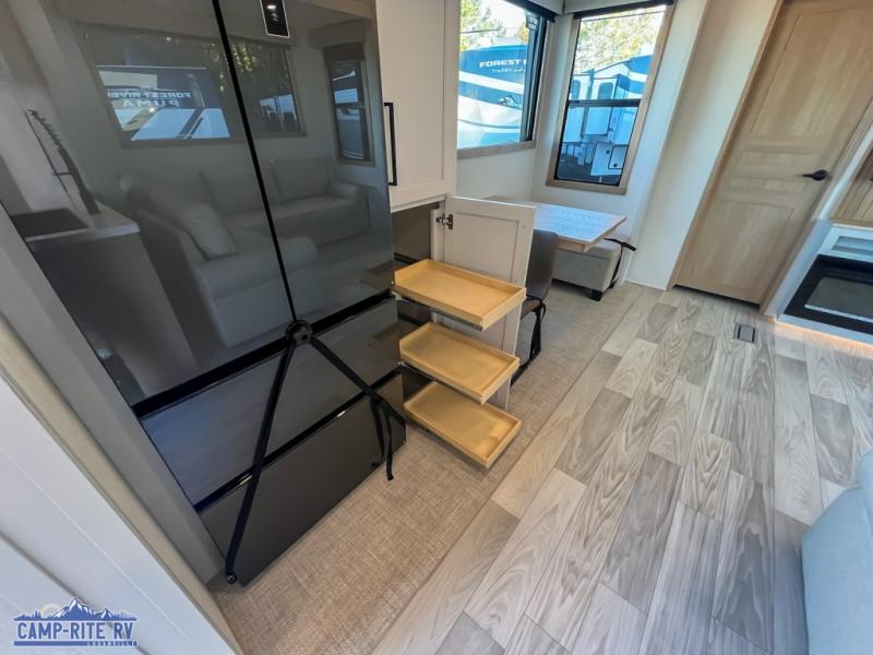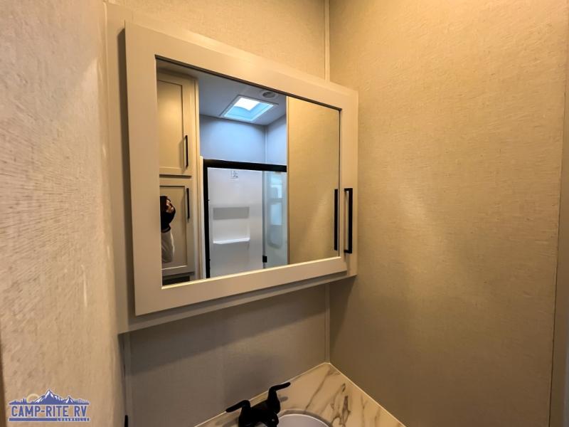 This Sierra fifth wheel is thoughtfully designed for comfort and convenience, starting with a spacious front bunkhouse perfect for accommodating guests. It features two flip-up bunks, 28" x 74" and 32" x 74" and a 60" x 74" fold-out lounge, along with a wardrobe, dresser, and additional storage to keep essentials organized. A nearby half bath adds easy access and extra convenience. At the center of the unit, the kitchen offers everything you need to prepare meals, including a stainless-steel sink, three-burner cooktop, and a generous 16 cu. ft. refrigerator. Meals can be enjoyed at the free-standing dinette, or you can unwind on the sectional sofa while enjoying the fireplace or entertainment center. At the rear, you'll find the private main bedroom with a roomy 66" x 80" RV king bed, plus its own wardrobe and dresser. Just steps away is the full bathroom featuring a one-piece fiberglass shower, sink with medicine cabinet, linen storage, and even washer/dryer prep for extended stays.