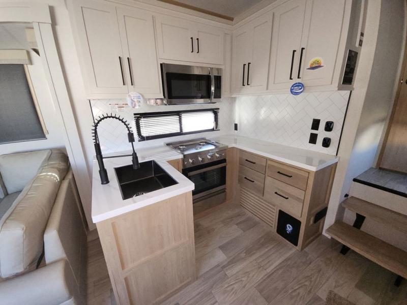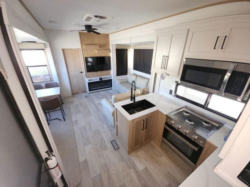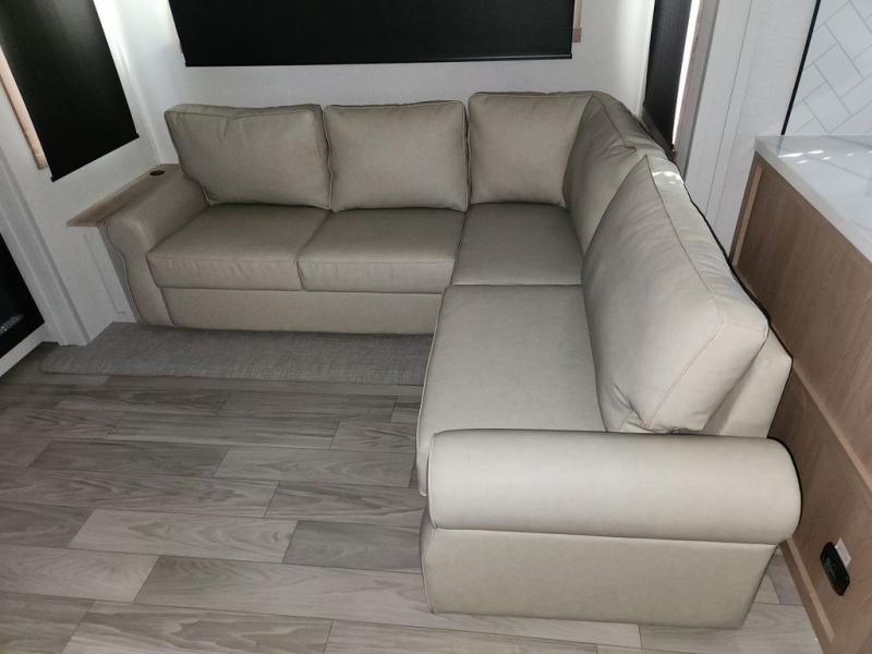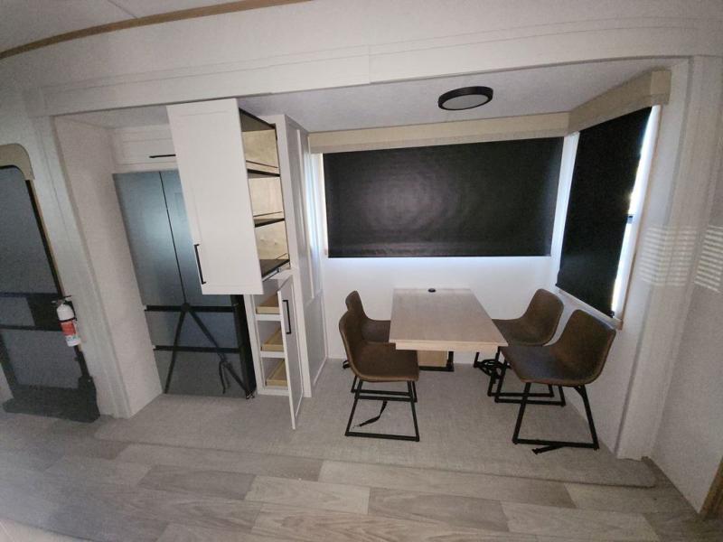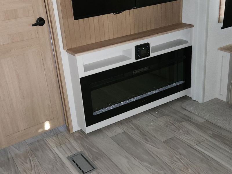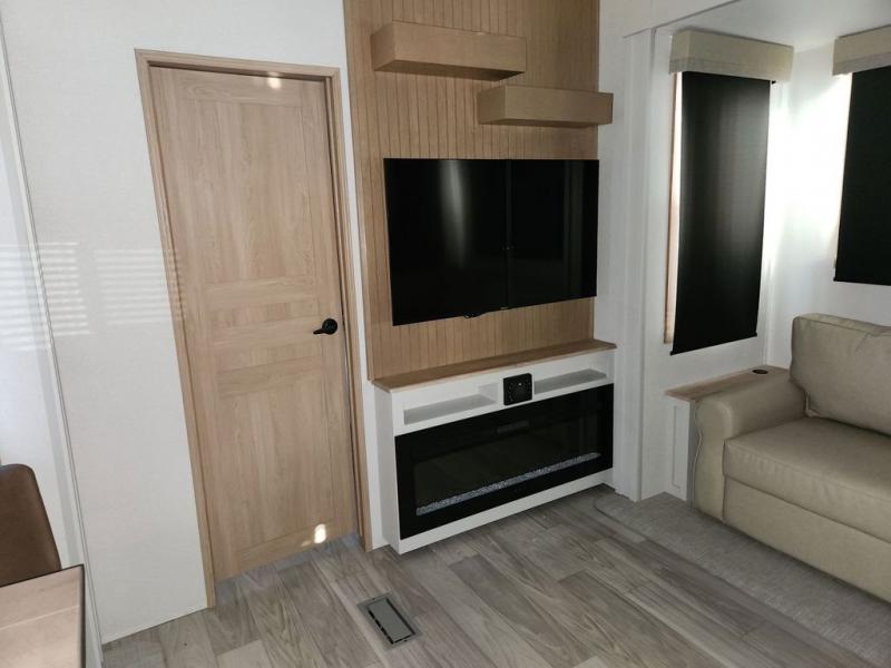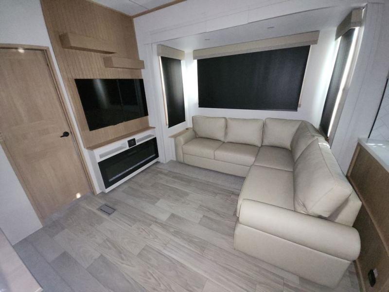 This Sierra fifth wheel is thoughtfully designed for comfort and convenience, starting with a spacious front bunkhouse perfect for accommodating guests. It features two flip-up bunks, 28" x 74" and 32" x 74" and a 60" x 74" fold-out lounge, along with a wardrobe, dresser, and additional storage to keep essentials organized. A nearby half bath adds easy access and extra convenience. At the center of the unit, the kitchen offers everything you need to prepare meals, including a stainless-steel sink, three-burner cooktop, and a generous 16 cu. ft. refrigerator. Meals can be enjoyed at the free-standing dinette, or you can unwind on the sectional sofa while enjoying the fireplace or entertainment center. At the rear, you'll find the private main bedroom with a roomy 66" x 80" RV king bed, plus its own wardrobe and dresser. Just steps away is the full bathroom featuring a one-piece fiberglass shower, sink with medicine cabinet, linen storage, and even washer/dryer prep for extended stays.