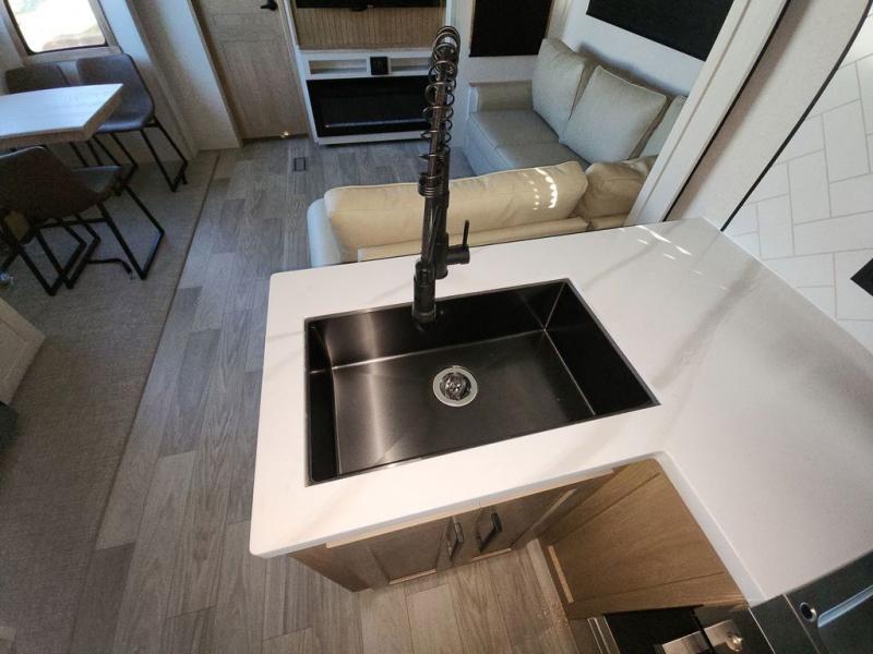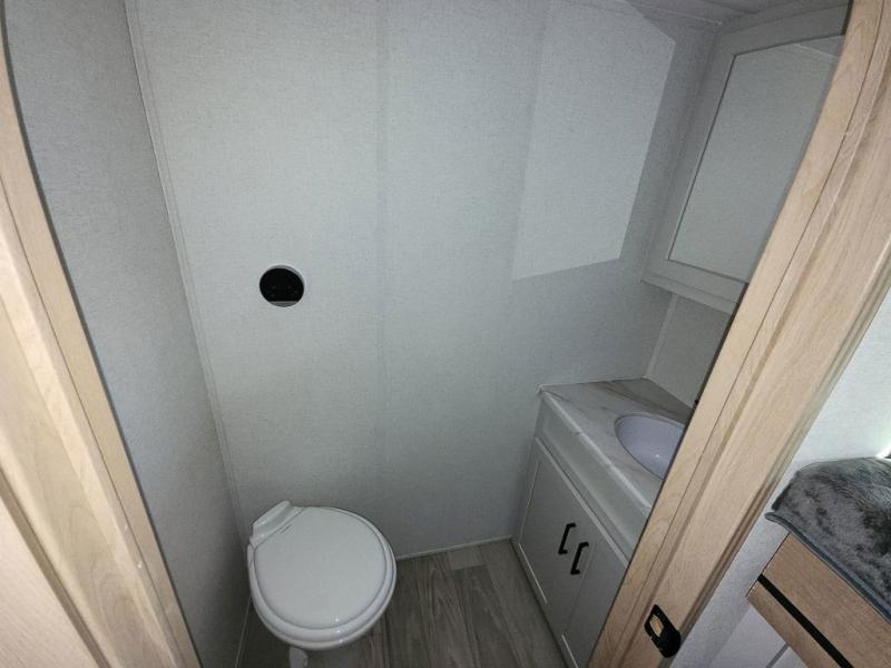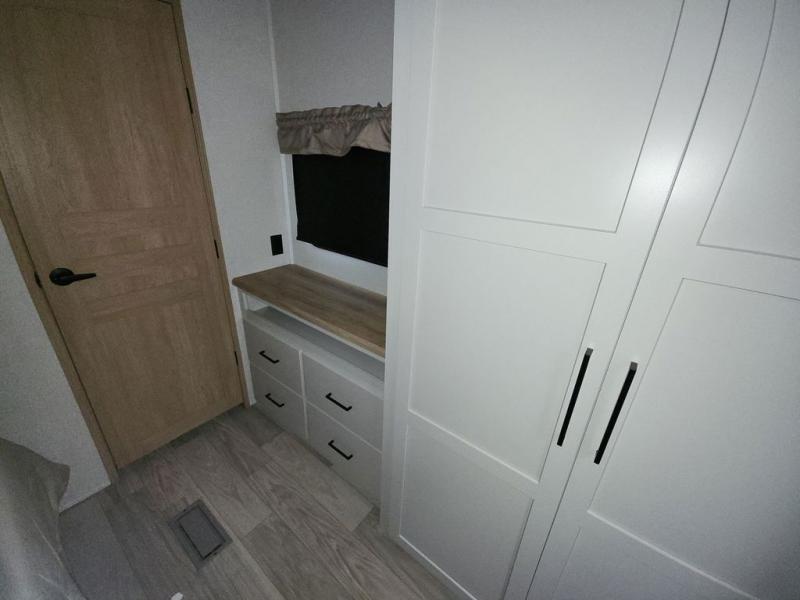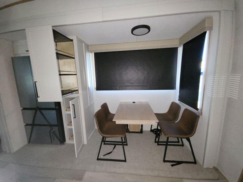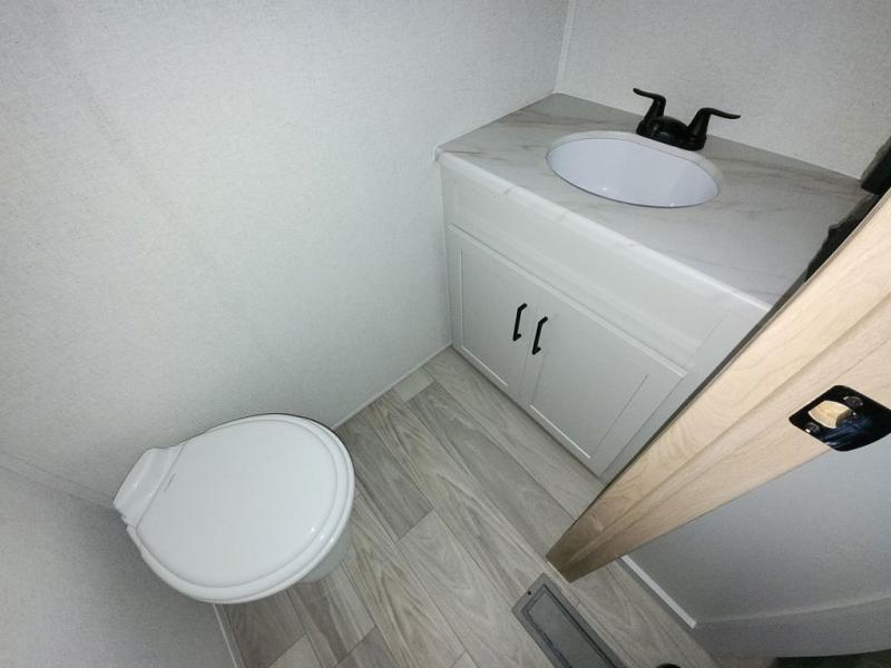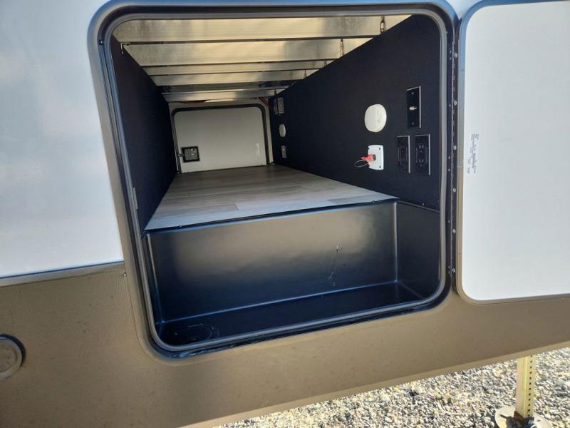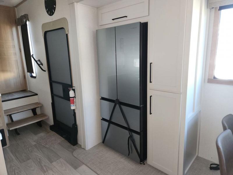 This Sierra fifth wheel is thoughtfully designed for comfort and convenience, starting with a spacious front bunkhouse perfect for accommodating guests. It features two flip-up bunks, 28" x 74" and 32" x 74" and a 60" x 74" fold-out lounge, along with a wardrobe, dresser, and additional storage to keep essentials organized. A nearby half bath adds easy access and extra convenience. At the center of the unit, the kitchen offers everything you need to prepare meals, including a stainless-steel sink, three-burner cooktop, and a generous 16 cu. ft. refrigerator. Meals can be enjoyed at the free-standing dinette, or you can unwind on the sectional sofa while enjoying the fireplace or entertainment center. At the rear, you'll find the private main bedroom with a roomy 66" x 80" RV king bed, plus its own wardrobe and dresser. Just steps away is the full bathroom featuring a one-piece fiberglass shower, sink with medicine cabinet, linen storage, and even washer/dryer prep for extended stays.
