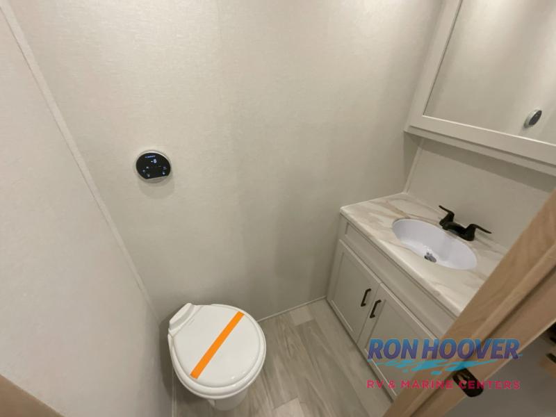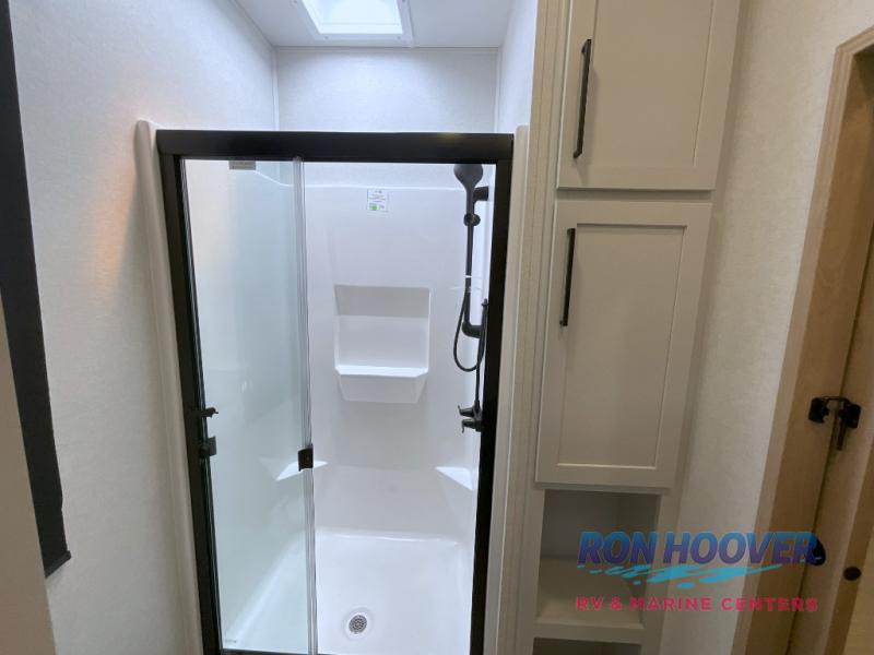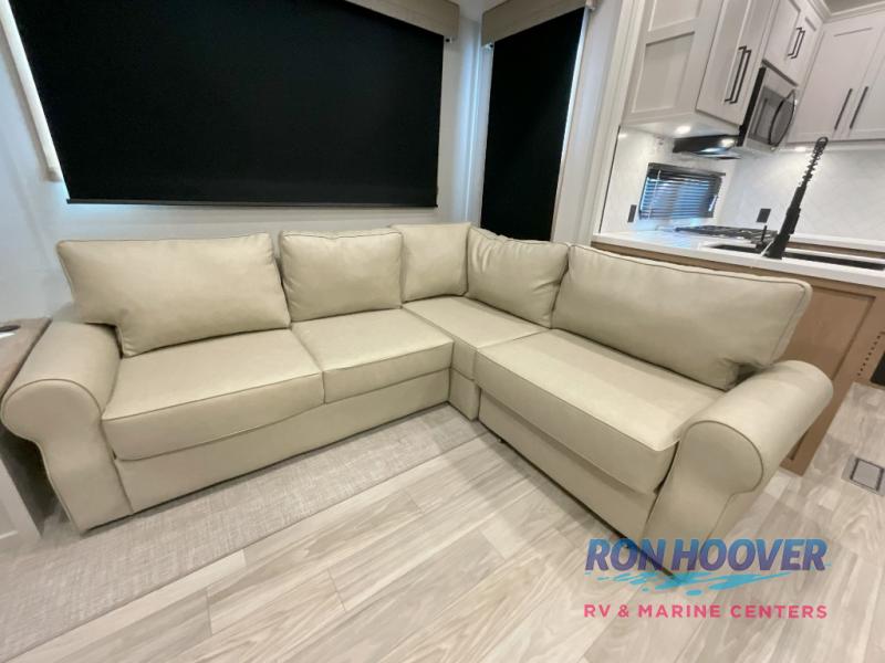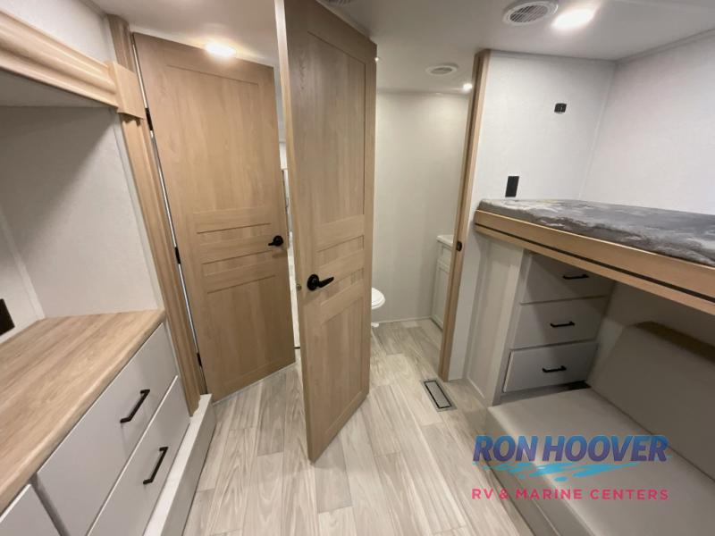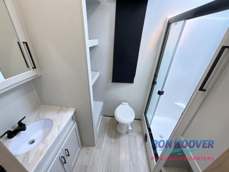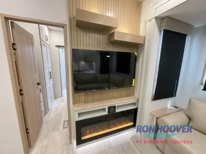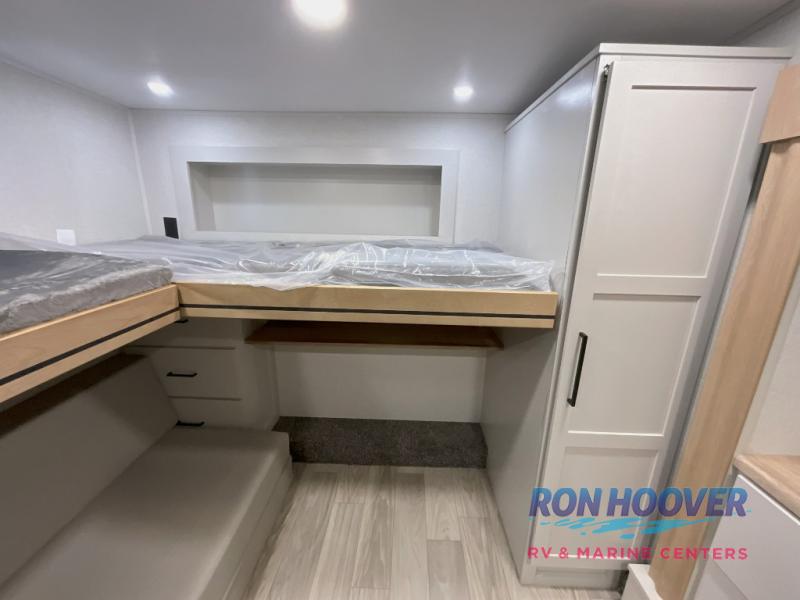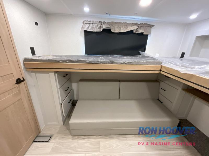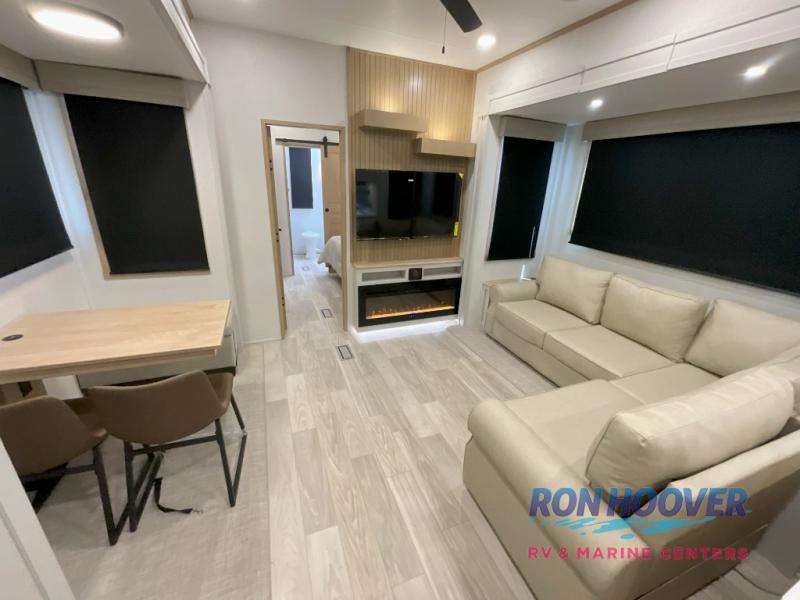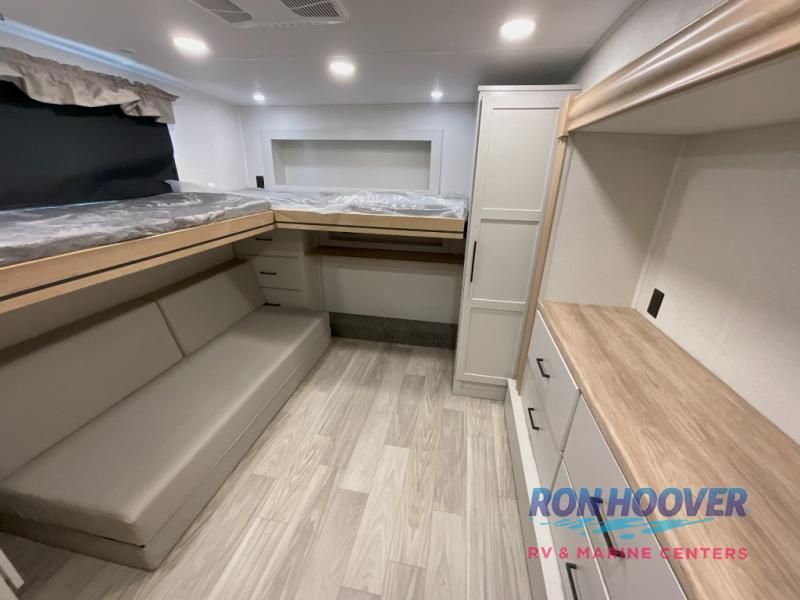 This Sierra fifth wheel is thoughtfully designed for comfort and convenience, starting with a spacious front bunkhouse perfect for accommodating guests. It features two flip-up bunks, 28" x 74" and 32" x 74" and a 60" x 74" fold-out lounge, along with a wardrobe, dresser, and additional storage to keep essentials organized. A nearby half bath adds easy access and extra convenience. At the center of the unit, the kitchen offers everything you need to prepare meals, including a stainless-steel sink, three-burner cooktop, and a generous 16 cu. ft. refrigerator. Meals can be enjoyed at the free-standing dinette, or you can unwind on the sectional sofa while enjoying the fireplace or entertainment center. At the rear, you'll find the private main bedroom with a roomy 66" x 80" RV king bed, plus its own wardrobe and dresser. Just steps away is the full bathroom featuring a one-piece fiberglass shower, sink with medicine cabinet, linen storage, and even washer/dryer prep for extended stays.