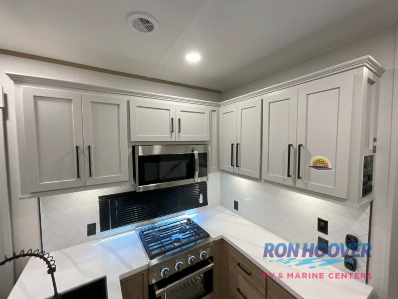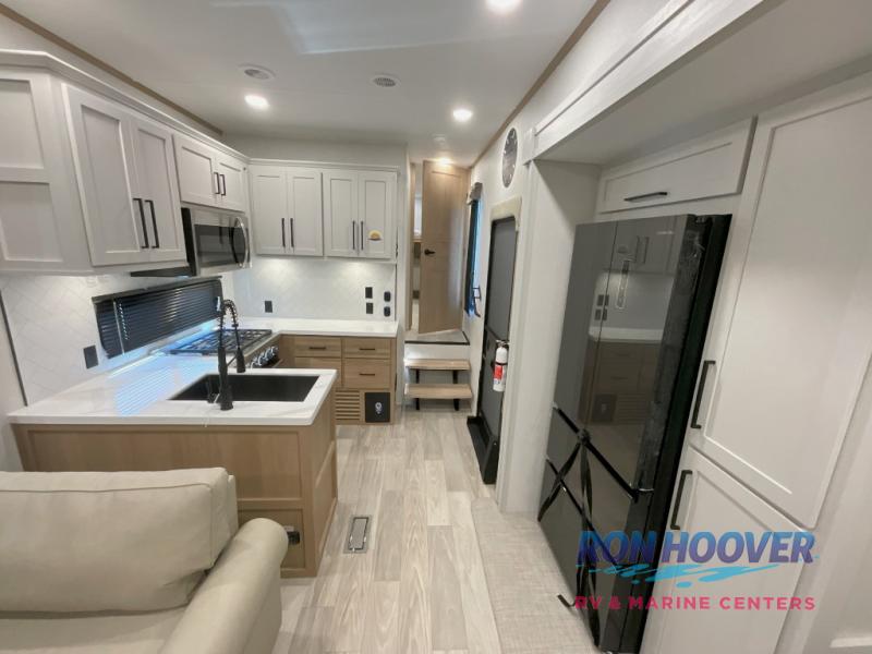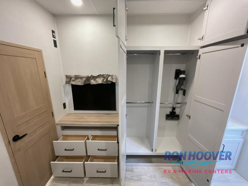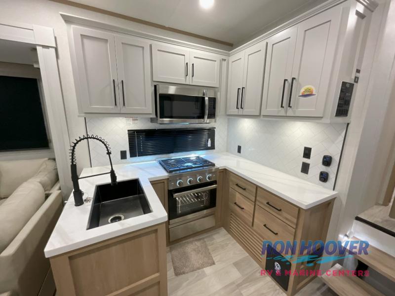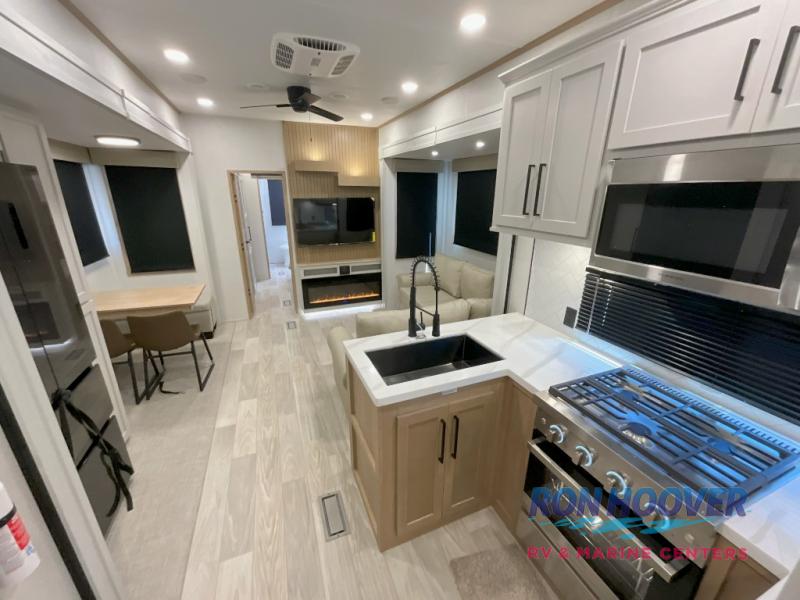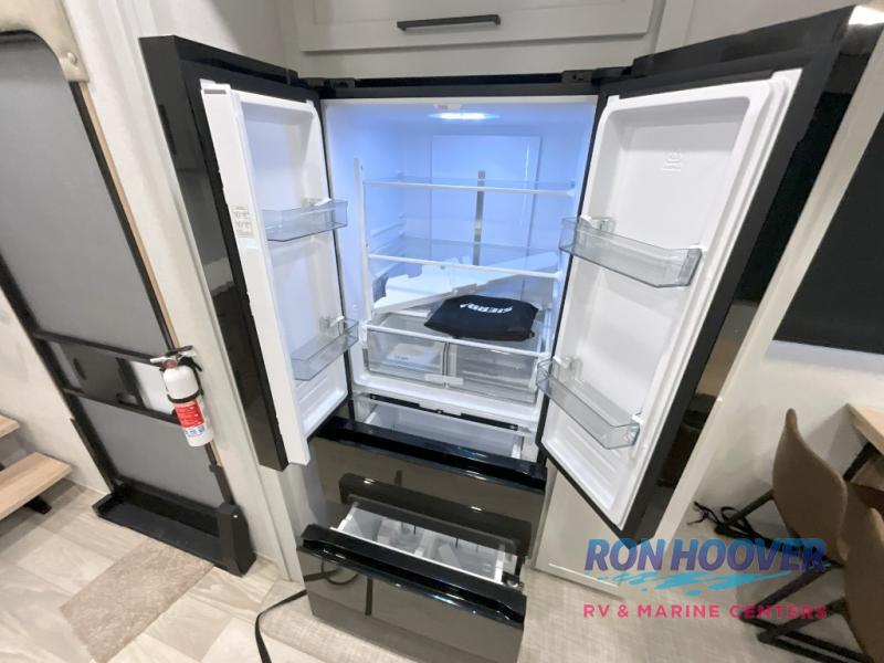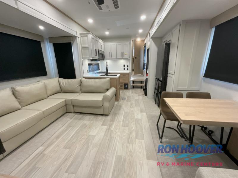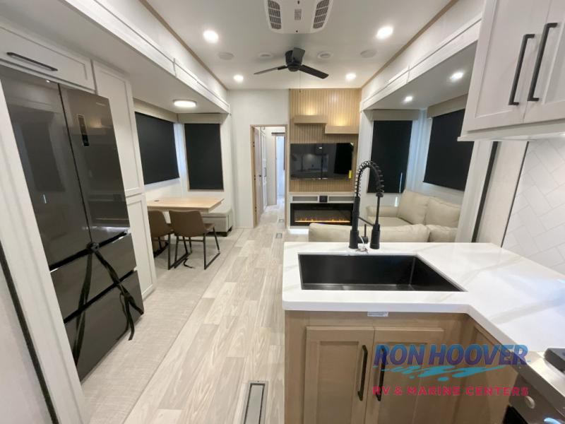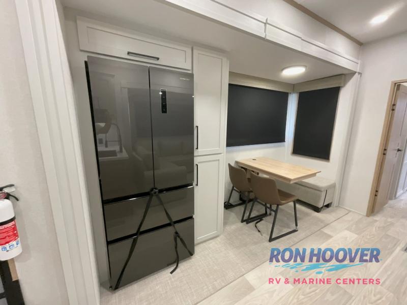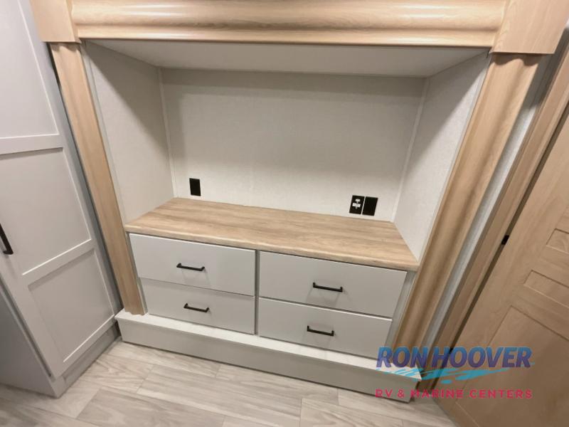 This Sierra fifth wheel is thoughtfully designed for comfort and convenience, starting with a spacious front bunkhouse perfect for accommodating guests. It features two flip-up bunks, 28" x 74" and 32" x 74" and a 60" x 74" fold-out lounge, along with a wardrobe, dresser, and additional storage to keep essentials organized. A nearby half bath adds easy access and extra convenience. At the center of the unit, the kitchen offers everything you need to prepare meals, including a stainless-steel sink, three-burner cooktop, and a generous 16 cu. ft. refrigerator. Meals can be enjoyed at the free-standing dinette, or you can unwind on the sectional sofa while enjoying the fireplace or entertainment center. At the rear, you'll find the private main bedroom with a roomy 66" x 80" RV king bed, plus its own wardrobe and dresser. Just steps away is the full bathroom featuring a one-piece fiberglass shower, sink with medicine cabinet, linen storage, and even washer/dryer prep for extended stays.