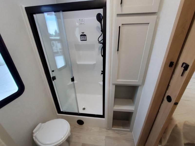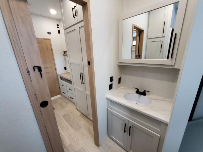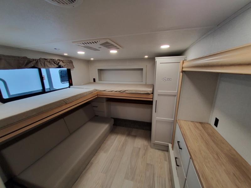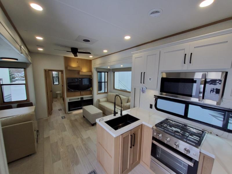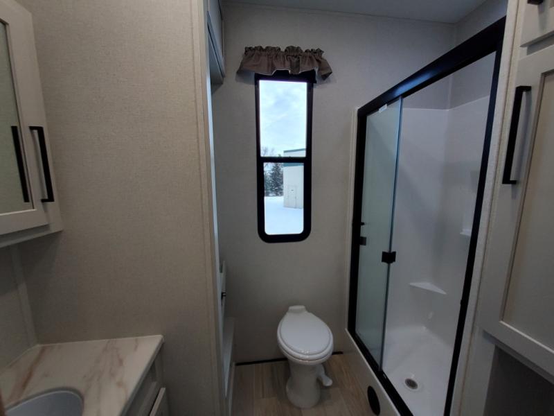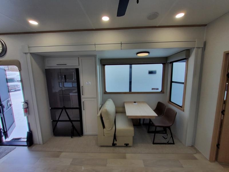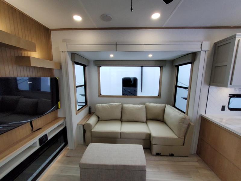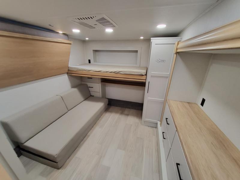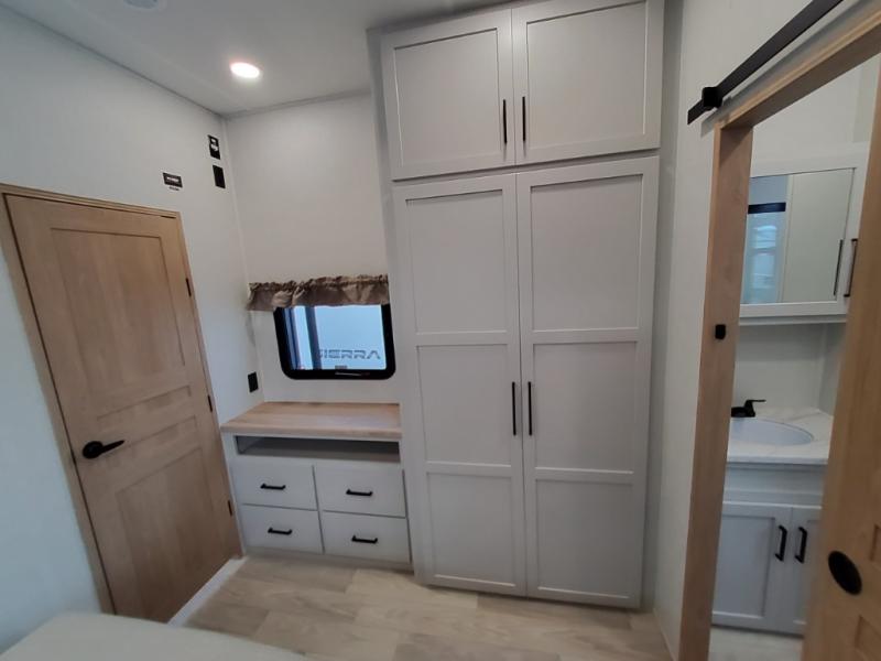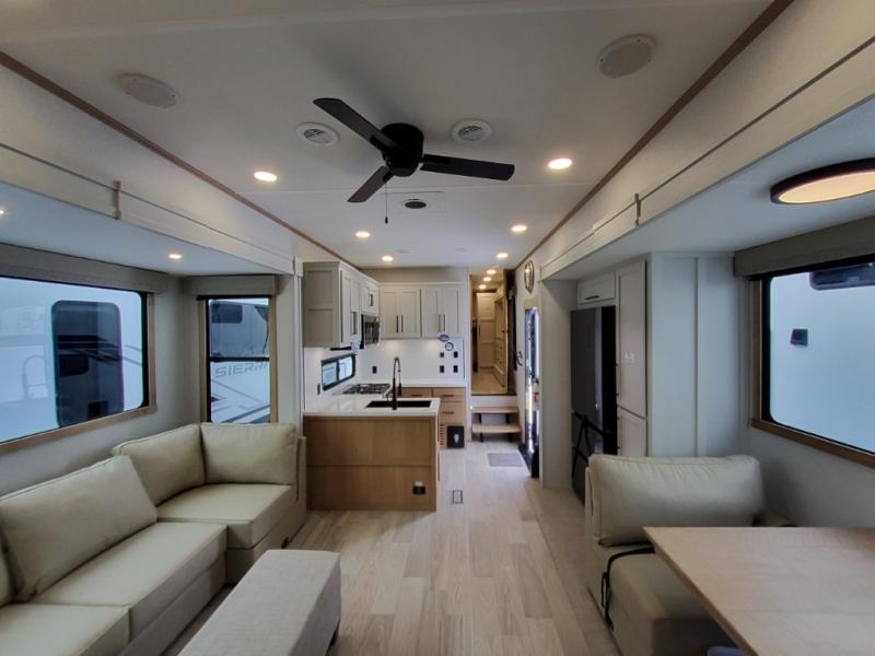 This Sierra fifth wheel is thoughtfully designed for comfort and convenience, starting with a spacious front bunkhouse perfect for accommodating guests. It features two flip-up bunks, 28" x 74" and 32" x 74" and a 60" x 74" fold-out lounge, along with a wardrobe, dresser, and additional storage to keep essentials organized. A nearby half bath adds easy access and extra convenience. At the center of the unit, the kitchen offers everything you need to prepare meals, including a stainless-steel sink, three-burner cooktop, and a generous 16 cu. ft. refrigerator. Meals can be enjoyed at the free-standing dinette, or you can unwind on the sectional sofa while enjoying the fireplace or entertainment center. At the rear, you'll find the private main bedroom with a roomy 66" x 80" RV king bed, plus its own wardrobe and dresser. Just steps away is the full bathroom featuring a one-piece fiberglass shower, sink with medicine cabinet, linen storage, and even washer/dryer prep for extended stays.