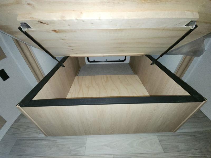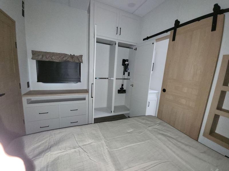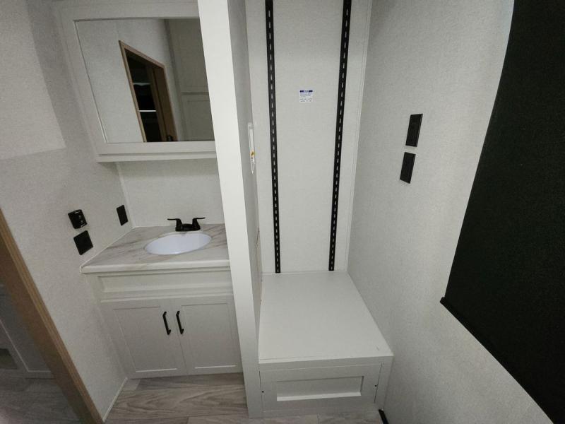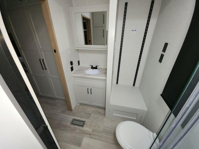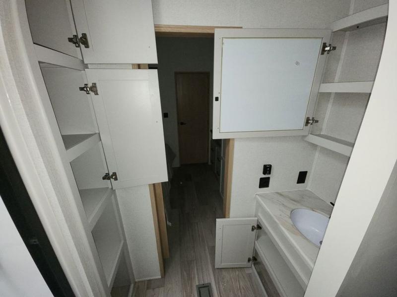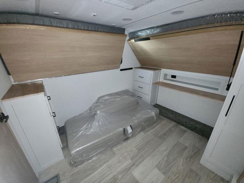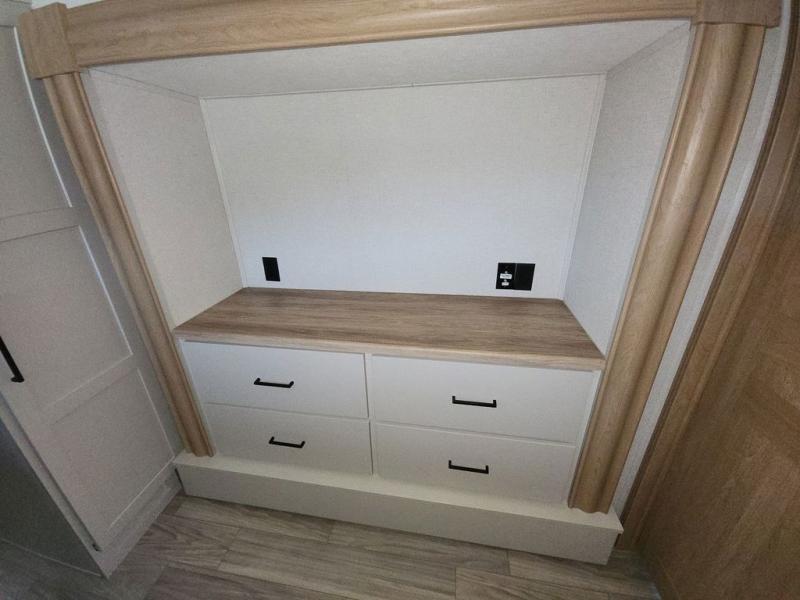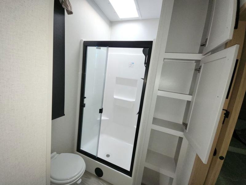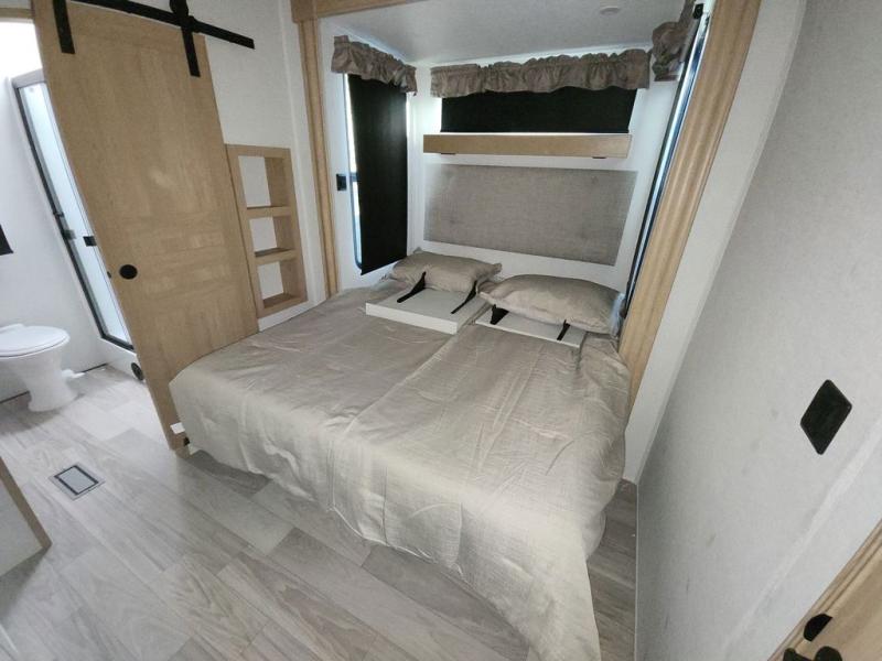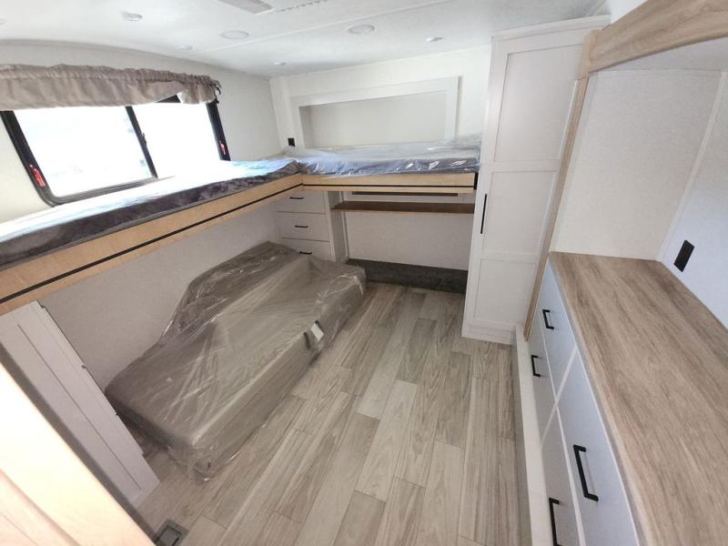 This Sierra fifth wheel is thoughtfully designed for comfort and convenience, starting with a spacious front bunkhouse perfect for accommodating guests. It features two flip-up bunks, 28" x 74" and 32" x 74" and a 60" x 74" fold-out lounge, along with a wardrobe, dresser, and additional storage to keep essentials organized. A nearby half bath adds easy access and extra convenience. At the center of the unit, the kitchen offers everything you need to prepare meals, including a stainless-steel sink, three-burner cooktop, and a generous 16 cu. ft. refrigerator. Meals can be enjoyed at the free-standing dinette, or you can unwind on the sectional sofa while enjoying the fireplace or entertainment center. At the rear, you'll find the private main bedroom with a roomy 66" x 80" RV king bed, plus its own wardrobe and dresser. Just steps away is the full bathroom featuring a one-piece fiberglass shower, sink with medicine cabinet, linen storage, and even washer/dryer prep for extended stays.