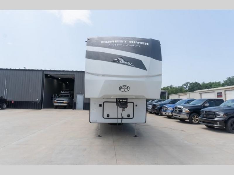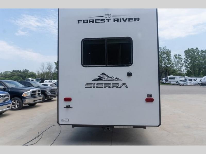 Each one of these Forest River Sierra fifth wheels are equipped with everything you need to make the most of each adventure! The underbelly armor will protect your unit's vitals from road debris and the painted two tone aerodynamic fiberglass front cap has an improved turning radius to make them easier to navigate. With an electric leveling system, you can set your unit up quick and easy then get to having fun faster than ever. The welded aluminum framed, vacuum bonded laminated superstructure will hold up through every adventure and the cambered powder coated frame comes with rust prohibitor to last longer. Each model also includes the Summit Package that comes with a king Wi-Fi extender system and Olympus antenna, a full coach water filter system, Goodyear tires with 7,000 lb. axles, and the list goes on. The interior is just as impressive with rustic wood plank linoleum, recessed residential lighting, a memory foam mattress, and mocha accent crown molding over the kitchen cabinets!