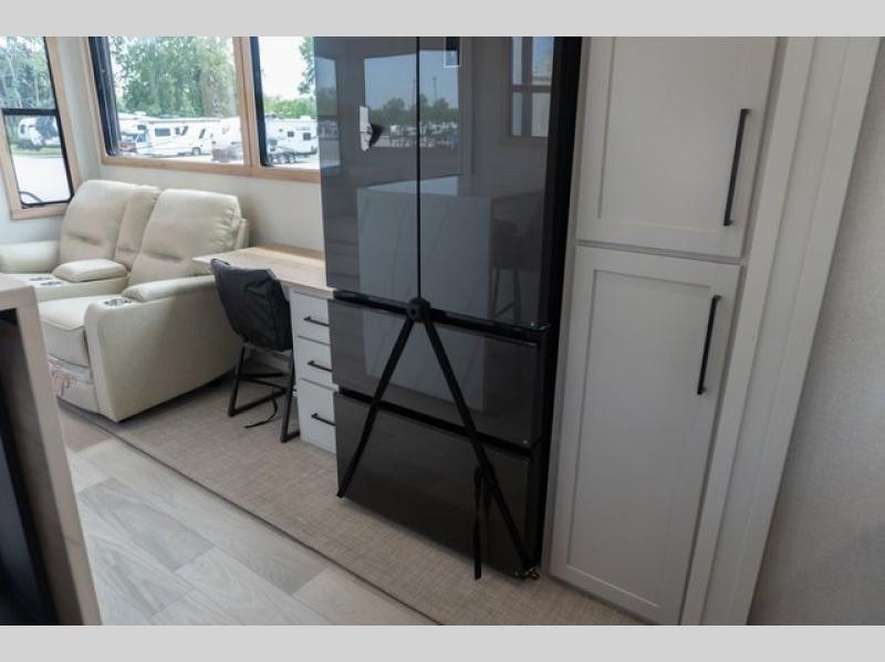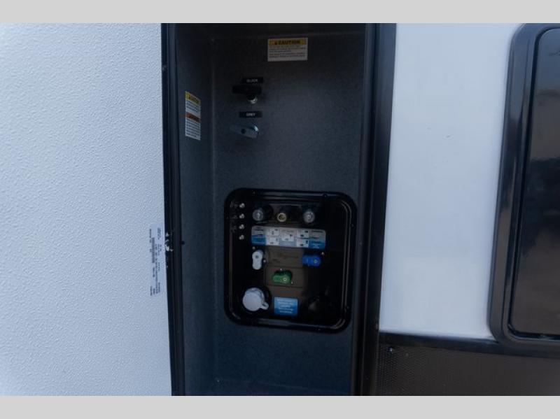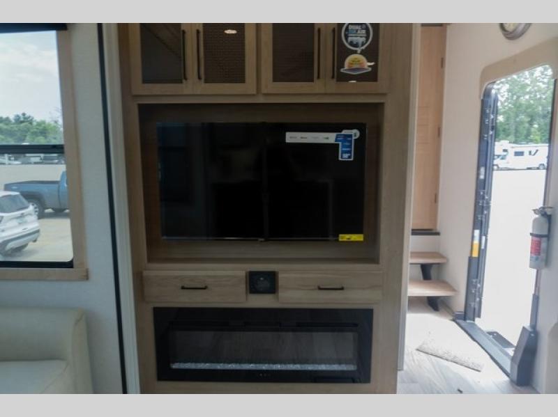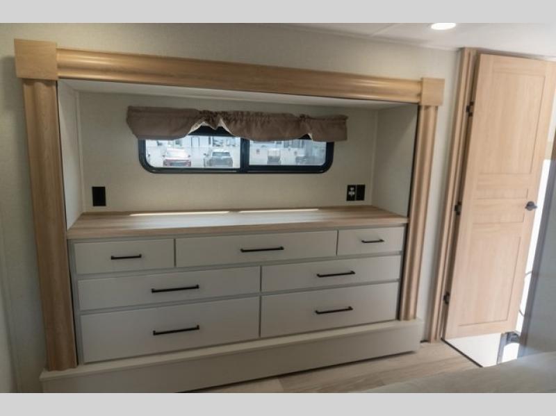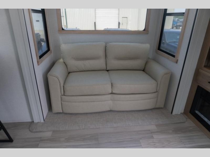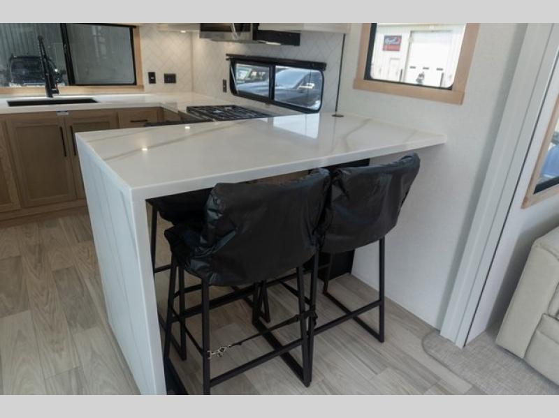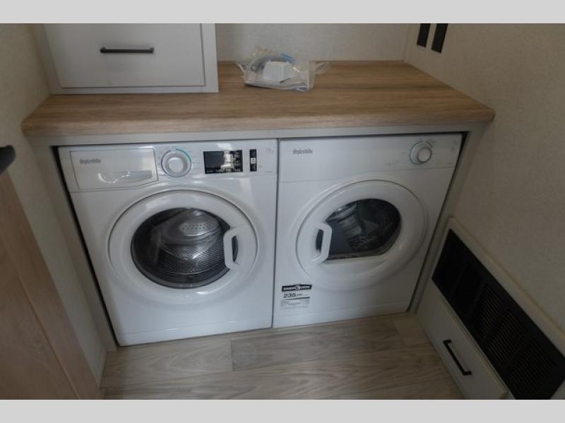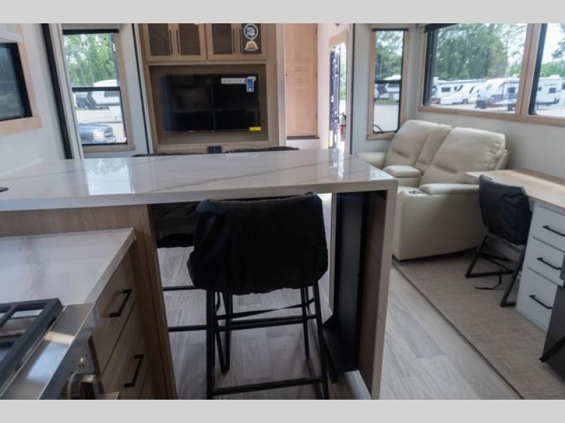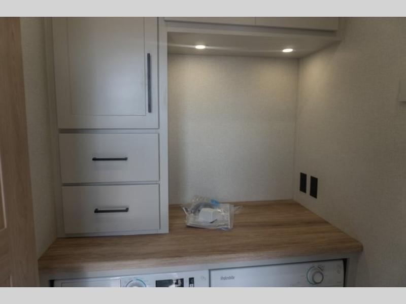 If you're looking to go full-time RVing, this fifth wheel is packed with convenient features! The master bedroom includes a king bed slide out with USB ports on either side of the bed so you both can charge your phones, and there is a dresser for your folded clothes. You will love the front bathroom with dual bath sinks, a shower with a seat, plus a walk-in closet with shelves, rods to hand clothes, and baskets for laundry! There is a unique middle utility room with washer and dryer, Washer and dryer counter and a rod to hang clothes that will make a perfect laundry room, or you can utilize this space for storage! Head to the main living area to relax on the theater seating or hide-a-bed sofa, and if you have guests stay over, they can sleep here. There is also an entertainment center with a 50" flat screen TV, but you might just leave that off if you're working at the desk with a chair that is provided. We've saved the best part for last; the kitchen! Here, you'll find ample counter space to prep home-cooked meals, a three burner high output range with a 22" oven, plus a large counter with barstools where you can enjoy breakfast at each morning. Choosing this fifth wheel is a no-brainer!