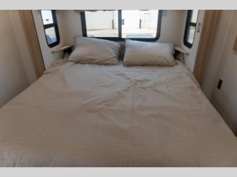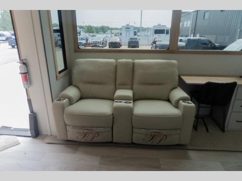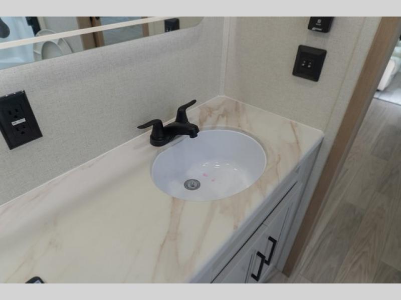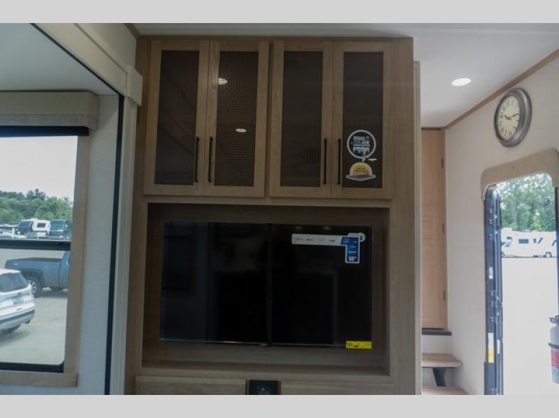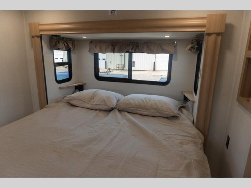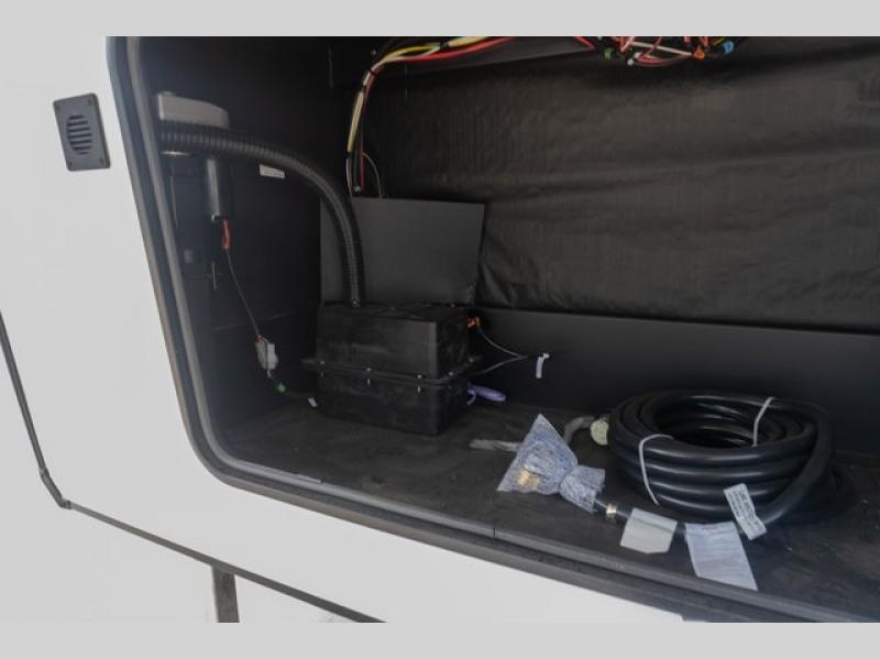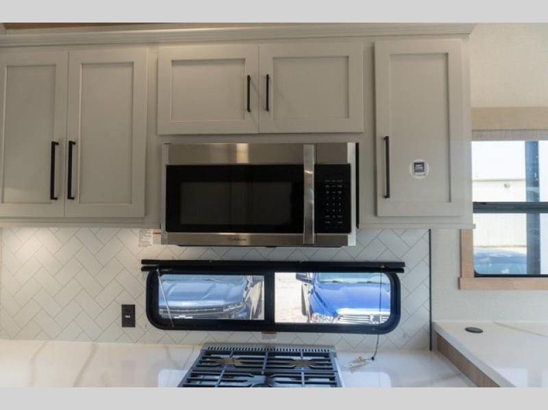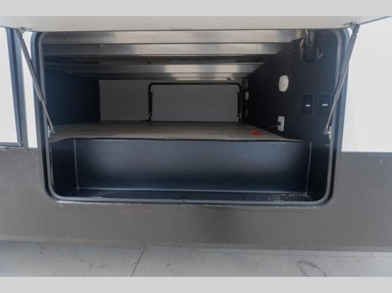 If you're looking to go full-time RVing, this fifth wheel is packed with convenient features! The master bedroom includes a king bed slide out with USB ports on either side of the bed so you both can charge your phones, and there is a dresser for your folded clothes. You will love the front bathroom with dual bath sinks, a shower with a seat, plus a walk-in closet with shelves, rods to hand clothes, and baskets for laundry! There is a unique middle utility room with washer and dryer, Washer and dryer counter and a rod to hang clothes that will make a perfect laundry room, or you can utilize this space for storage! Head to the main living area to relax on the theater seating or hide-a-bed sofa, and if you have guests stay over, they can sleep here. There is also an entertainment center with a 50" flat screen TV, but you might just leave that off if you're working at the desk with a chair that is provided. We've saved the best part for last; the kitchen! Here, you'll find ample counter space to prep home-cooked meals, a three burner high output range with a 22" oven, plus a large counter with barstools where you can enjoy breakfast at each morning. Choosing this fifth wheel is a no-brainer!