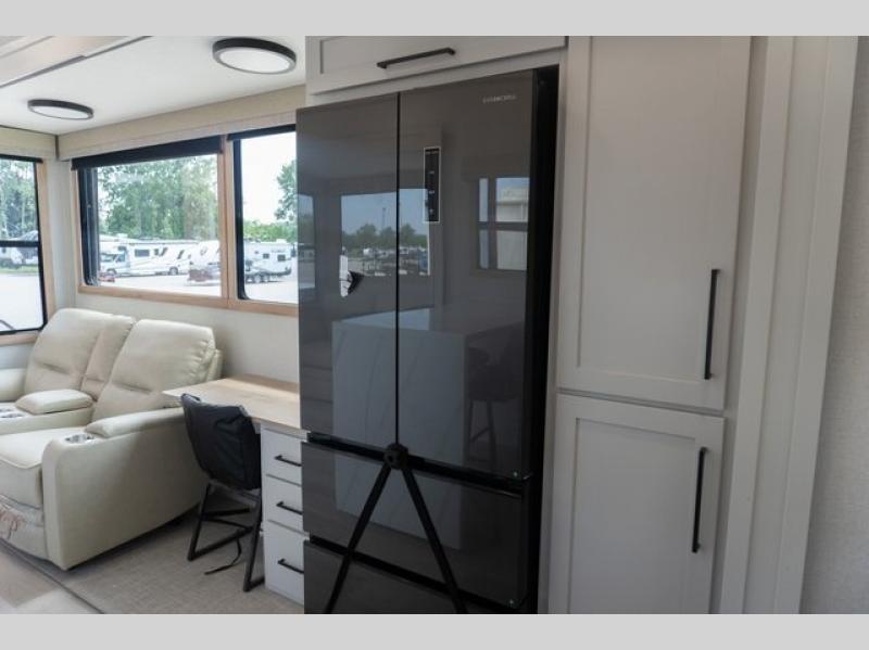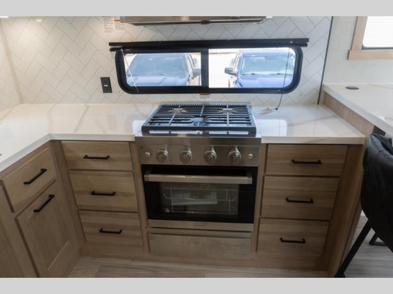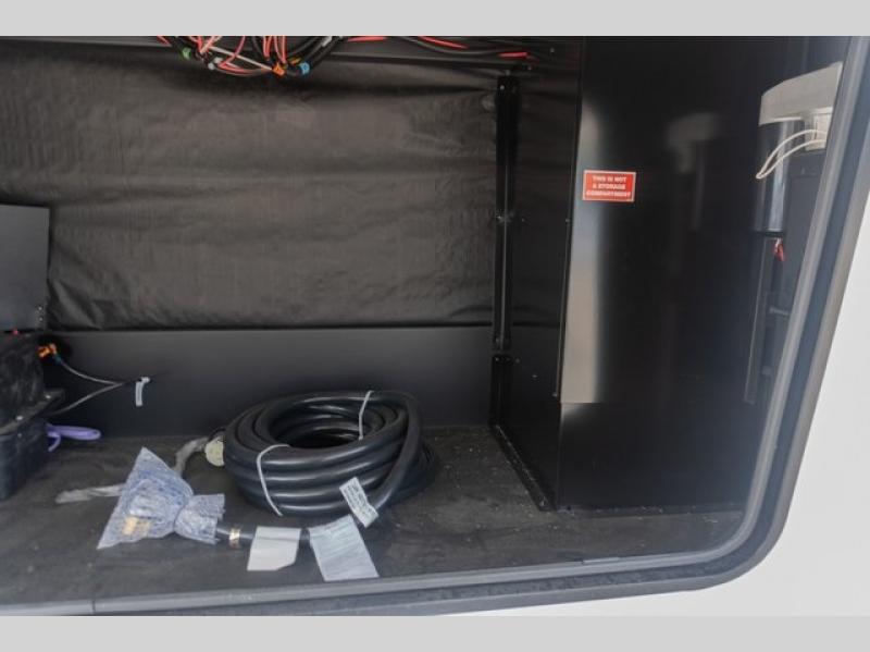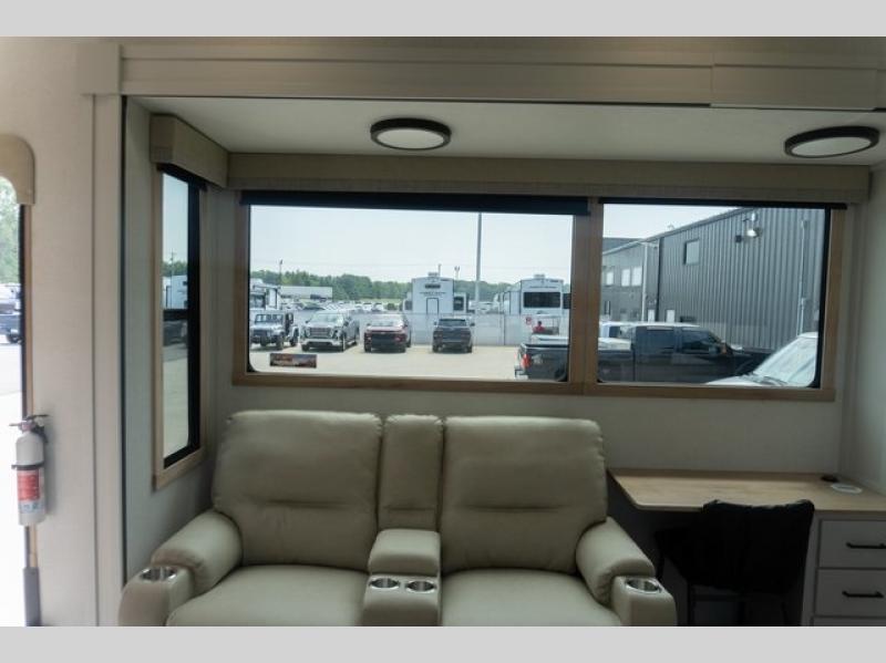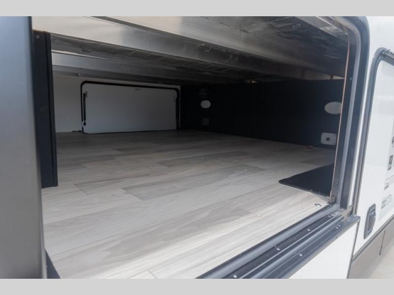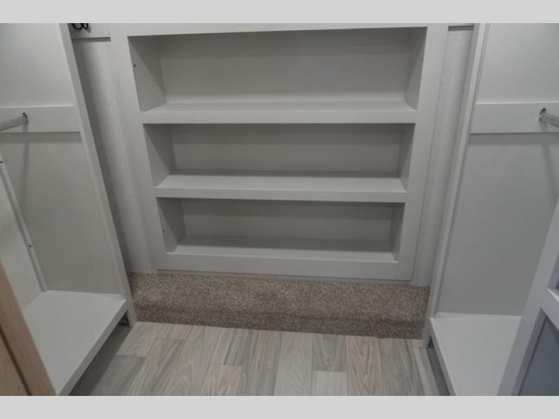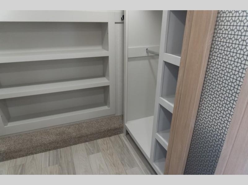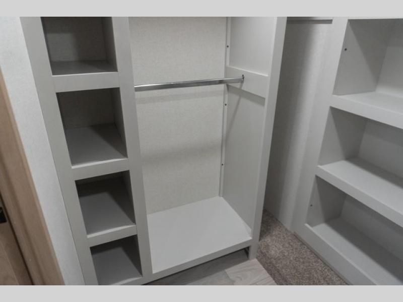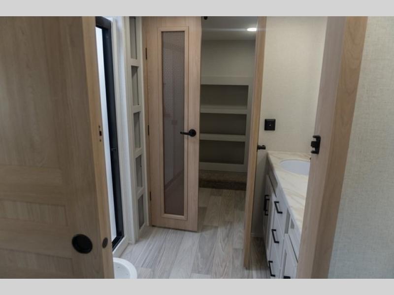 If you're looking to go full-time RVing, this fifth wheel is packed with convenient features! The master bedroom includes a king bed slide out with USB ports on either side of the bed so you both can charge your phones, and there is a dresser for your folded clothes. You will love the front bathroom with dual bath sinks, a shower with a seat, plus a walk-in closet with shelves, rods to hand clothes, and baskets for laundry! There is a unique middle utility room with washer and dryer, Washer and dryer counter and a rod to hang clothes that will make a perfect laundry room, or you can utilize this space for storage! Head to the main living area to relax on the theater seating or hide-a-bed sofa, and if you have guests stay over, they can sleep here. There is also an entertainment center with a 50" flat screen TV, but you might just leave that off if you're working at the desk with a chair that is provided. We've saved the best part for last; the kitchen! Here, you'll find ample counter space to prep home-cooked meals, a three burner high output range with a 22" oven, plus a large counter with barstools where you can enjoy breakfast at each morning. Choosing this fifth wheel is a no-brainer!