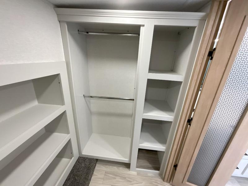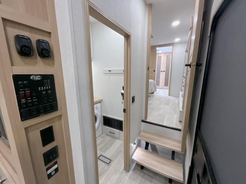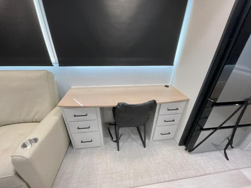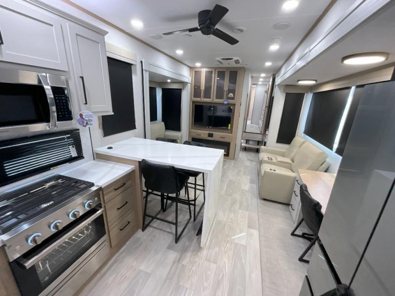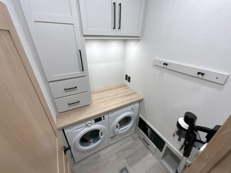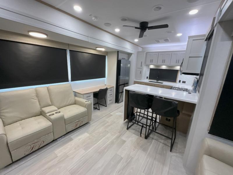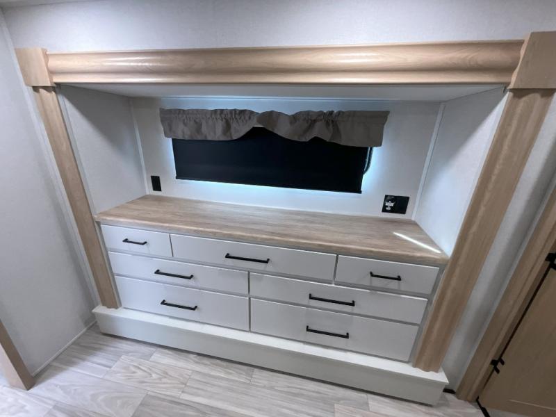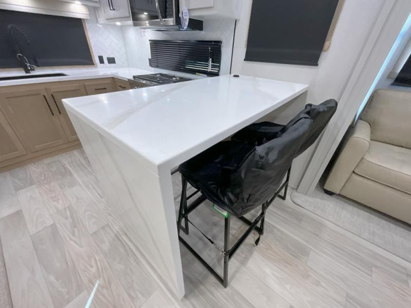 If you're looking to go full-time RVing, this fifth wheel is packed with convenient features! The master bedroom includes a king bed slide out with USB ports on either side of the bed so you both can charge your phones, and there is a dresser for your folded clothes. You will love the front bathroom with dual bath sinks, a shower with a seat, plus a walk-in closet with shelves, rods to hand clothes, and baskets for laundry! There is a unique middle utility room with washer and dryer, Washer and dryer counter and a rod to hang clothes that will make a perfect laundry room, or you can utilize this space for storage! Head to the main living area to relax on the theater seating or hide-a-bed sofa, and if you have guests stay over, they can sleep here. There is also an entertainment center with a 50" flat screen TV, but you might just leave that off if you're working at the desk with a chair that is provided. We've saved the best part for last; the kitchen! Here, you'll find ample counter space to prep home-cooked meals, a three burner high output range with a 22" oven, plus a large counter with barstools where you can enjoy breakfast at each morning. Choosing this fifth wheel is a no-brainer!