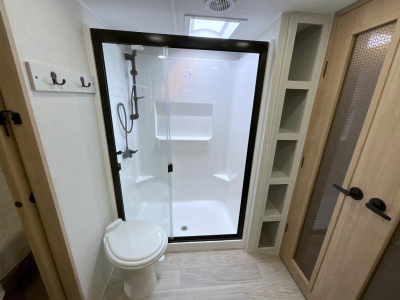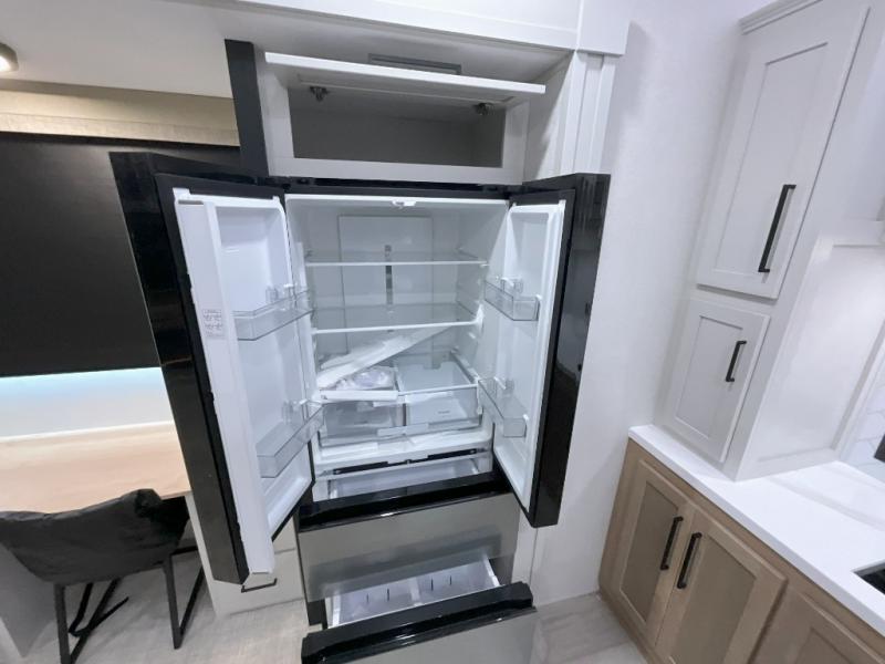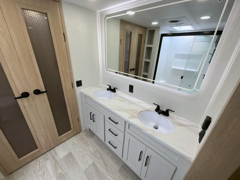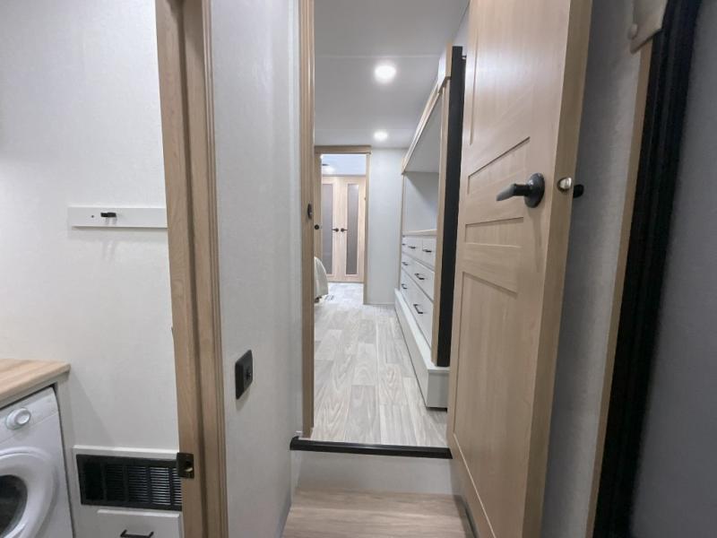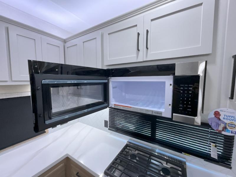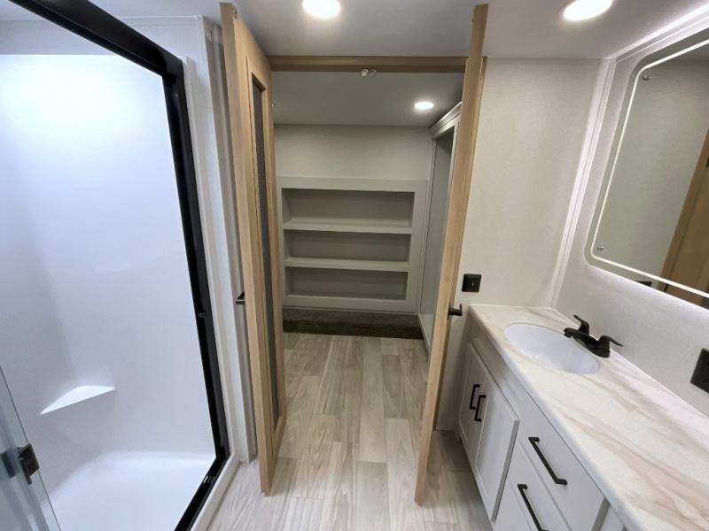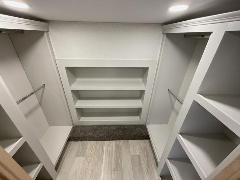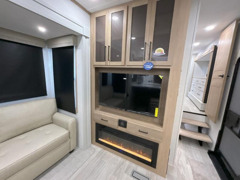 If you're looking to go full-time RVing, this fifth wheel is packed with convenient features! The master bedroom includes a king bed slide out with USB ports on either side of the bed so you both can charge your phones, and there is a dresser for your folded clothes. You will love the front bathroom with dual bath sinks, a shower with a seat, plus a walk-in closet with shelves, rods to hand clothes, and baskets for laundry! There is a unique middle utility room with washer and dryer, Washer and dryer counter and a rod to hang clothes that will make a perfect laundry room, or you can utilize this space for storage! Head to the main living area to relax on the theater seating or hide-a-bed sofa, and if you have guests stay over, they can sleep here. There is also an entertainment center with a 50" flat screen TV, but you might just leave that off if you're working at the desk with a chair that is provided. We've saved the best part for last; the kitchen! Here, you'll find ample counter space to prep home-cooked meals, a three burner high output range with a 22" oven, plus a large counter with barstools where you can enjoy breakfast at each morning. Choosing this fifth wheel is a no-brainer!
