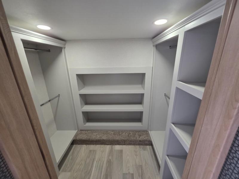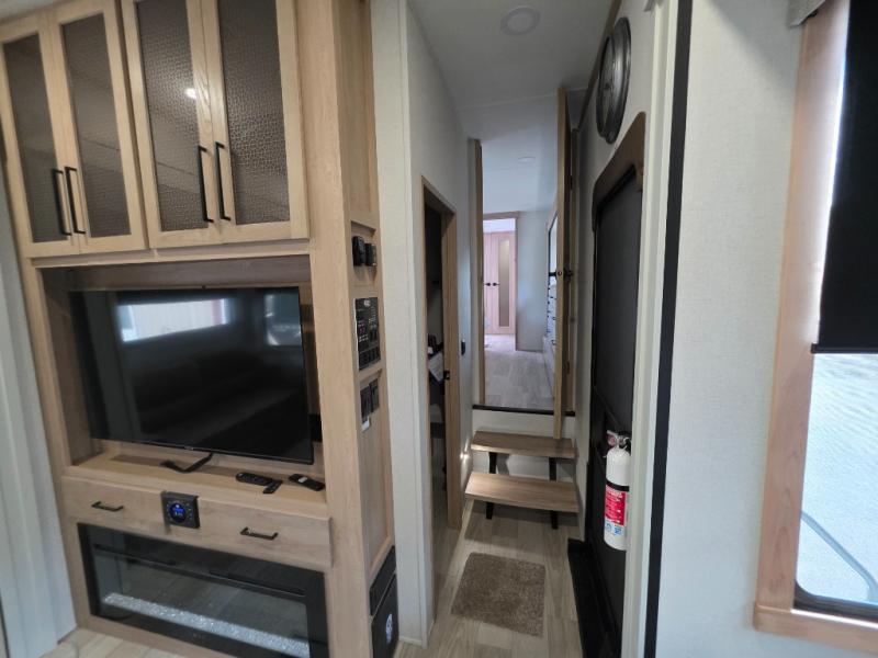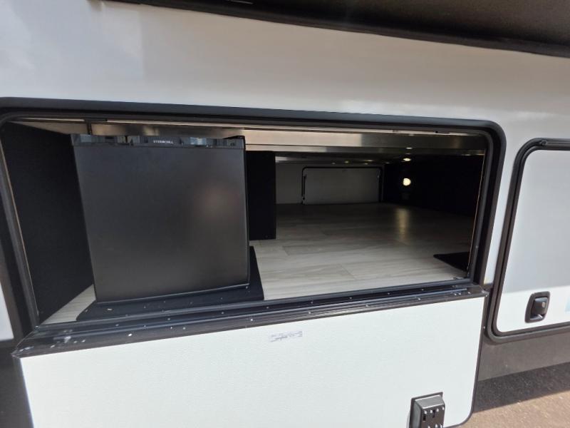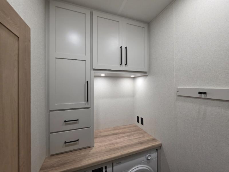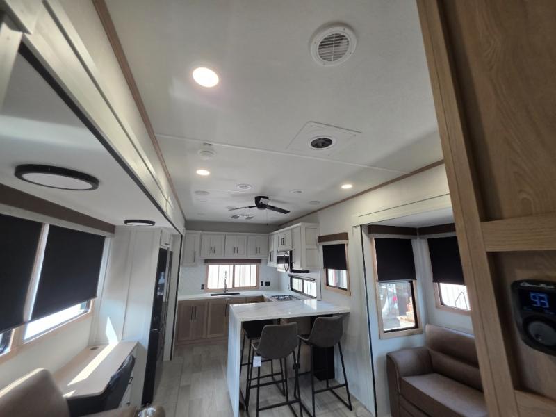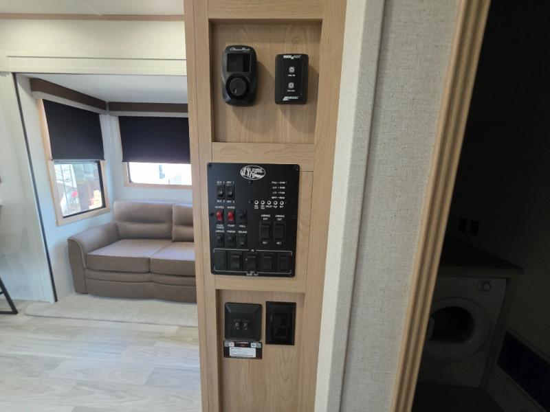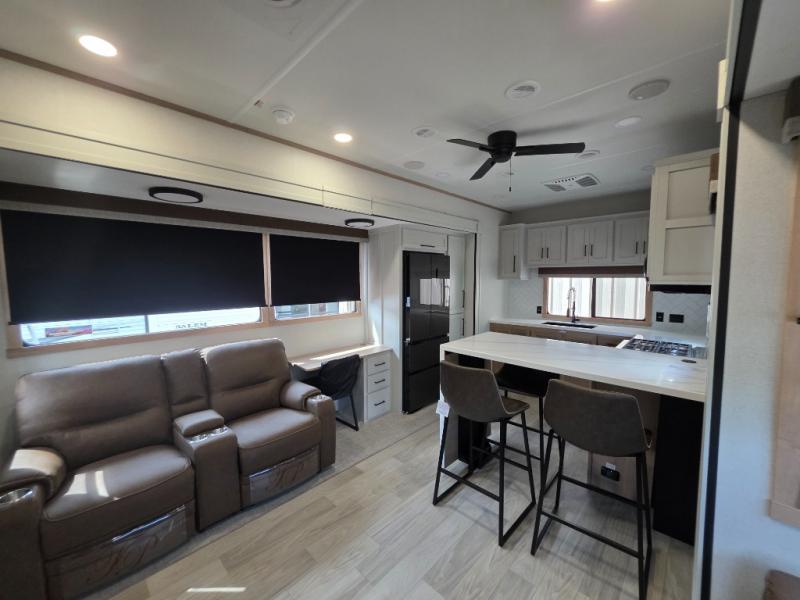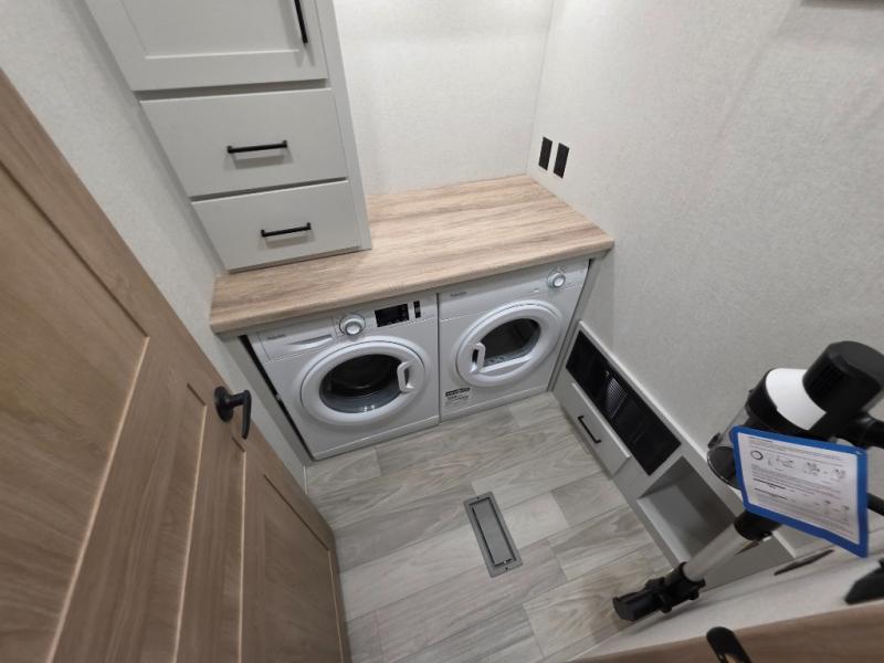 If you're looking to go full-time RVing, this fifth wheel is packed with convenient features! The master bedroom includes a king bed slide out with USB ports on either side of the bed so you both can charge your phones, and there is a dresser for your folded clothes. You will love the front bathroom with dual bath sinks, a shower with a seat, plus a walk-in closet with shelves, rods to hand clothes, and baskets for laundry! There is a unique middle utility room with washer and dryer, Washer and dryer counter and a rod to hang clothes that will make a perfect laundry room, or you can utilize this space for storage! Head to the main living area to relax on the theater seating or hide-a-bed sofa, and if you have guests stay over, they can sleep here. There is also an entertainment center with a 50" flat screen TV, but you might just leave that off if you're working at the desk with a chair that is provided. We've saved the best part for last; the kitchen! Here, you'll find ample counter space to prep home-cooked meals, a three burner high output range with a 22" oven, plus a large counter with barstools where you can enjoy breakfast at each morning. Choosing this fifth wheel is a no-brainer!