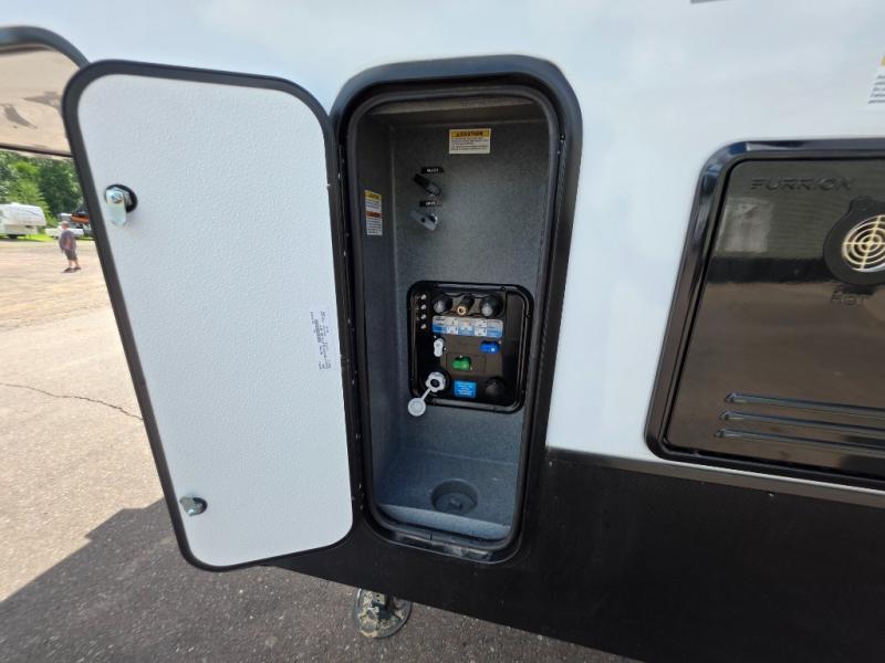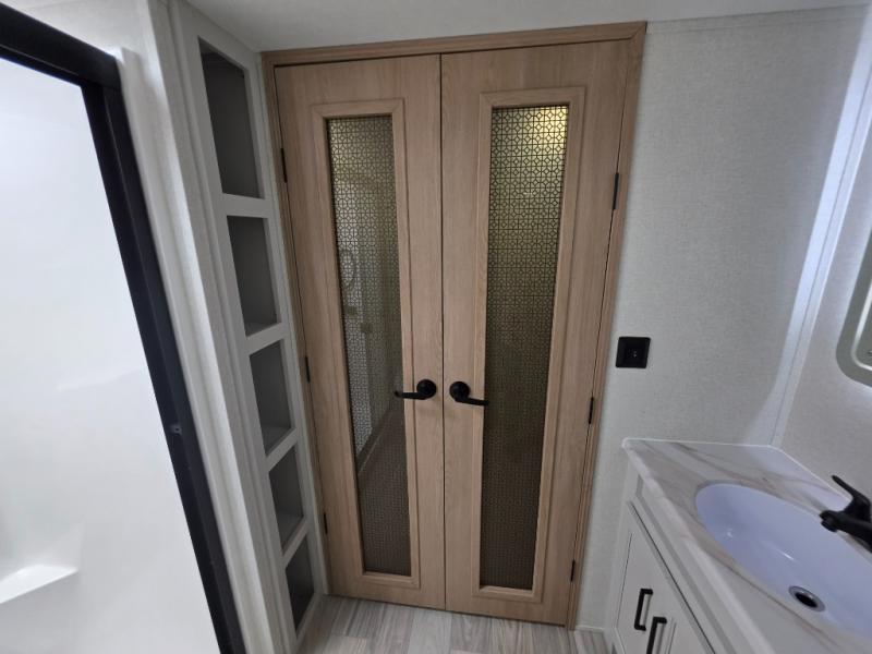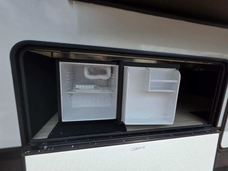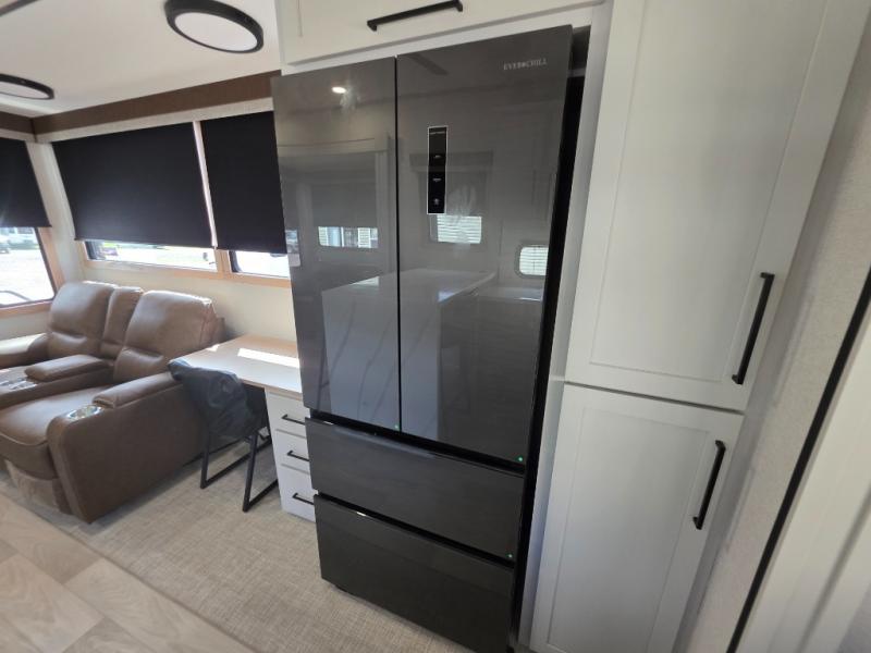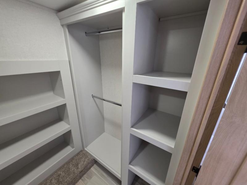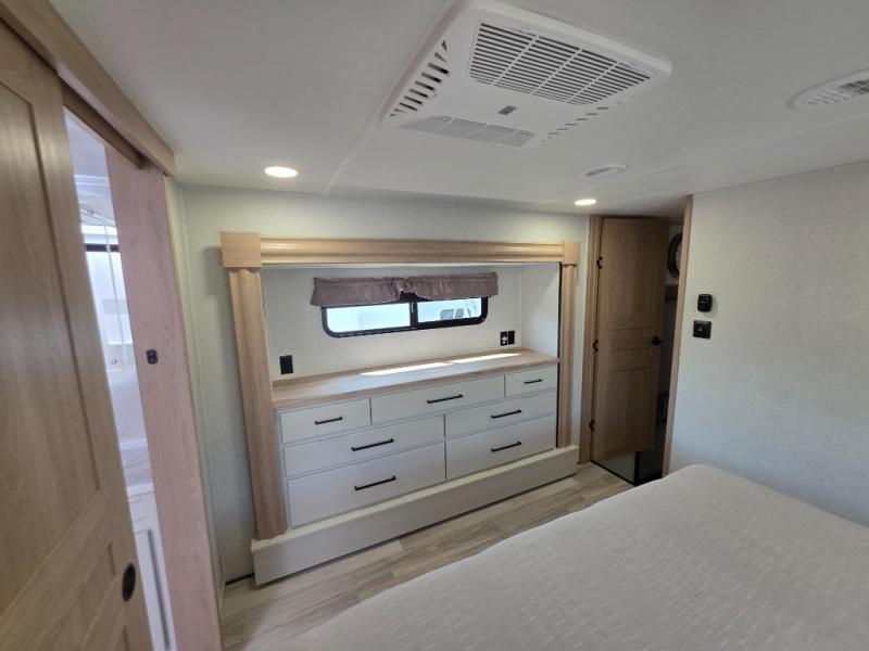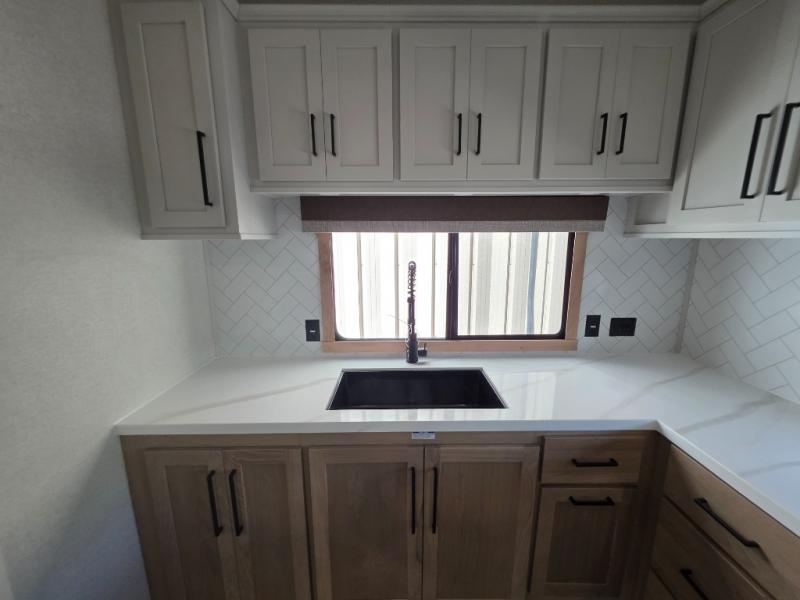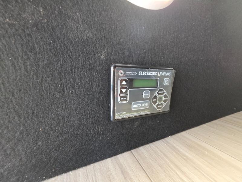 If you're looking to go full-time RVing, this fifth wheel is packed with convenient features! The master bedroom includes a king bed slide out with USB ports on either side of the bed so you both can charge your phones, and there is a dresser for your folded clothes. You will love the front bathroom with dual bath sinks, a shower with a seat, plus a walk-in closet with shelves, rods to hand clothes, and baskets for laundry! There is a unique middle utility room with washer and dryer, Washer and dryer counter and a rod to hang clothes that will make a perfect laundry room, or you can utilize this space for storage! Head to the main living area to relax on the theater seating or hide-a-bed sofa, and if you have guests stay over, they can sleep here. There is also an entertainment center with a 50" flat screen TV, but you might just leave that off if you're working at the desk with a chair that is provided. We've saved the best part for last; the kitchen! Here, you'll find ample counter space to prep home-cooked meals, a three burner high output range with a 22" oven, plus a large counter with barstools where you can enjoy breakfast at each morning. Choosing this fifth wheel is a no-brainer!