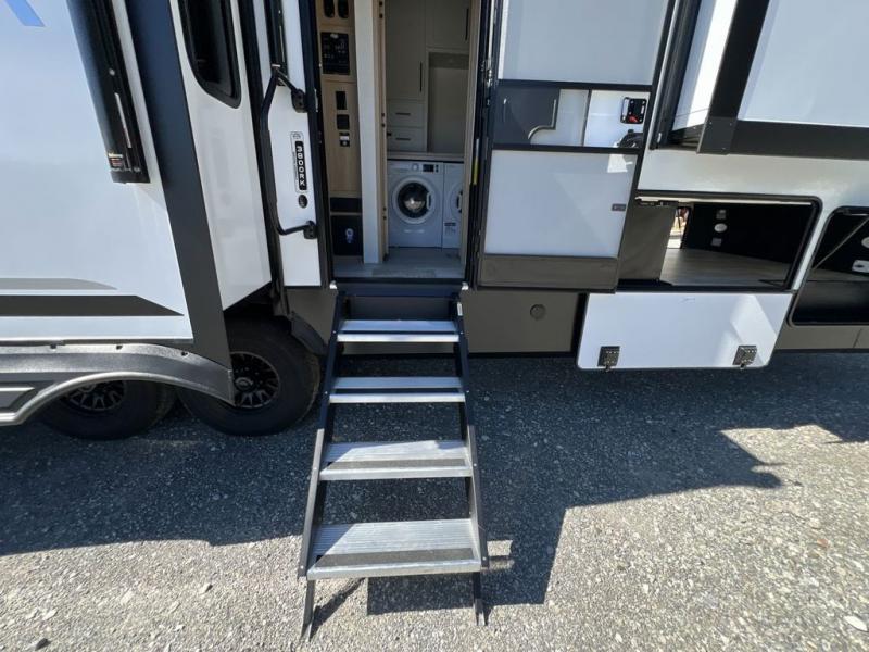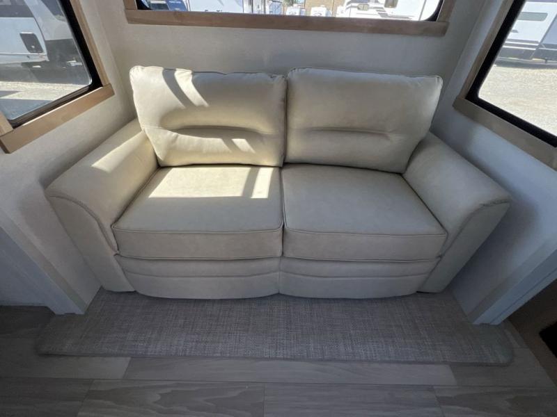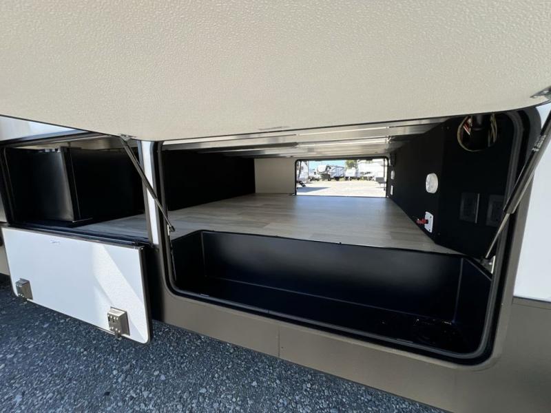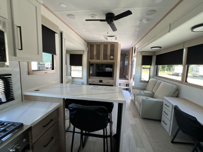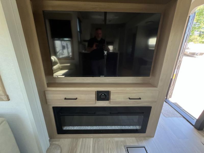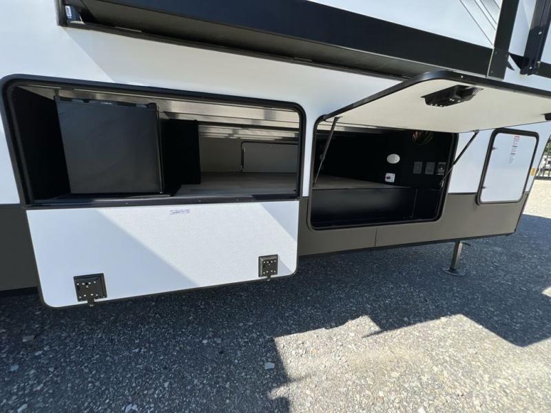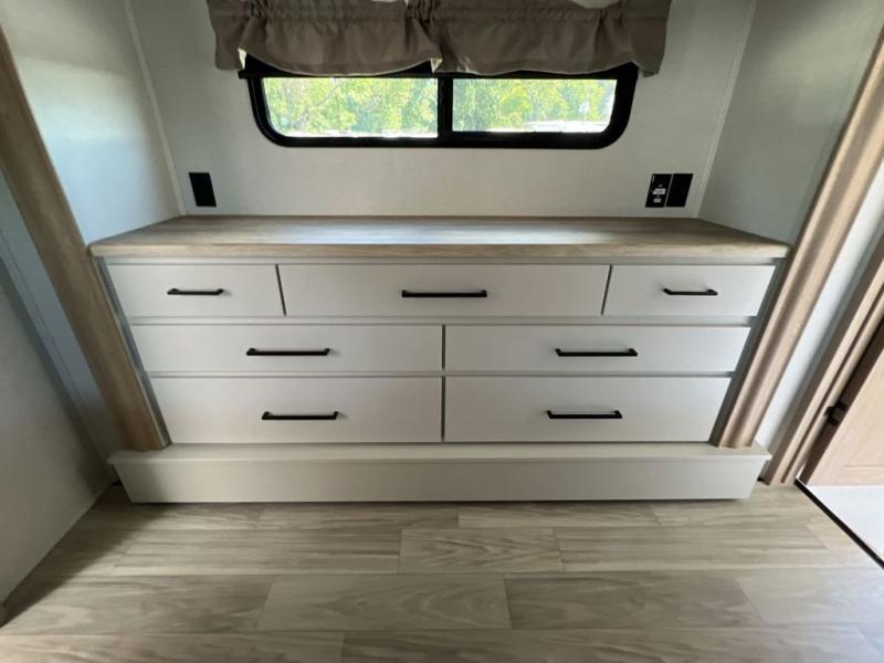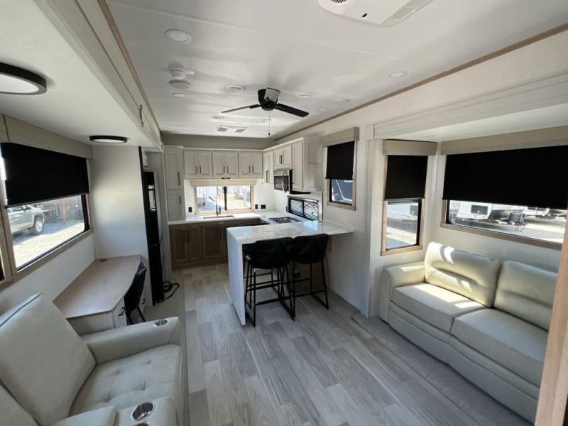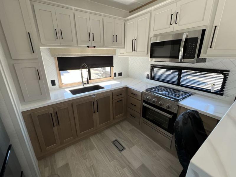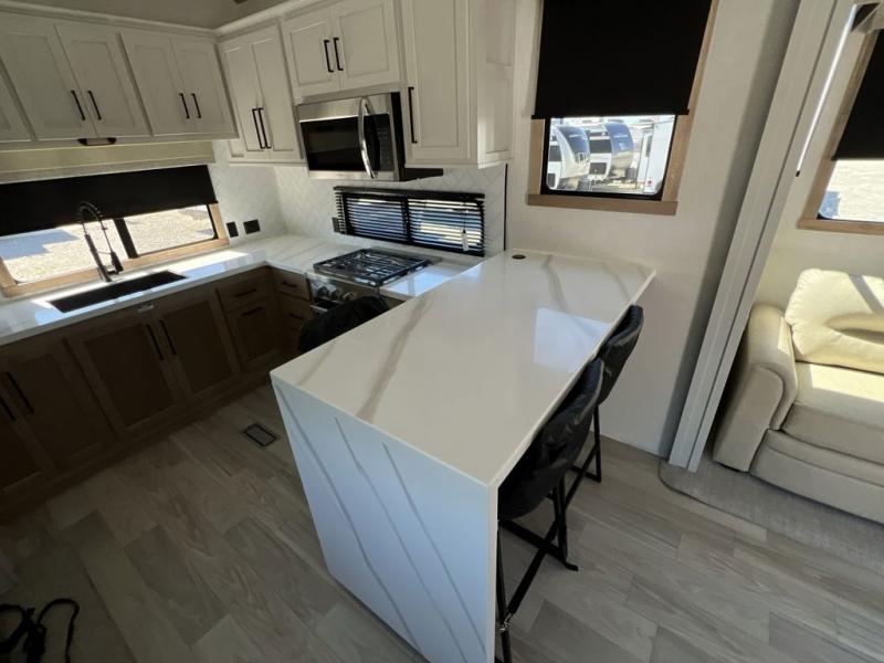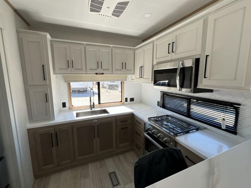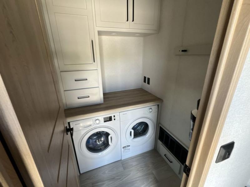If you're looking to go full-time RVing, this fifth wheel is packed with convenient features! The master bedroom includes a king bed slide out with USB ports on either side of the bed so you both can charge your phones, and there is a dresser for your folded clothes. You will love the front bathroom with dual bath sinks, a shower with a seat, plus a walk-in closet with shelves, rods to hand clothes, and baskets for laundry! There is a unique middle utility room with washer and dryer, Washer and dryer counter and a rod to hang clothes that will make a perfect laundry room, or you can utilize this space for storage! Head to the main living area to relax on the theater seating or hide-a-bed sofa, and if you have guests stay over, they can sleep here. There is also an entertainment center with a 50" flat screen TV, but you might just leave that off if you're working at the desk with a chair that is provided. We've saved the best part for last; the kitchen! Here, you'll find ample counter space to prep home-cooked meals, a three burner high output range with a 22" oven, plus a large counter with barstools where you can enjoy breakfast at each morning. Choosing this fifth wheel is a no-brainer!