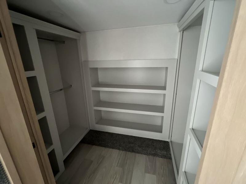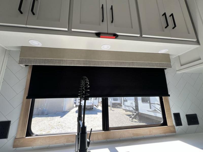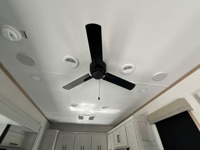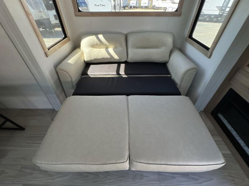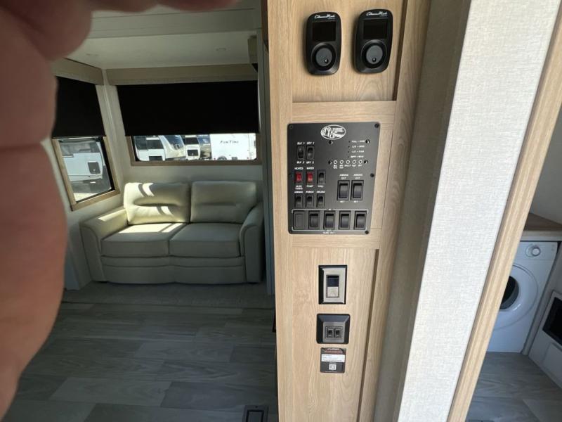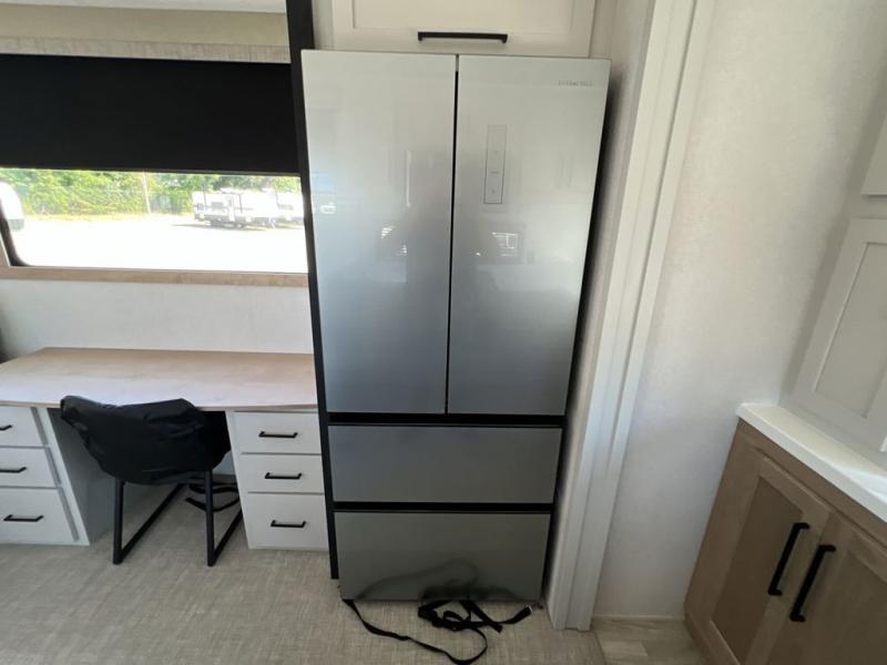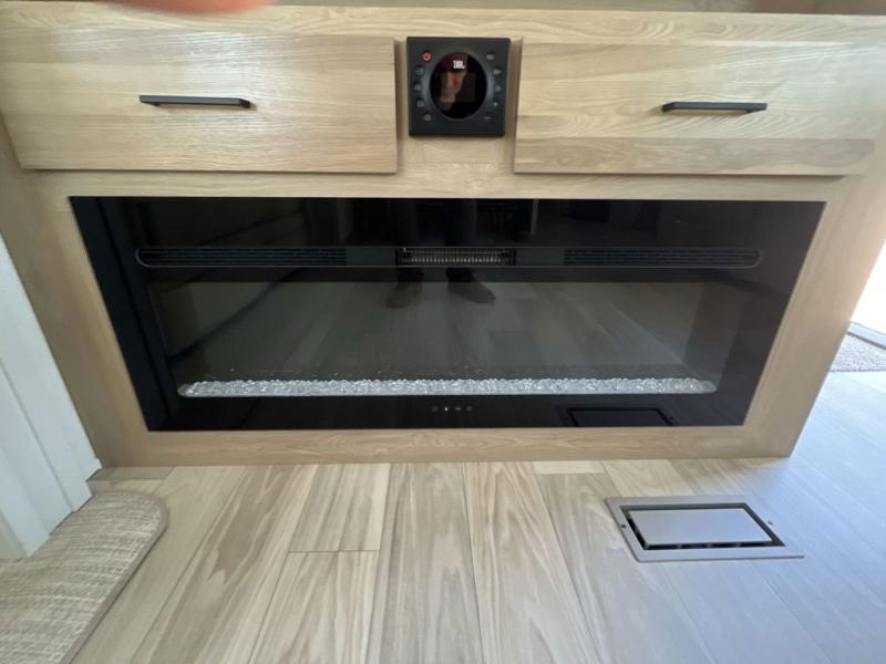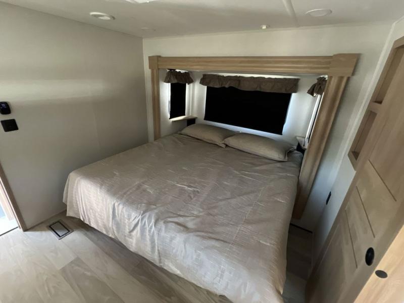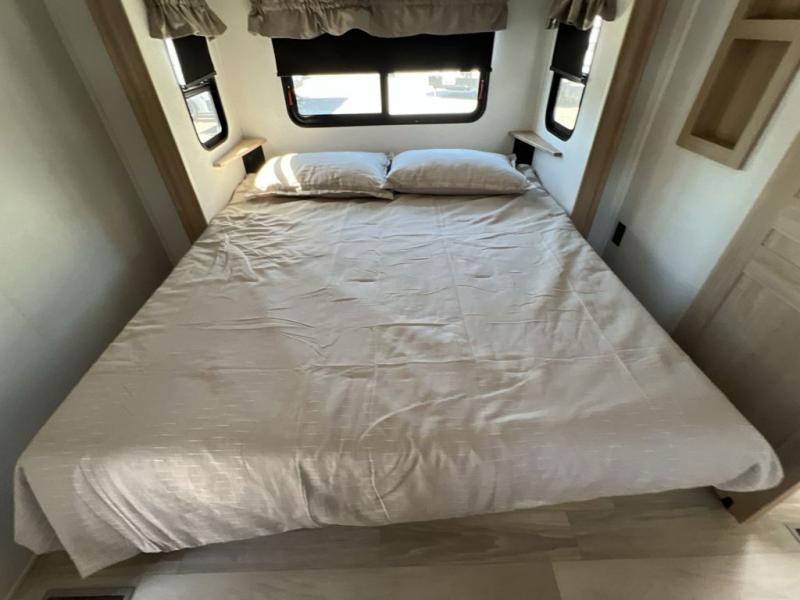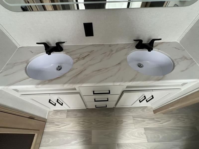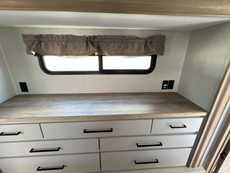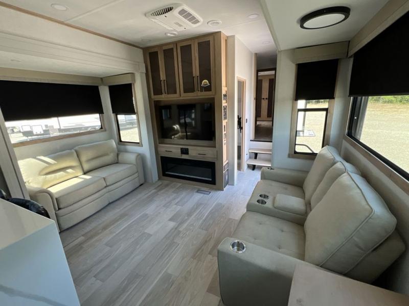If you're looking to go full-time RVing, this fifth wheel is packed with convenient features! The master bedroom includes a king bed slide out with USB ports on either side of the bed so you both can charge your phones, and there is a dresser for your folded clothes. You will love the front bathroom with dual bath sinks, a shower with a seat, plus a walk-in closet with shelves, rods to hand clothes, and baskets for laundry! There is a unique middle utility room with washer and dryer, Washer and dryer counter and a rod to hang clothes that will make a perfect laundry room, or you can utilize this space for storage! Head to the main living area to relax on the theater seating or hide-a-bed sofa, and if you have guests stay over, they can sleep here. There is also an entertainment center with a 50" flat screen TV, but you might just leave that off if you're working at the desk with a chair that is provided. We've saved the best part for last; the kitchen! Here, you'll find ample counter space to prep home-cooked meals, a three burner high output range with a 22" oven, plus a large counter with barstools where you can enjoy breakfast at each morning. Choosing this fifth wheel is a no-brainer!