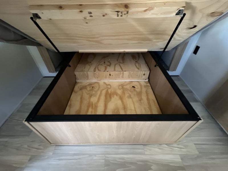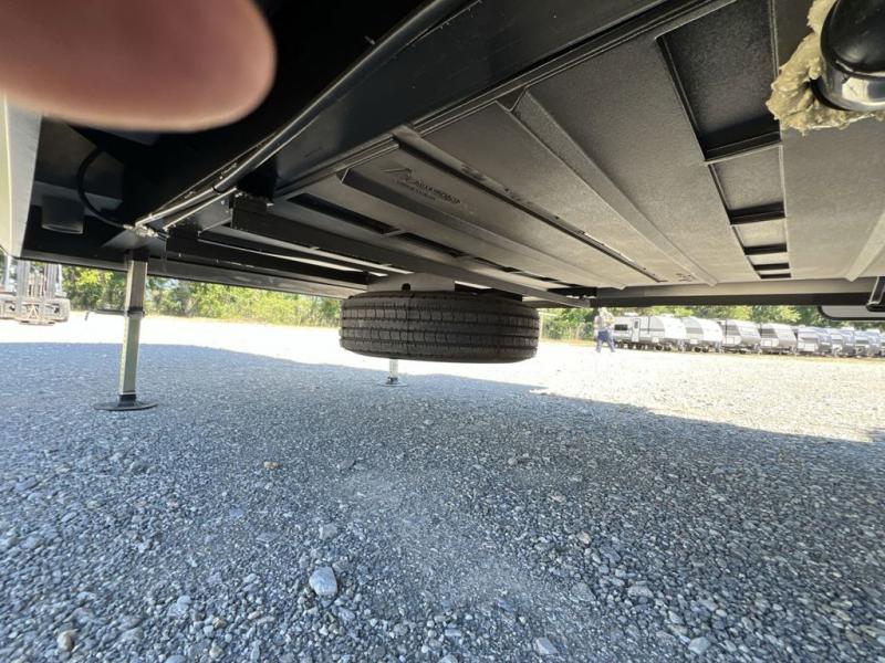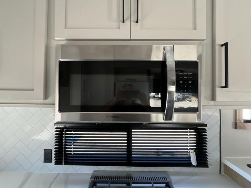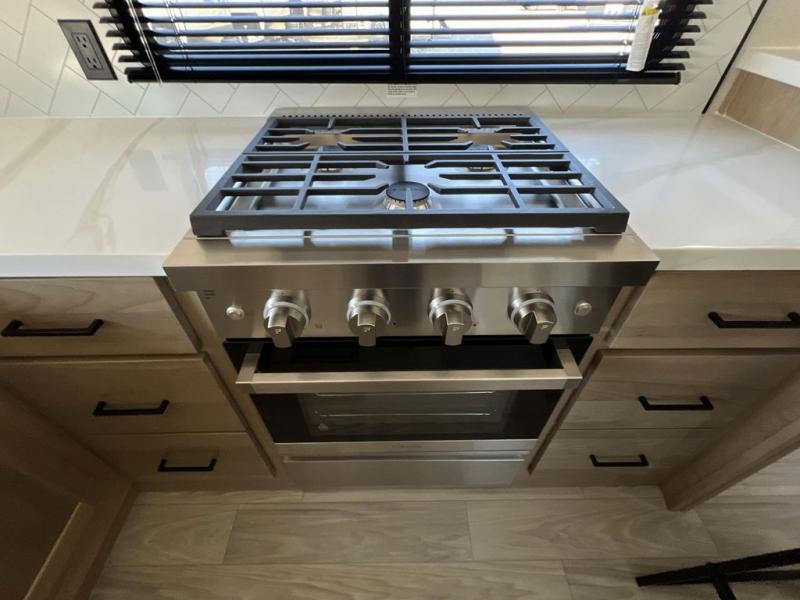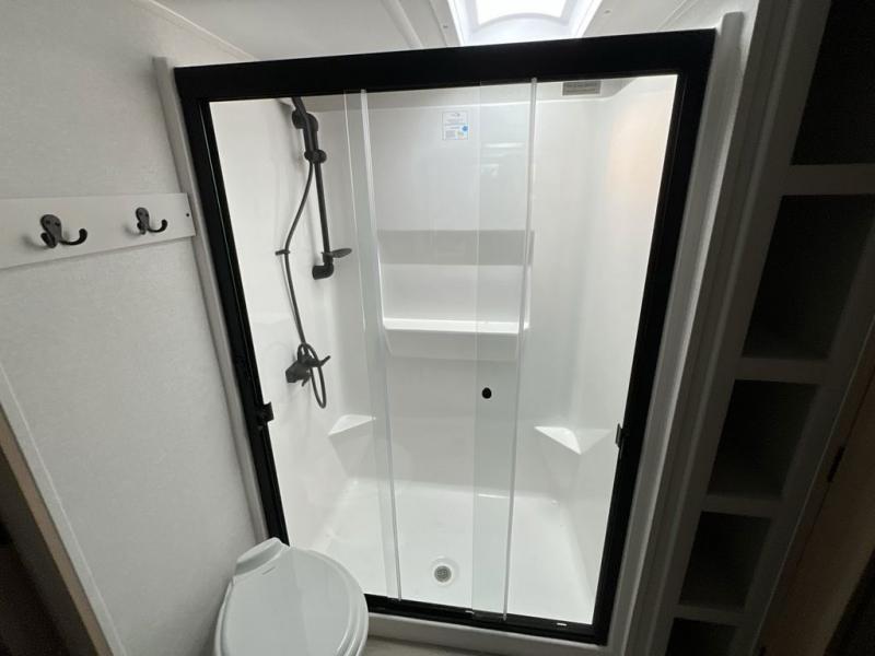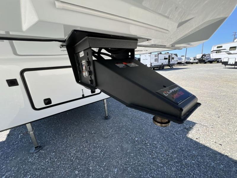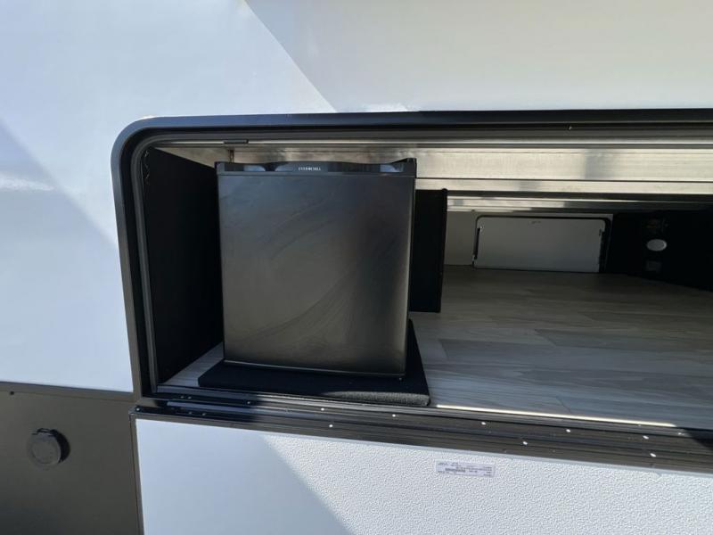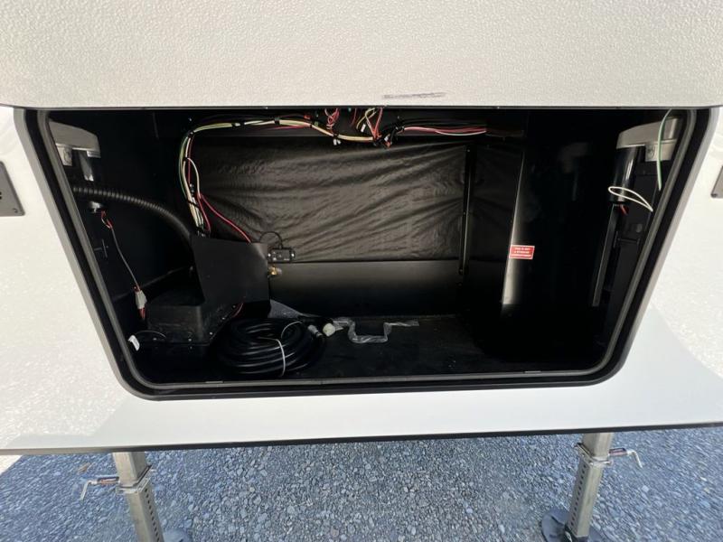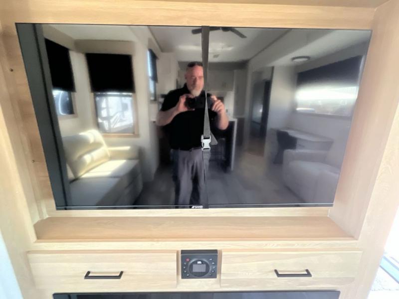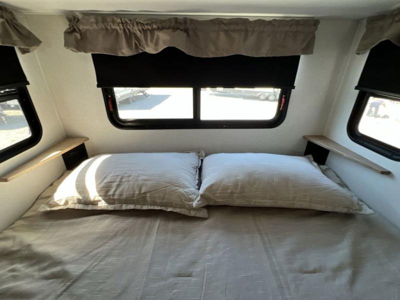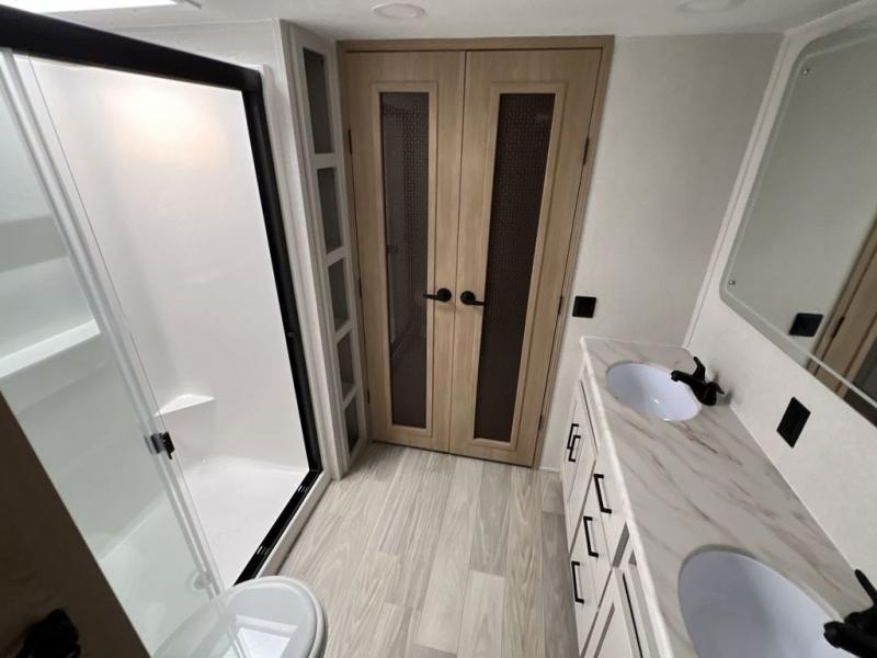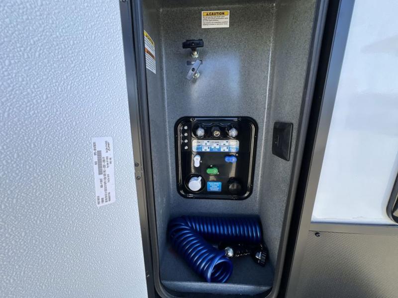 If you're looking to go full-time RVing, this fifth wheel is packed with convenient features! The master bedroom includes a king bed slide out with USB ports on either side of the bed so you both can charge your phones, and there is a dresser for your folded clothes. You will love the front bathroom with dual bath sinks, a shower with a seat, plus a walk-in closet with shelves, rods to hand clothes, and baskets for laundry! There is a unique middle utility room with washer and dryer, Washer and dryer counter and a rod to hang clothes that will make a perfect laundry room, or you can utilize this space for storage! Head to the main living area to relax on the theater seating or hide-a-bed sofa, and if you have guests stay over, they can sleep here. There is also an entertainment center with a 50" flat screen TV, but you might just leave that off if you're working at the desk with a chair that is provided. We've saved the best part for last; the kitchen! Here, you'll find ample counter space to prep home-cooked meals, a three burner high output range with a 22" oven, plus a large counter with barstools where you can enjoy breakfast at each morning. Choosing this fifth wheel is a no-brainer!